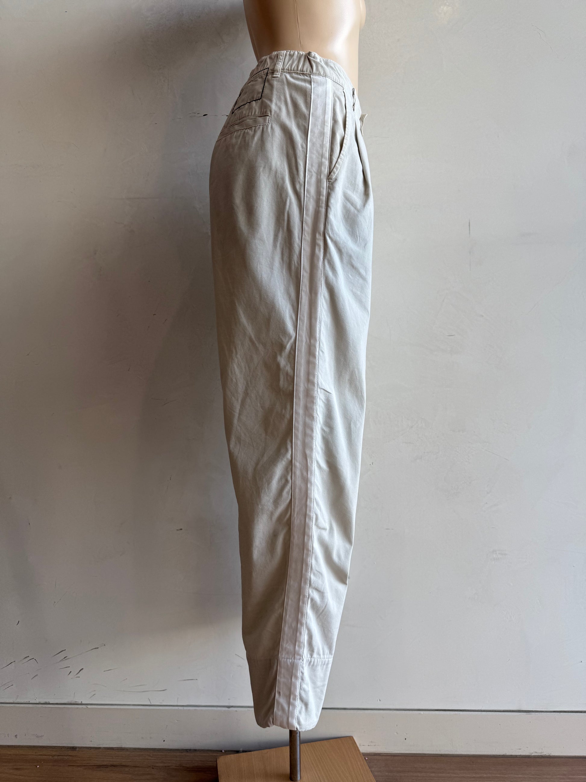 Bassike beige pants with white stripe on the sides. Has two front pockets and two back pockets. Please note slight discolouration on the back knee.