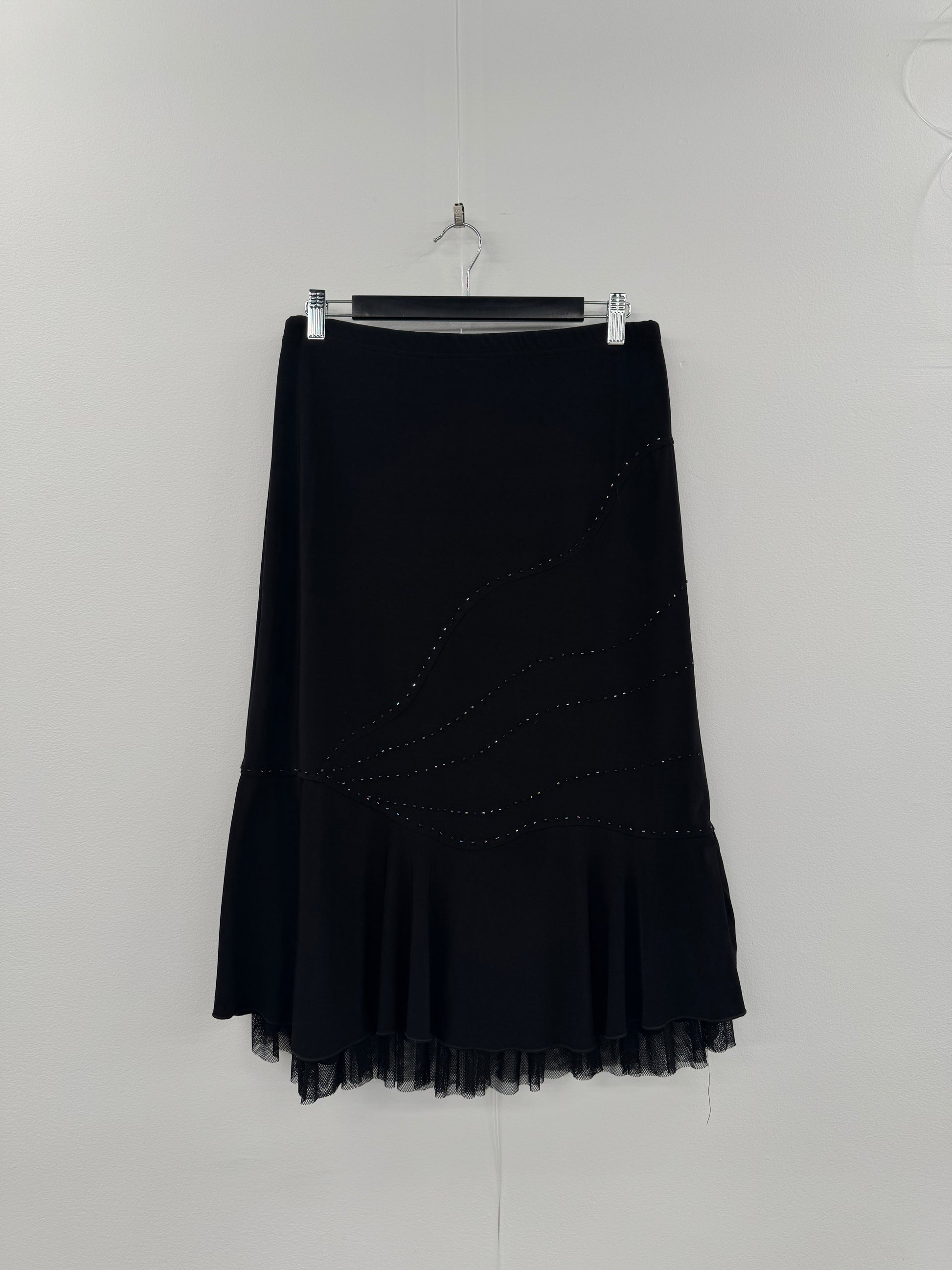 Features slightly asymmetrical bottom hem with built-in mesh underskirt as pictured. Elastic waistband and stretch material. Some beading coming loose on the front as pictured in side two, though very minor and still in great preloved condition.