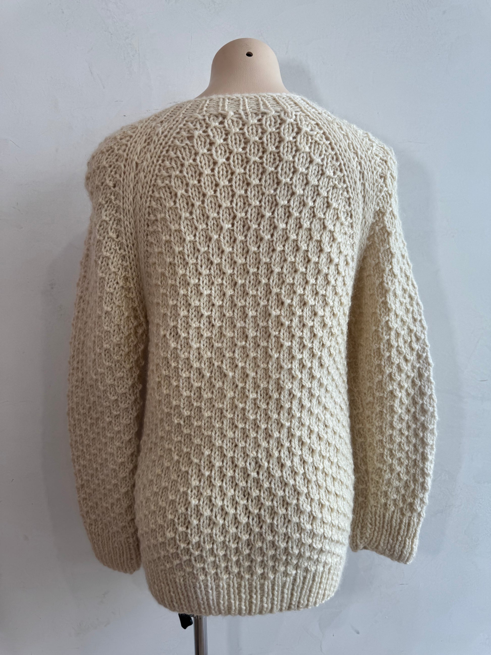 Chunky home made knit long cardigan featuring brown wooden buttons.