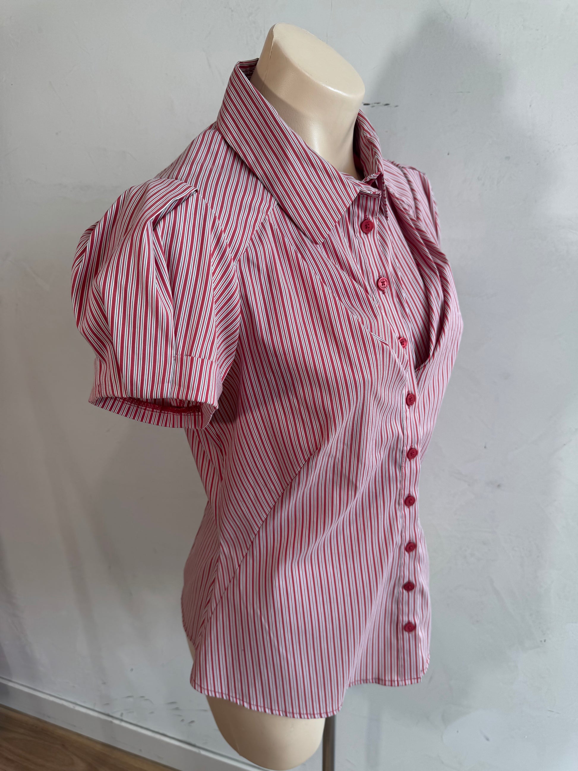 A Tailored cut Cue red, black, and white button up collared top with puffy short sleeves.