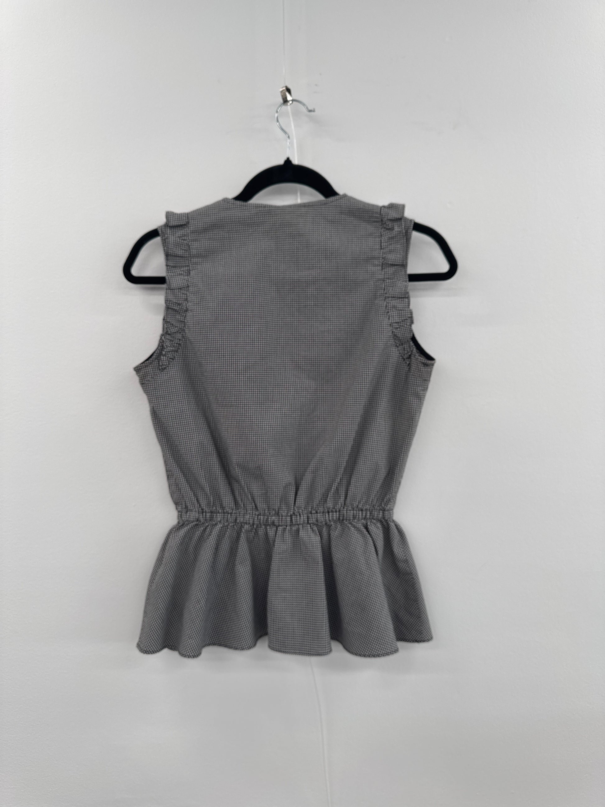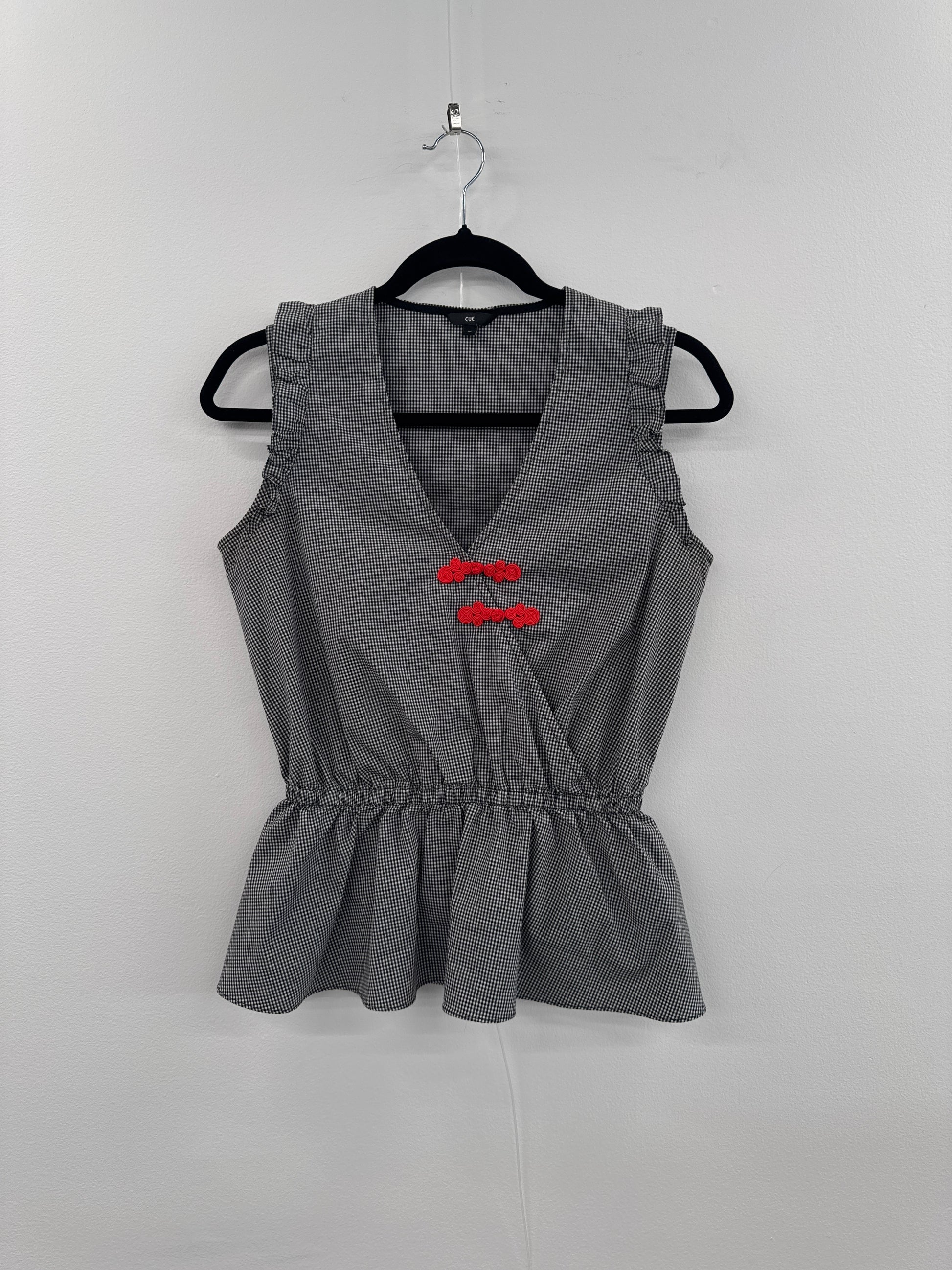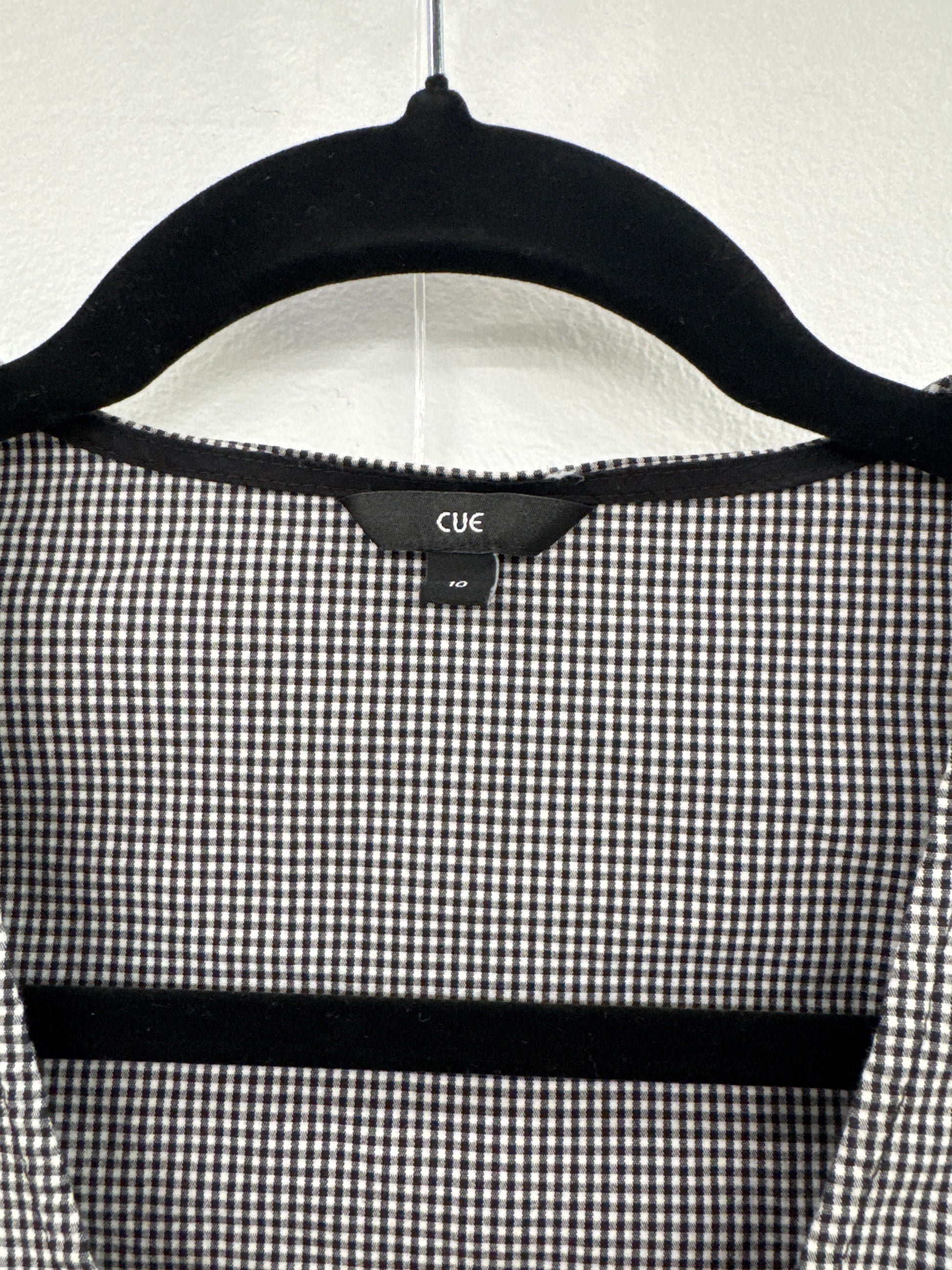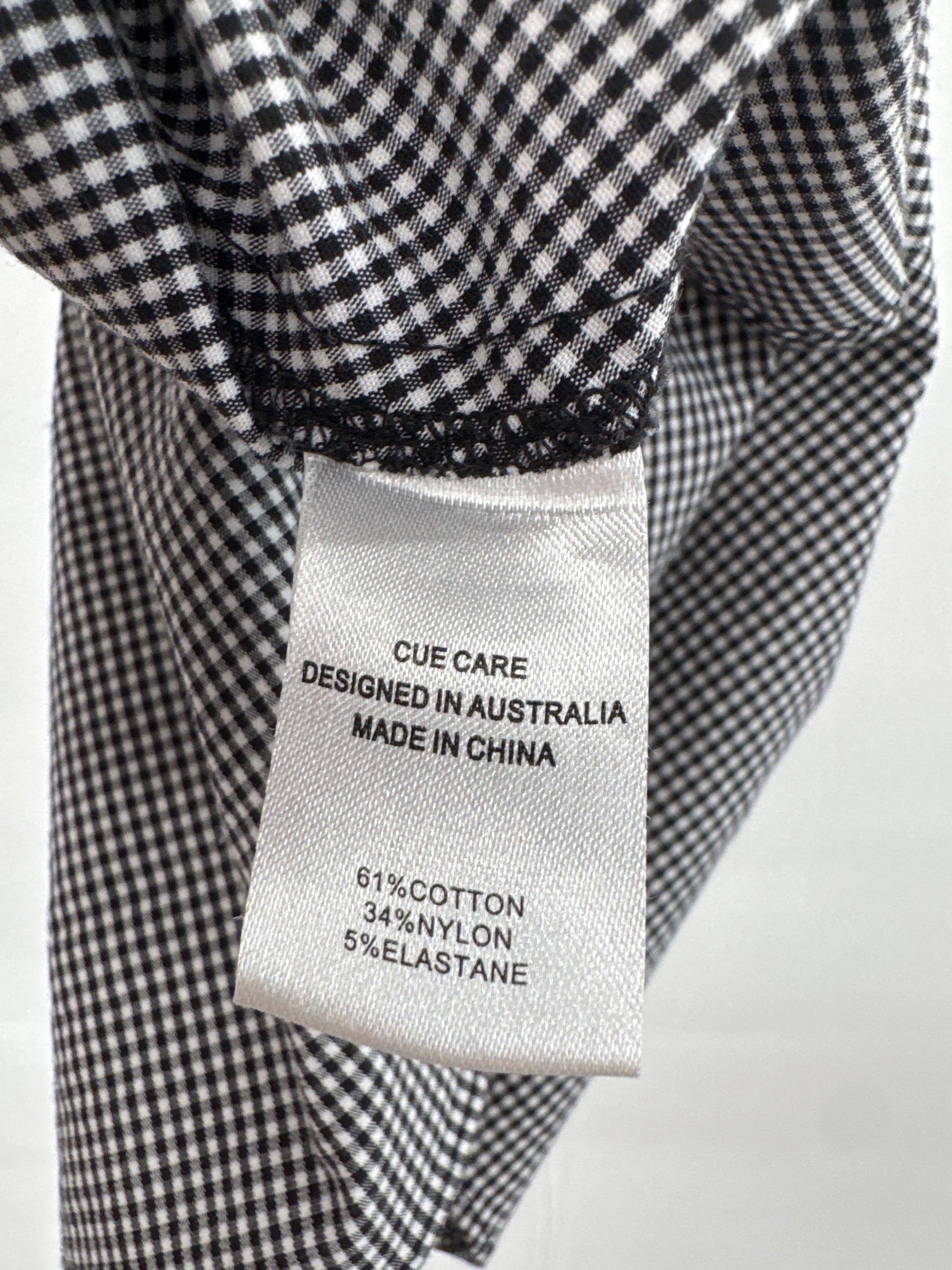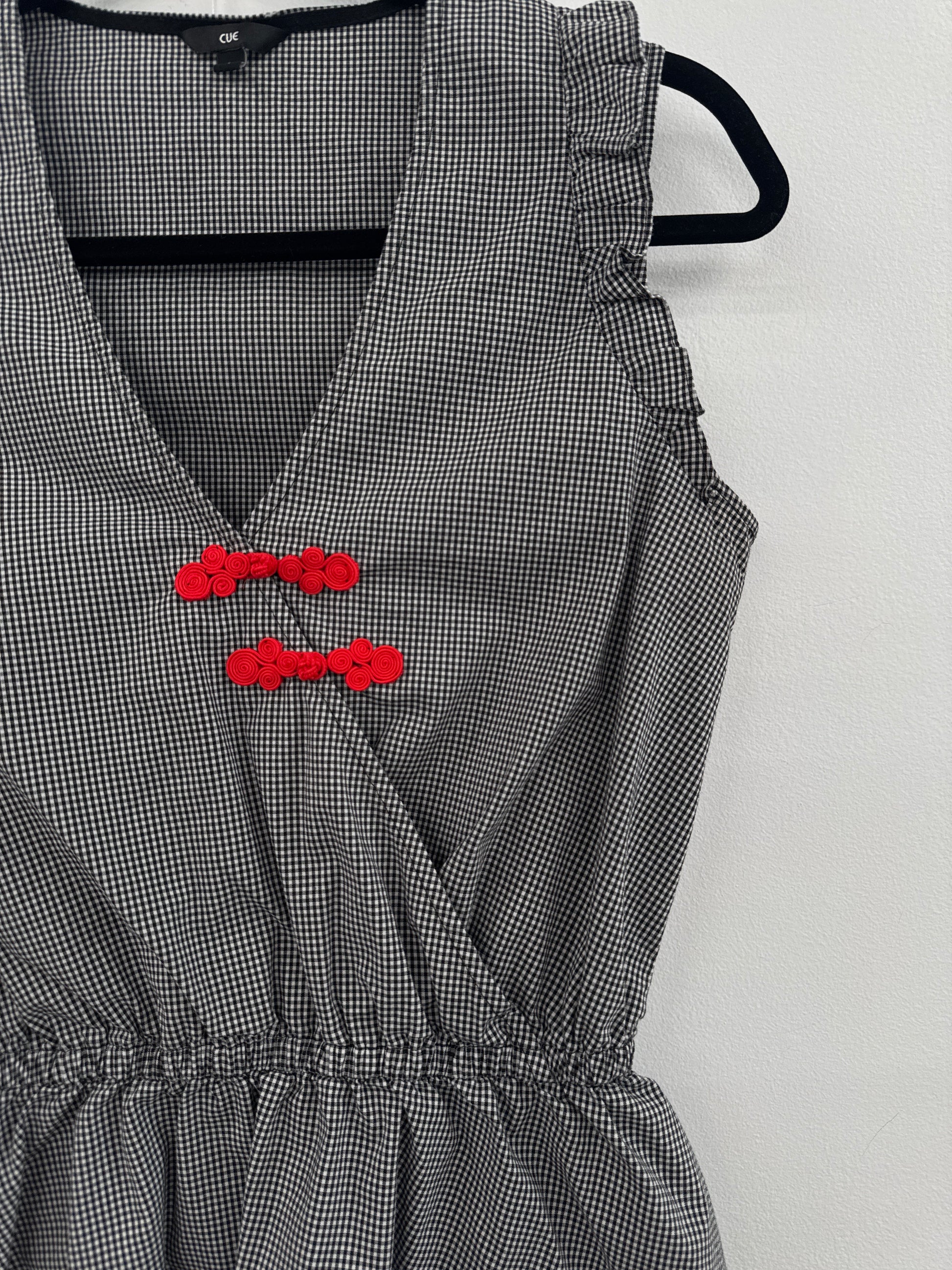Gingham Cue top with bright red trang button details. Features frilly shoulder details and elastic waistband. AU size 10. Great preloved condition, no notable marks or faults.