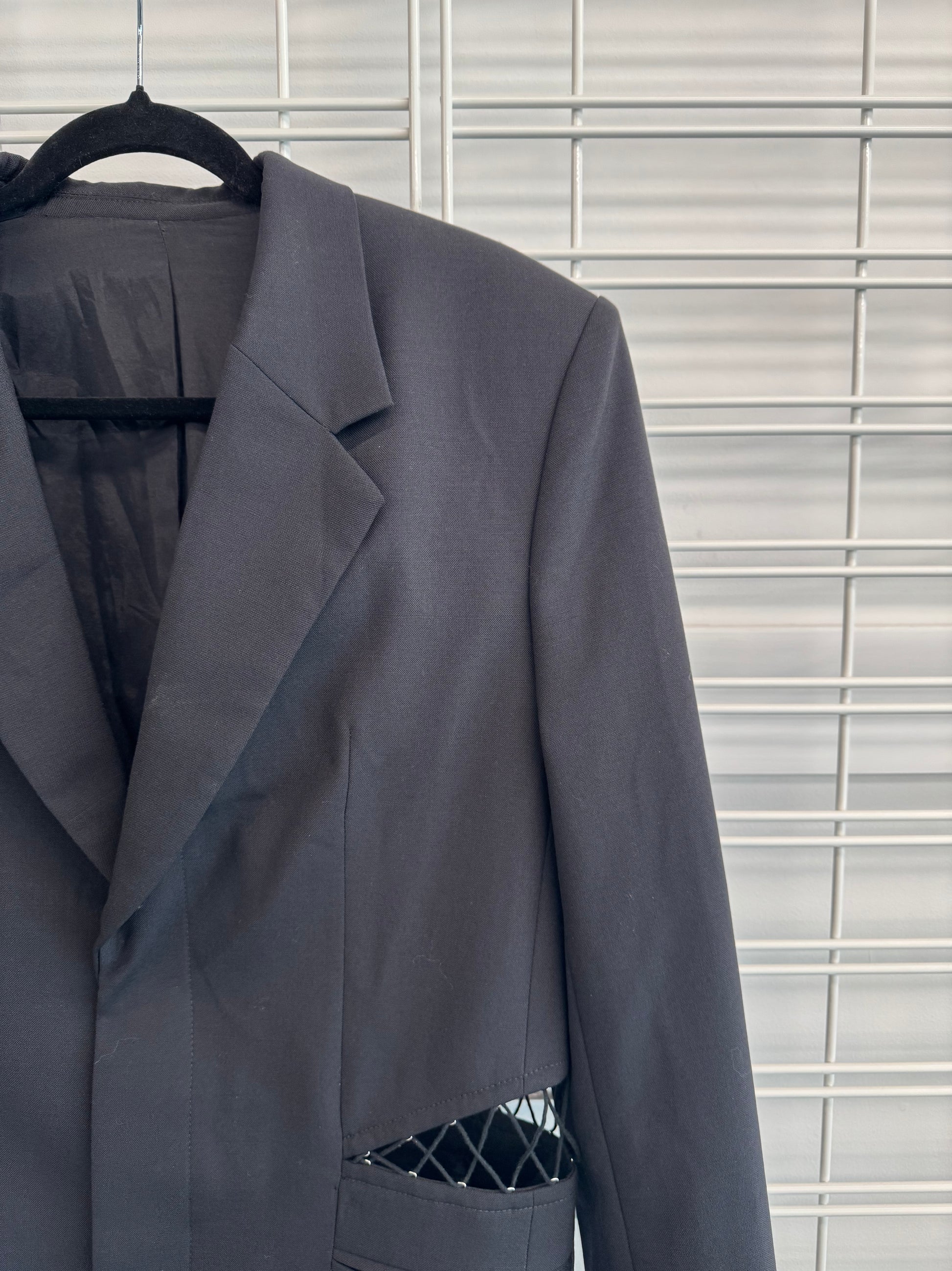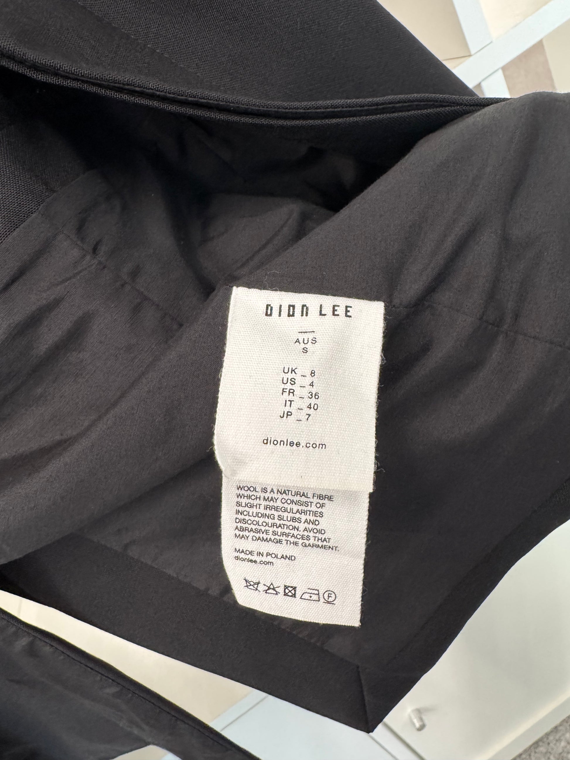 Cutout lace-up detail around waist. Embellished buttons on front and cuffs. 100% Wool outer. Front pockets not functional. Functional hidden pocket in lining as pictured.