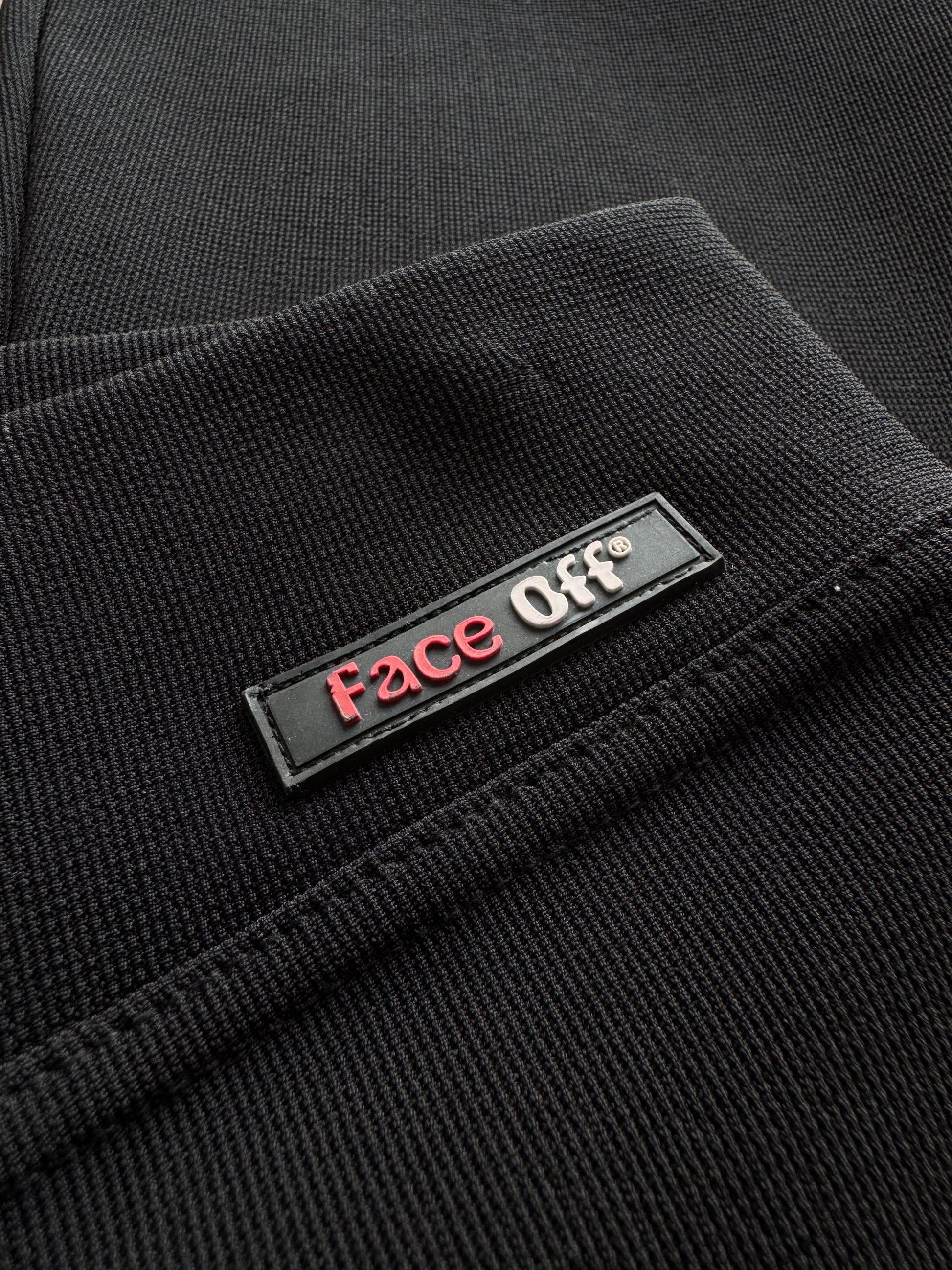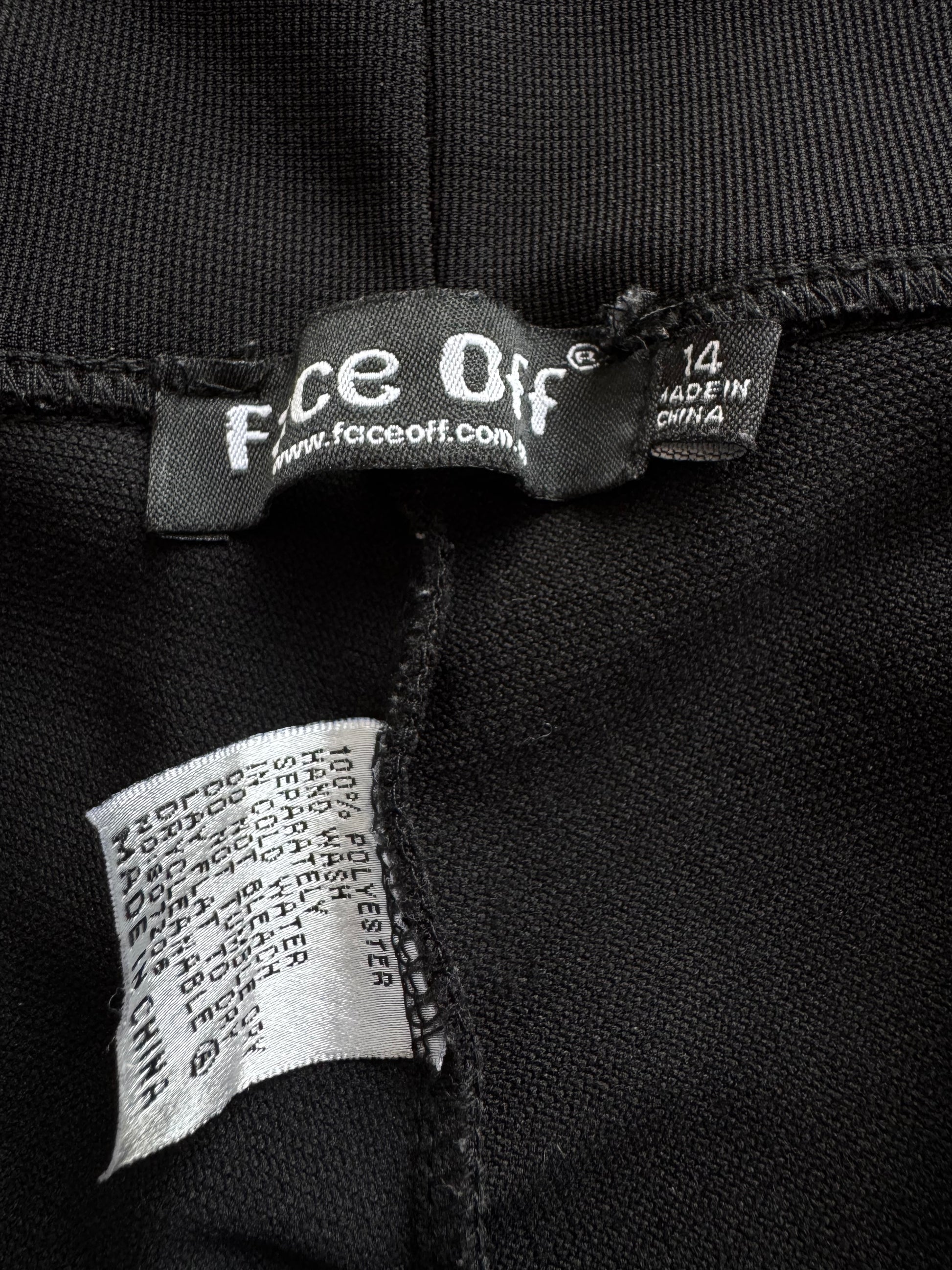 Black pants from thee brand Faceoff, has a bit of a flare leg.