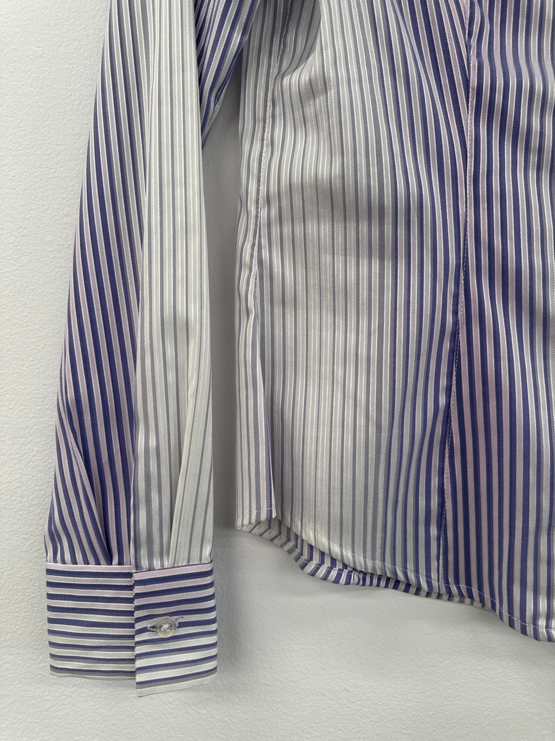 White/purple striped shirt with frill detailing and tang button. Size 36, suited to an AU 8. In great preloved condition, no faults or stains, new with tags.