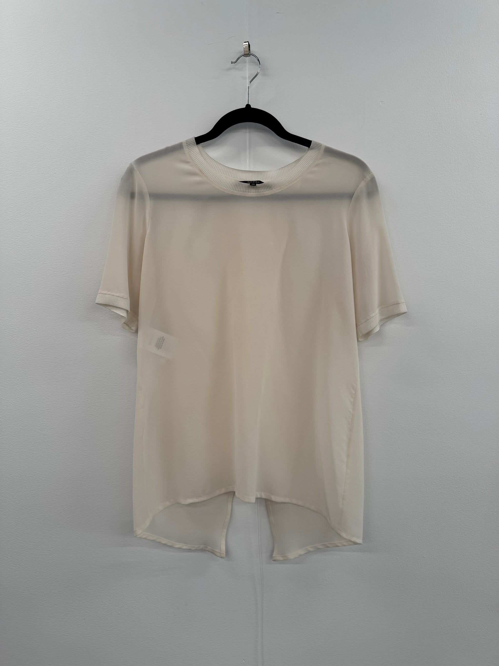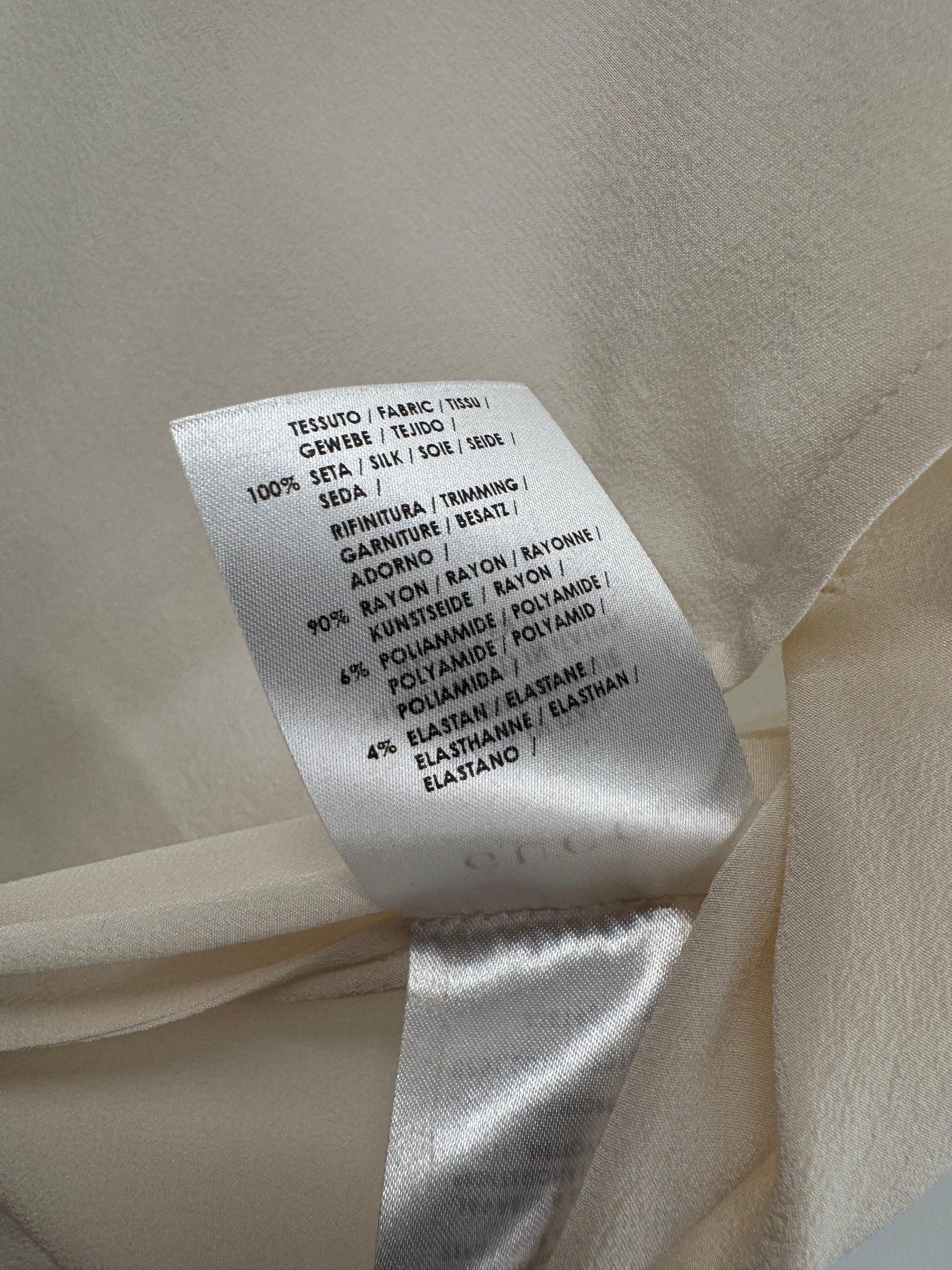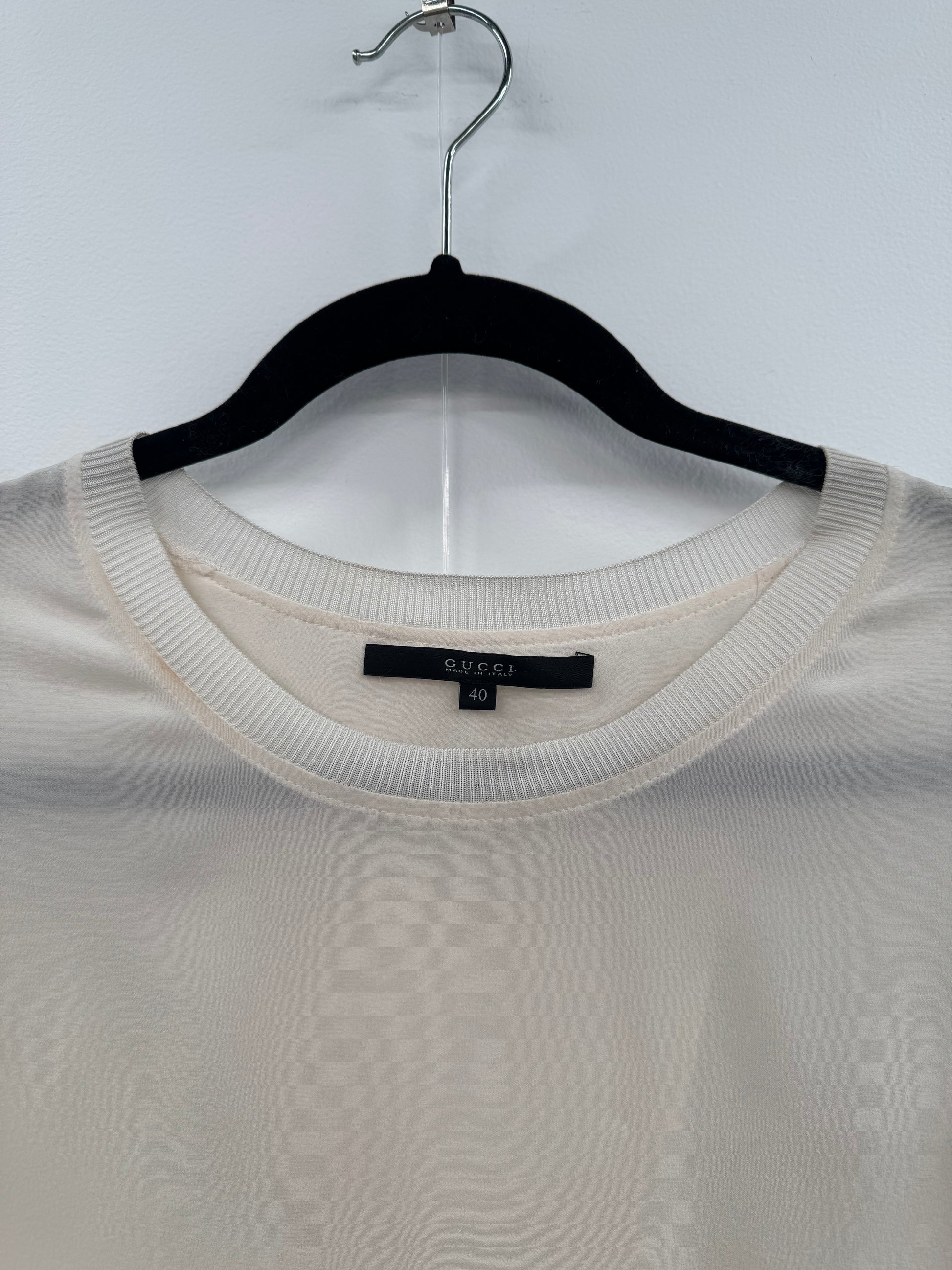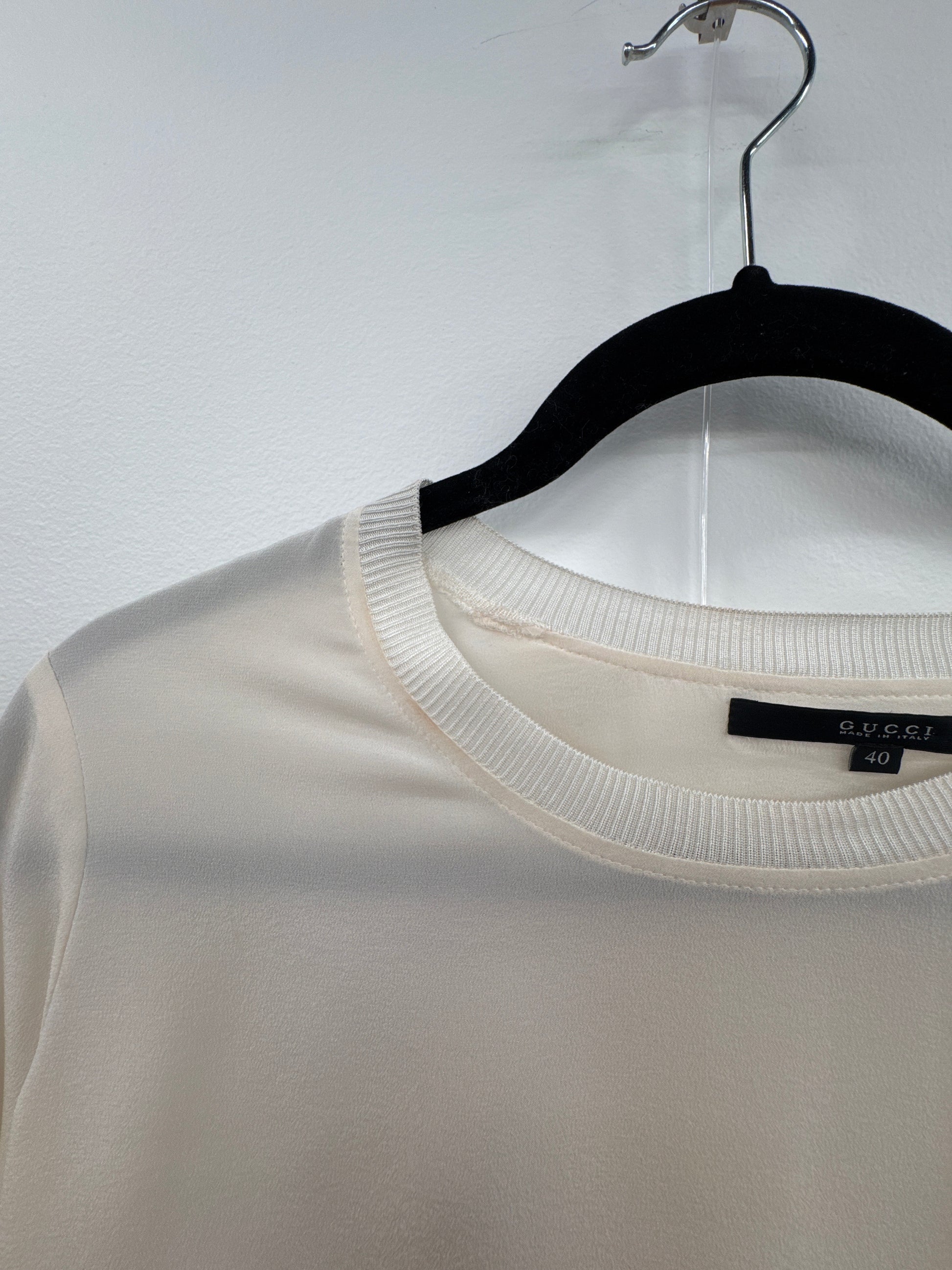 Gucci ivory silk top. Marked size 40, AU size 10 equivalent. 100% silk. Features split in the back with ribbed trim along neckline and sleeve cuffs.
