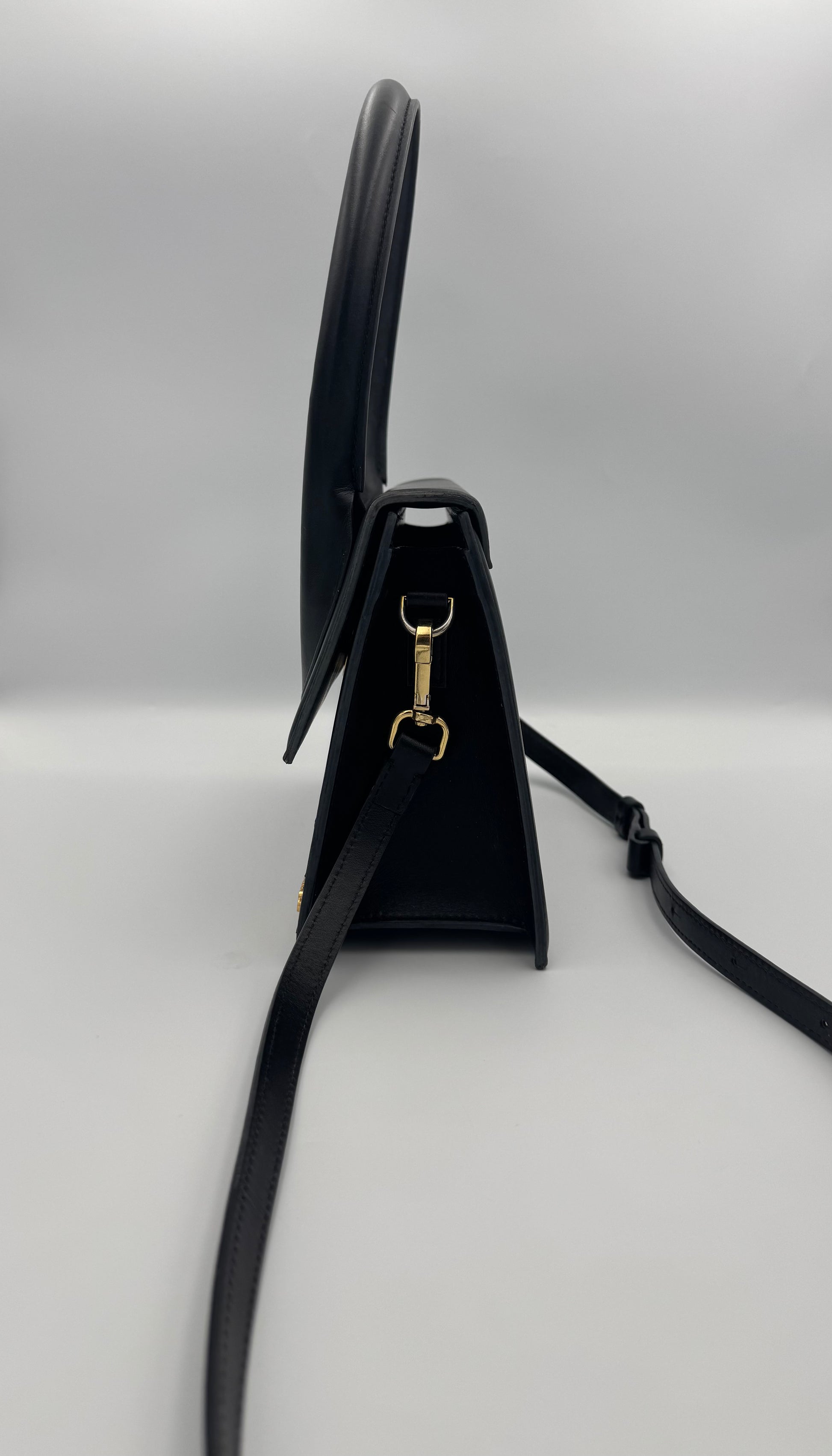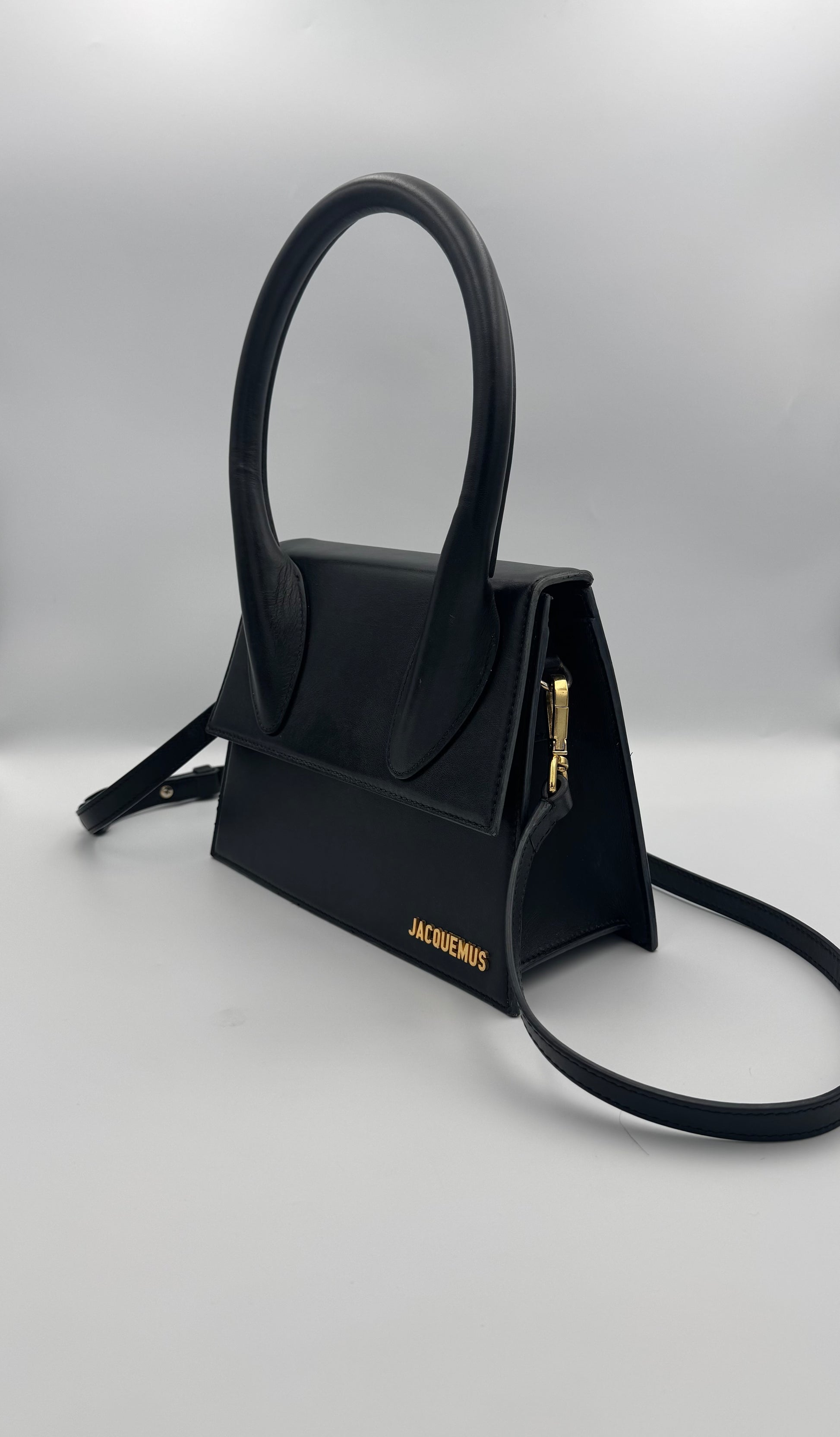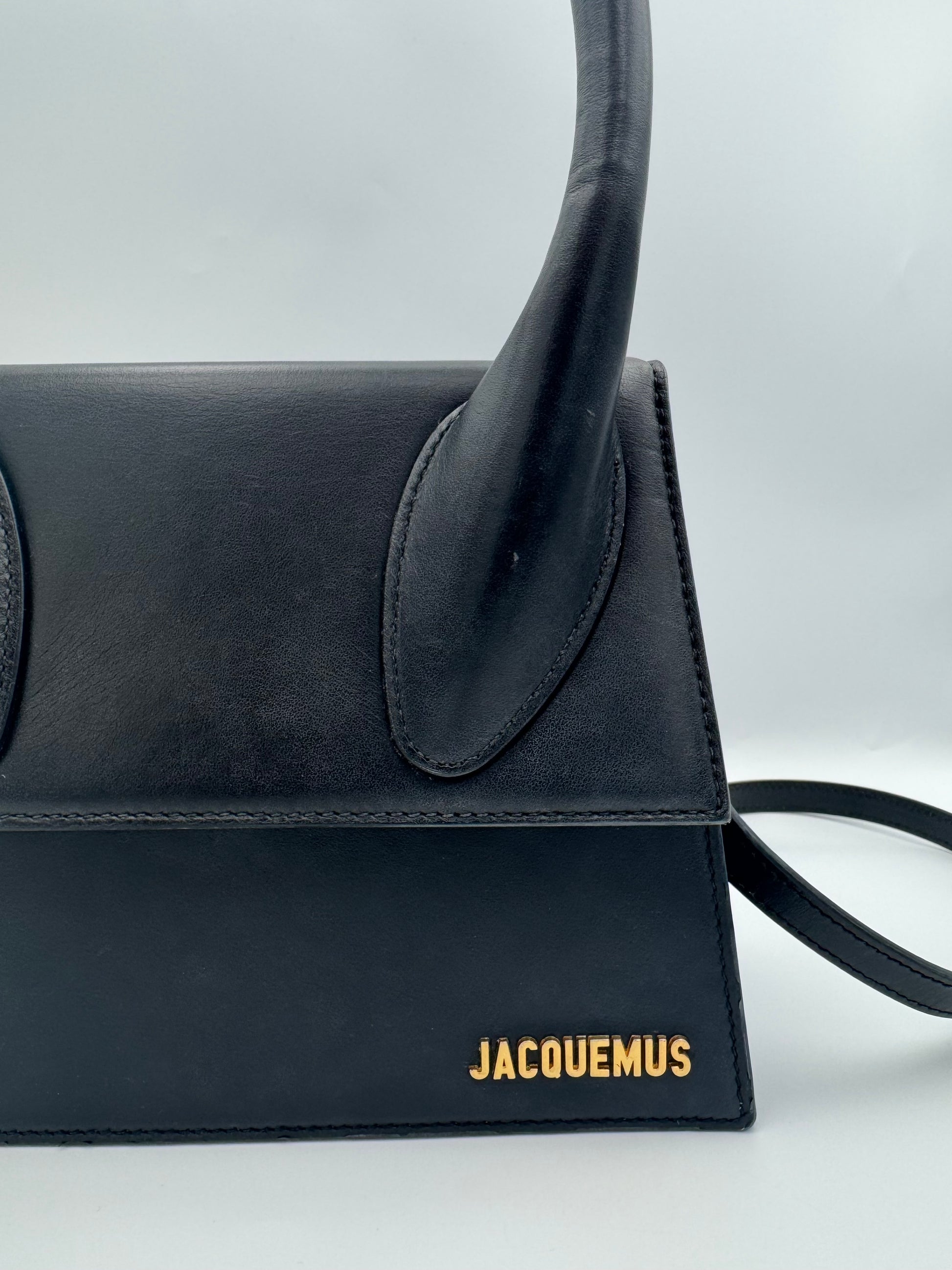 Black ‘Le Grand’ shoulder bag from Jacquemus. Crafted from leather, this model fastens with a magnetic snap and is complete with a metal logo, half-round handle, detachable and adjustable strap, gold-tone metal hardware and one internal compartment with one card slot.