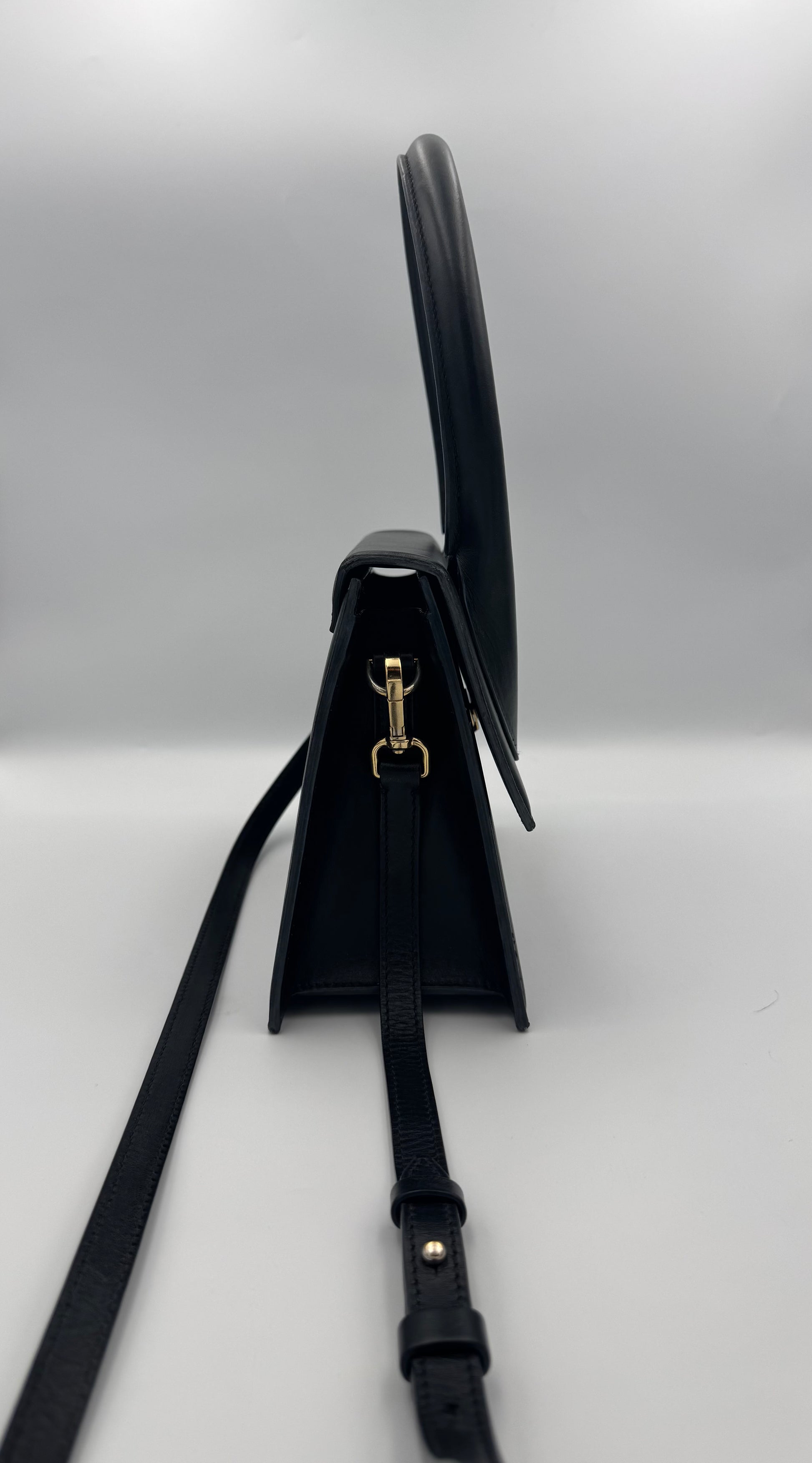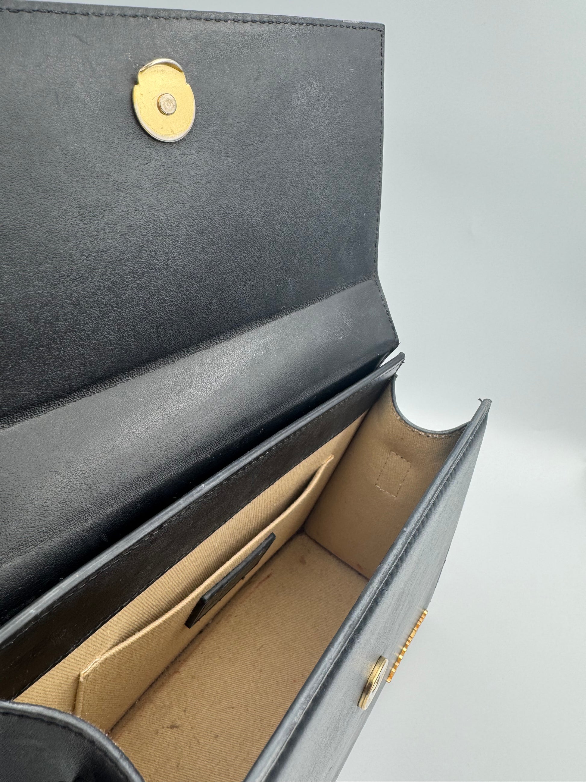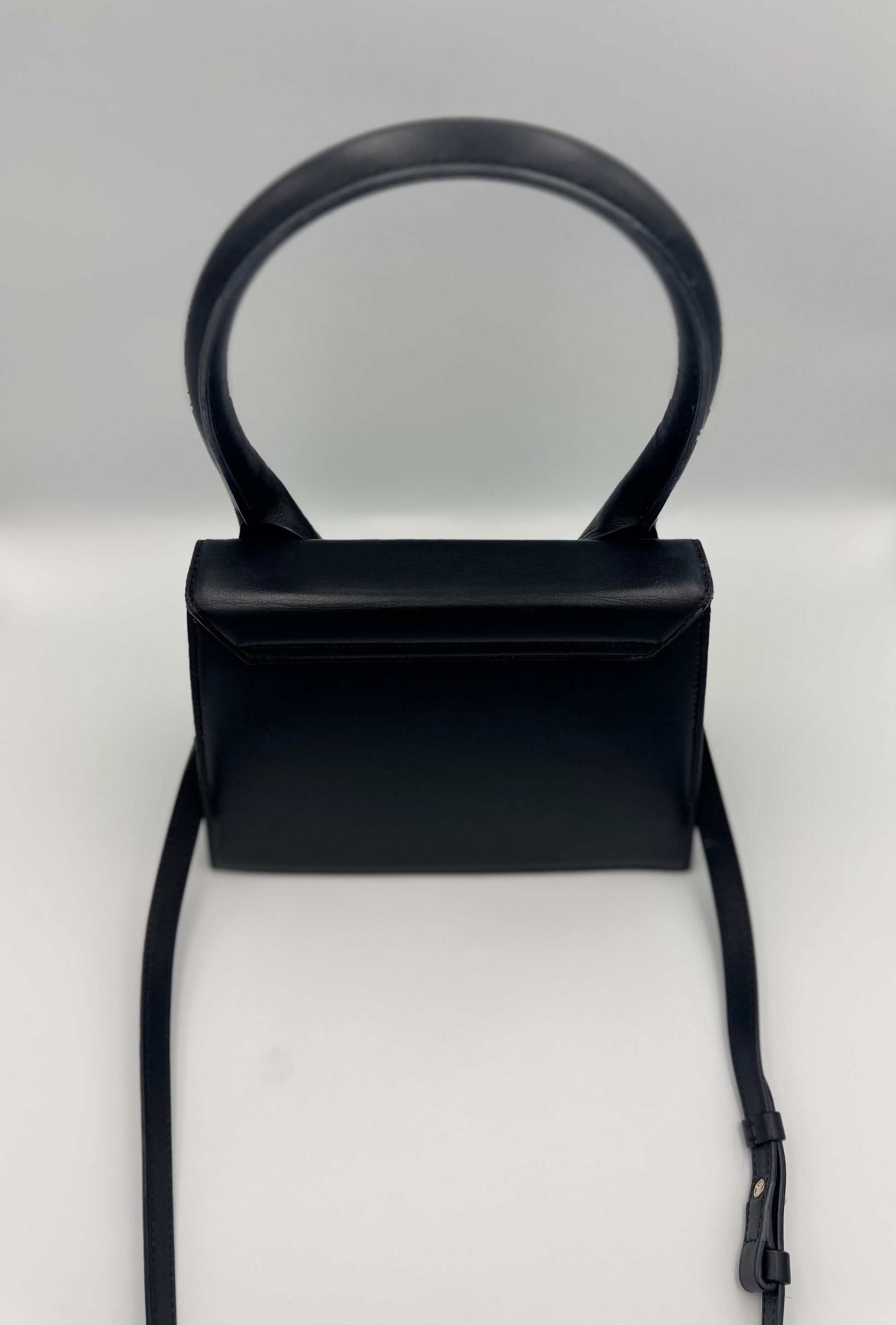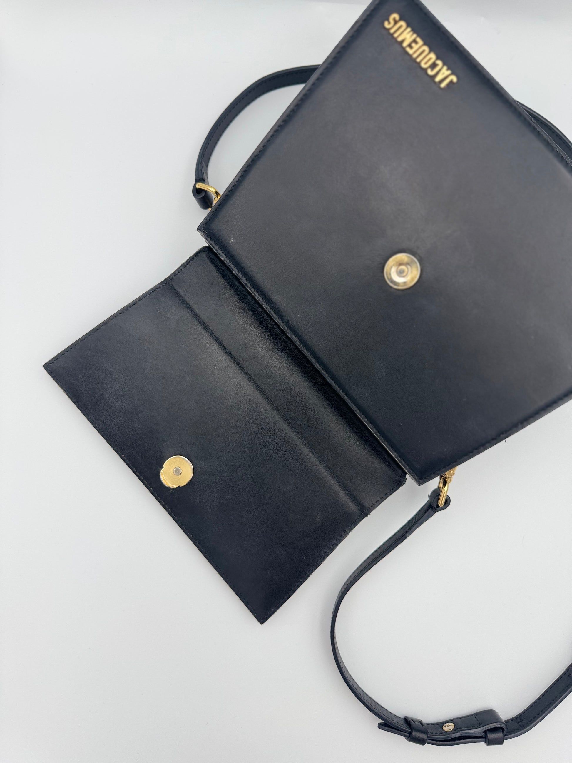 Black ‘Le Grand’ shoulder bag from Jacquemus. Crafted from leather, this model fastens with a magnetic snap and is complete with a metal logo, half-round handle, detachable and adjustable strap, gold-tone metal hardware and one internal compartment with one card slot.