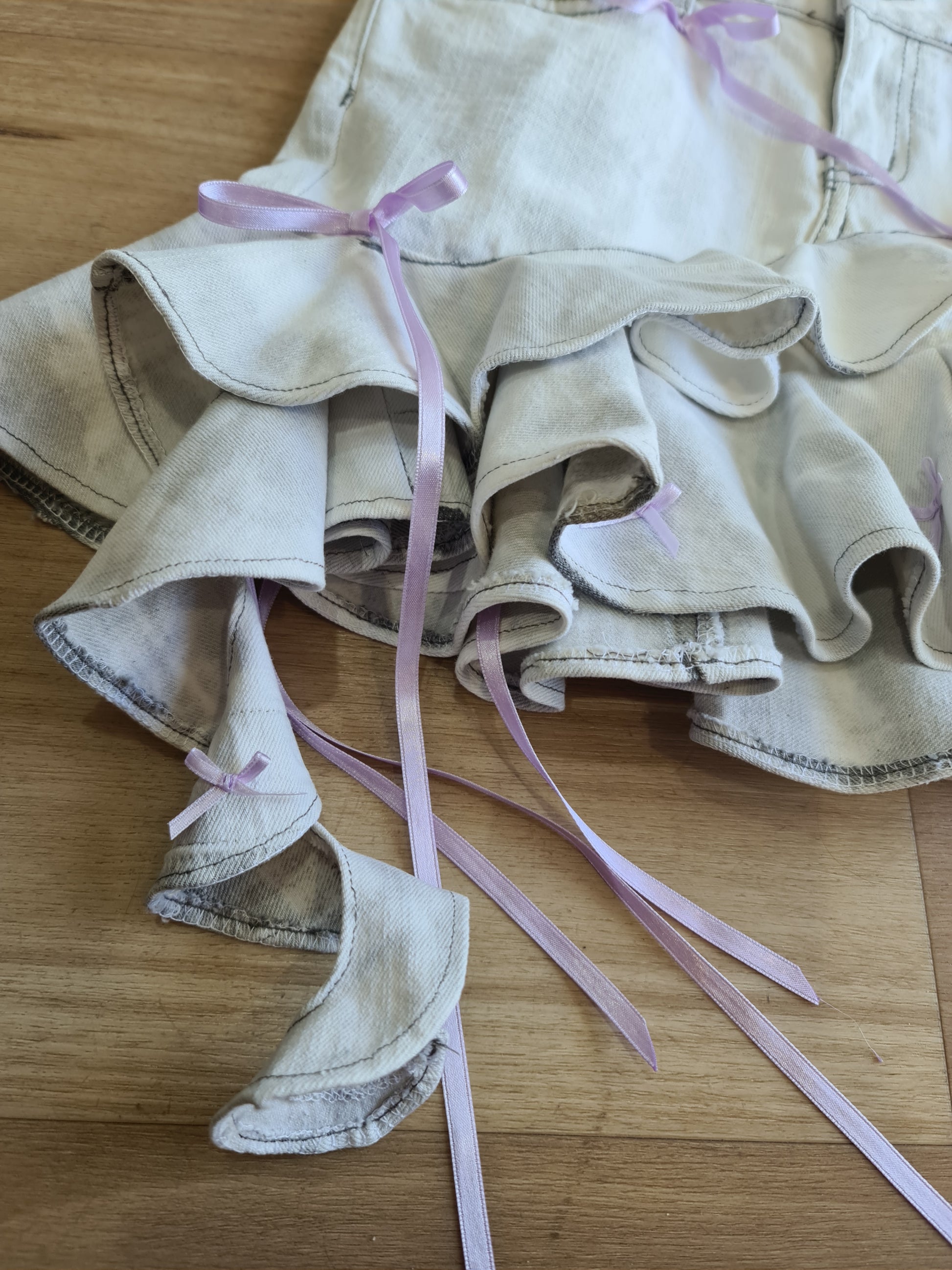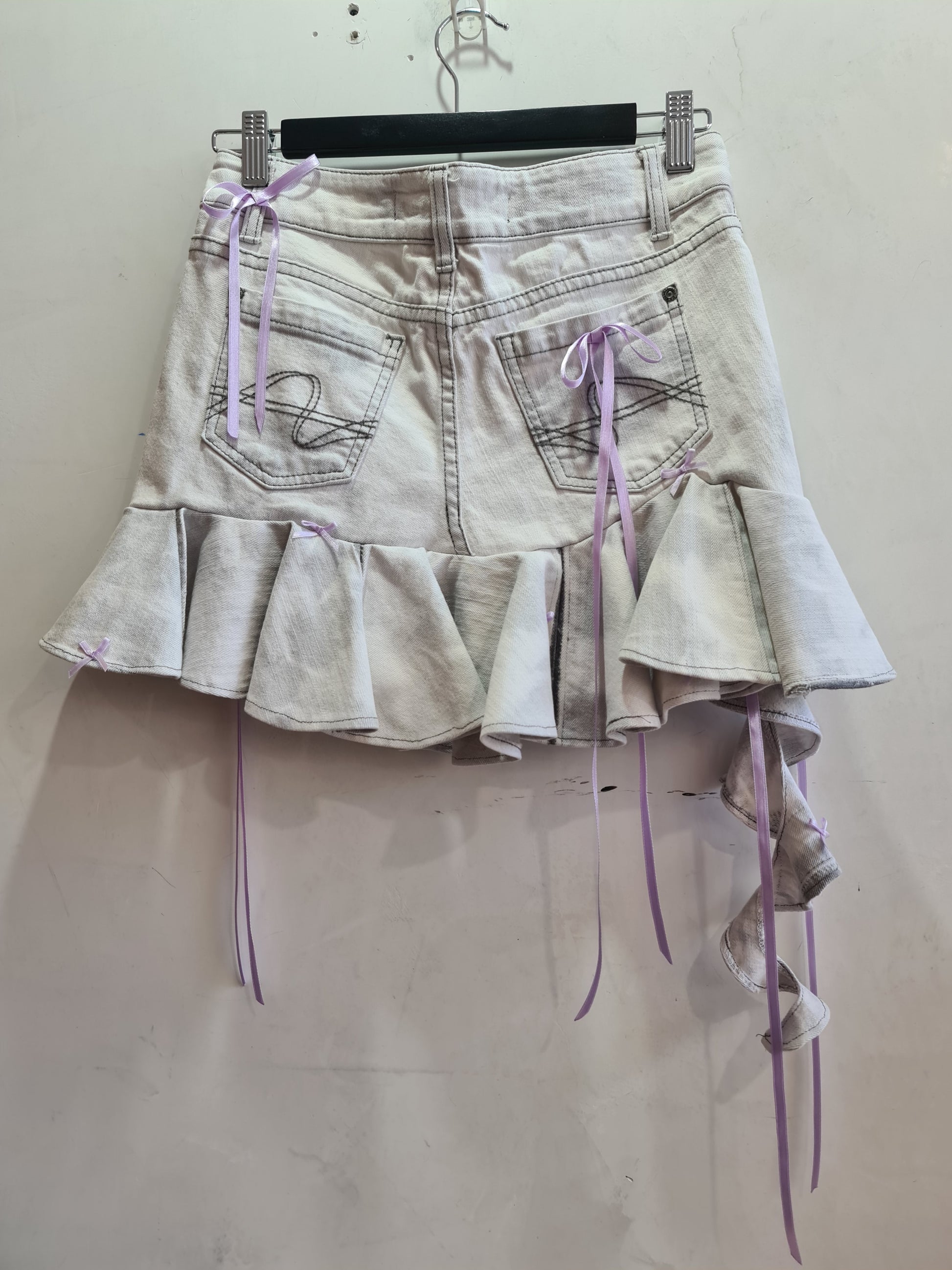 JayJays Denim jeans turned into a custom mini skirt, features lots of frills and purple ribbons. has functional pockets.