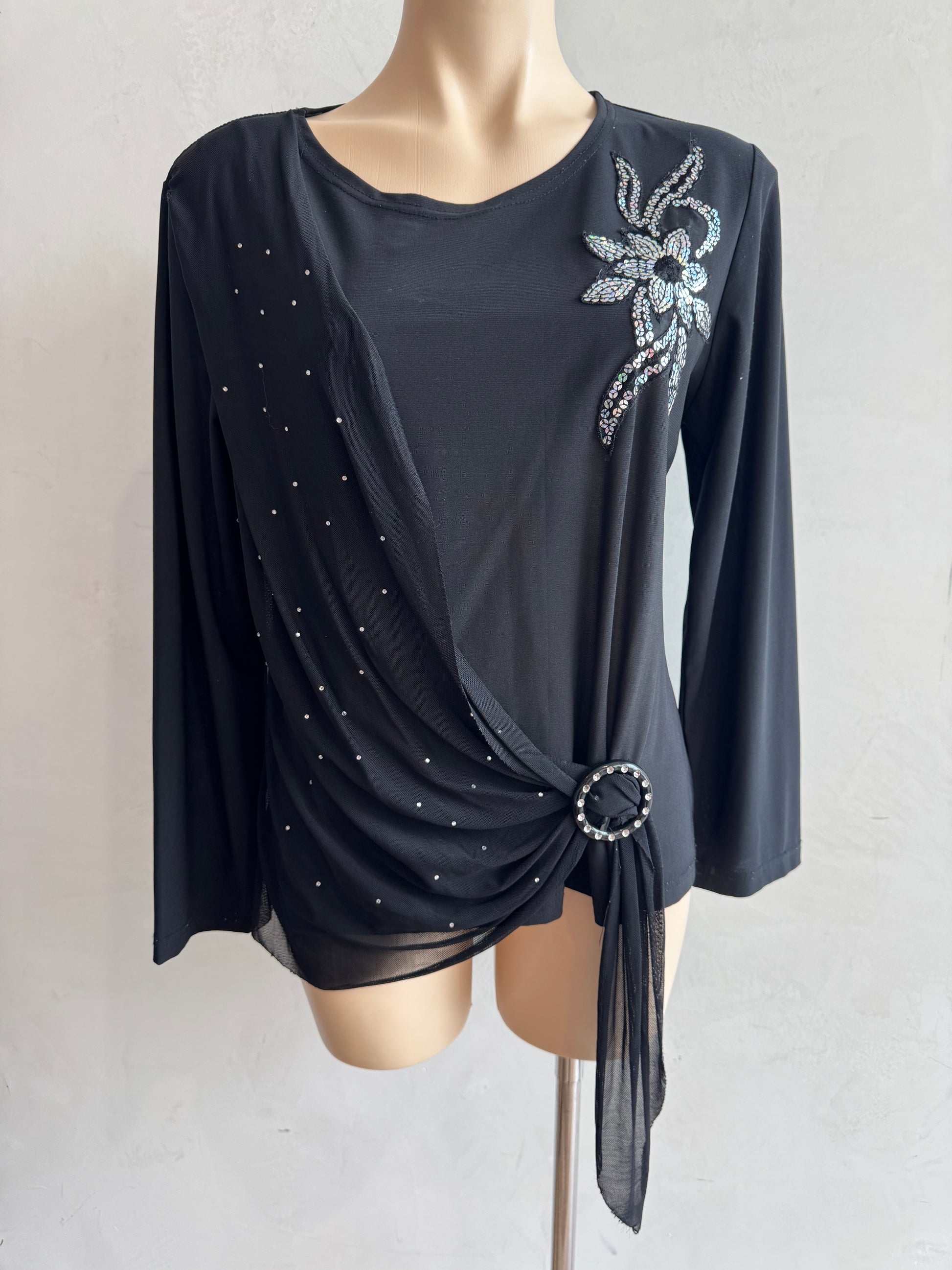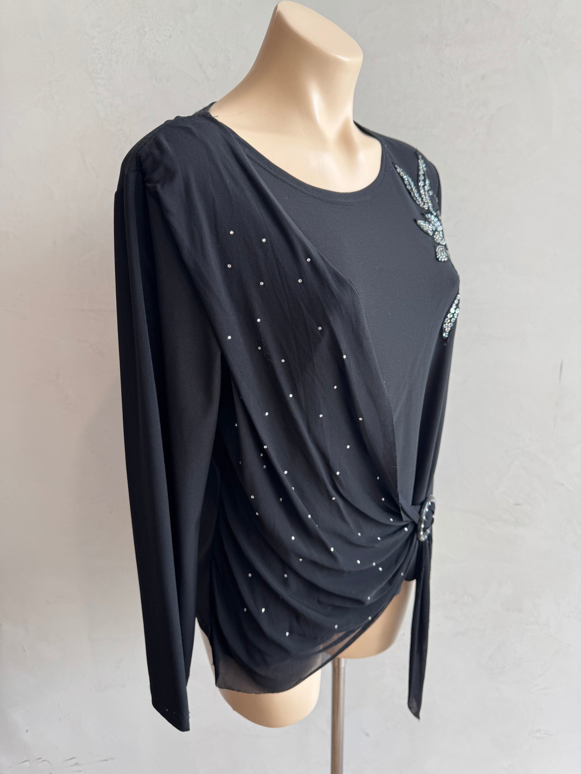 Black sequin top with bedazzled wrap over from Katie Harris.