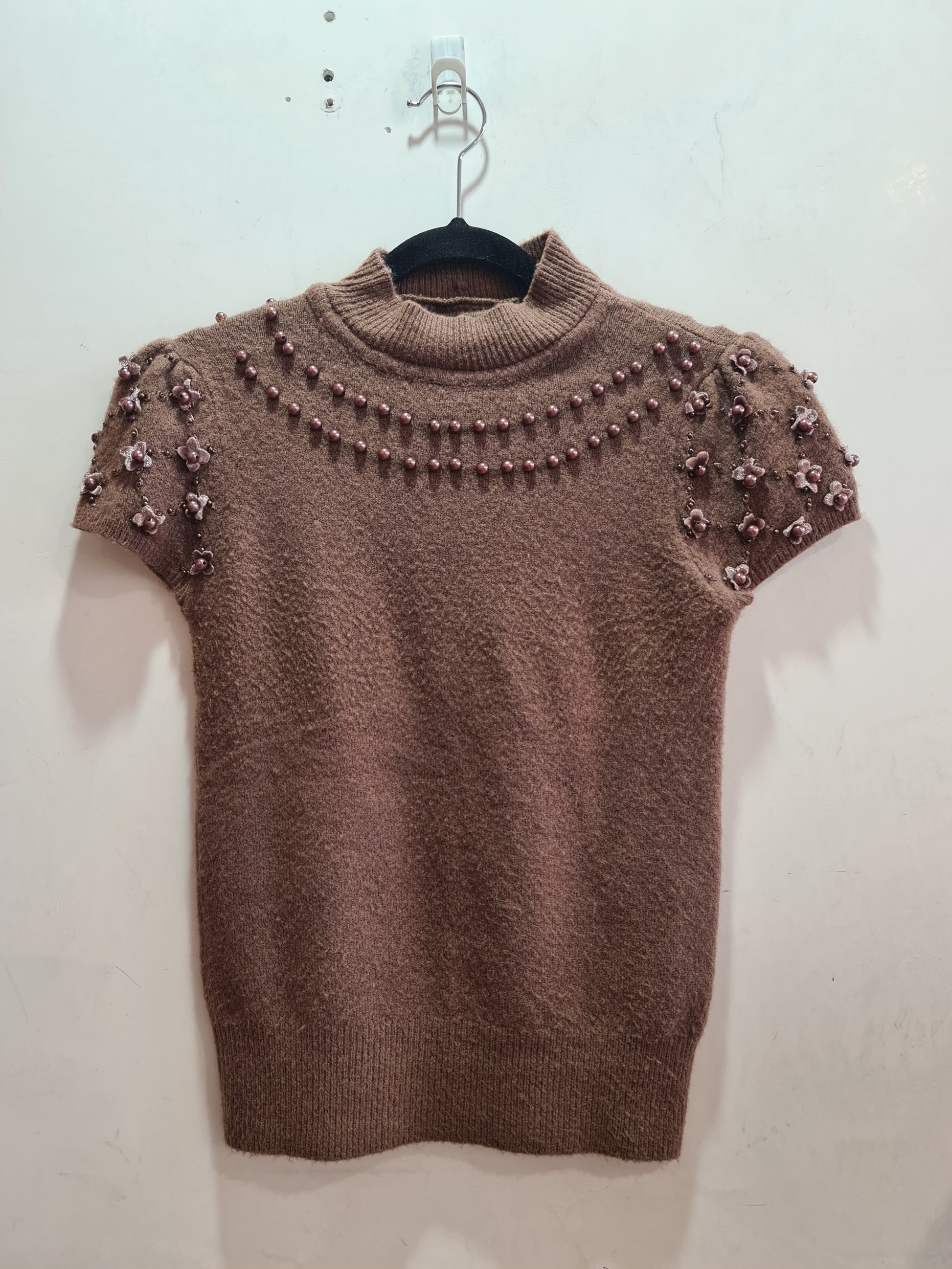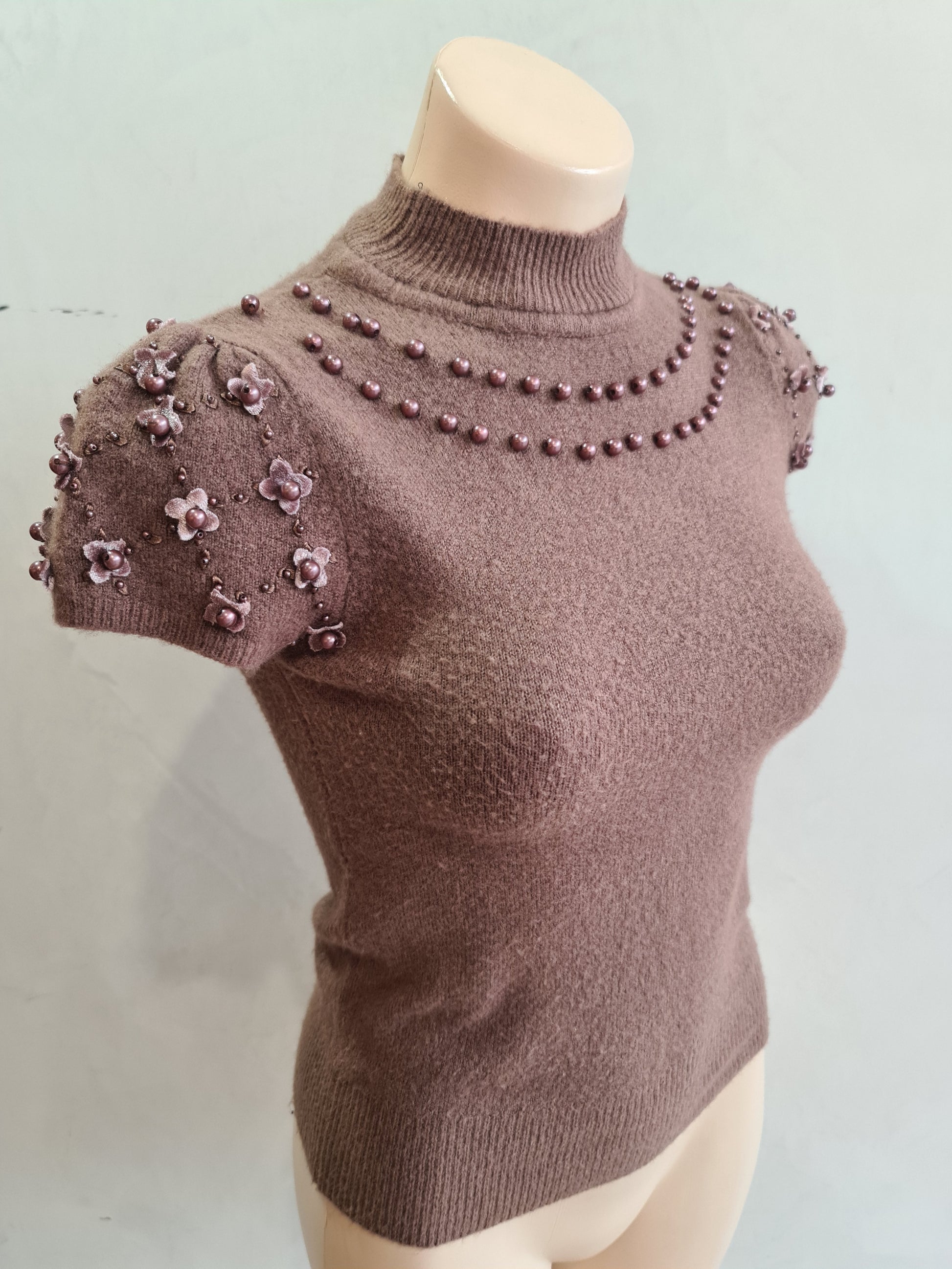 Latte coloured mock neck cap sleeve knit featuring beads and flowers.