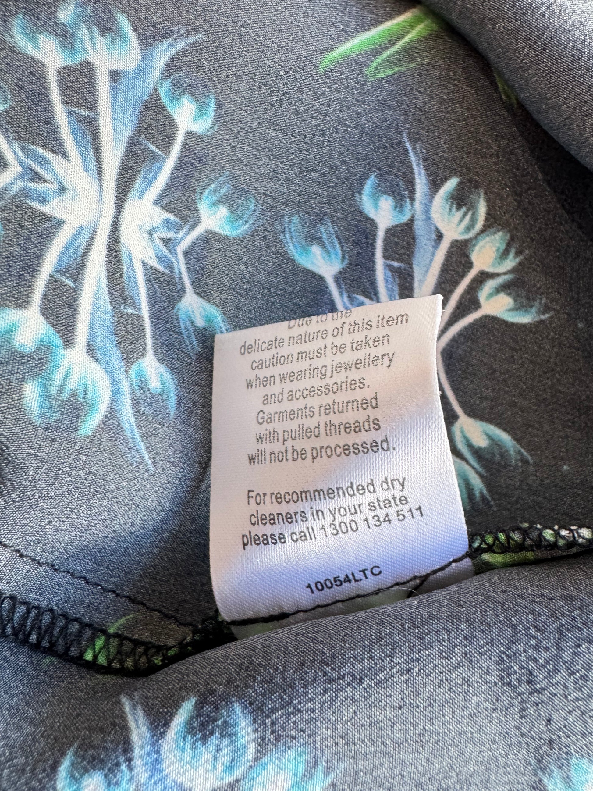 Lisa Ho silk print blouse with cut out in the back. Print features tulips in green blue and purple on a deep navy and white stripped background.