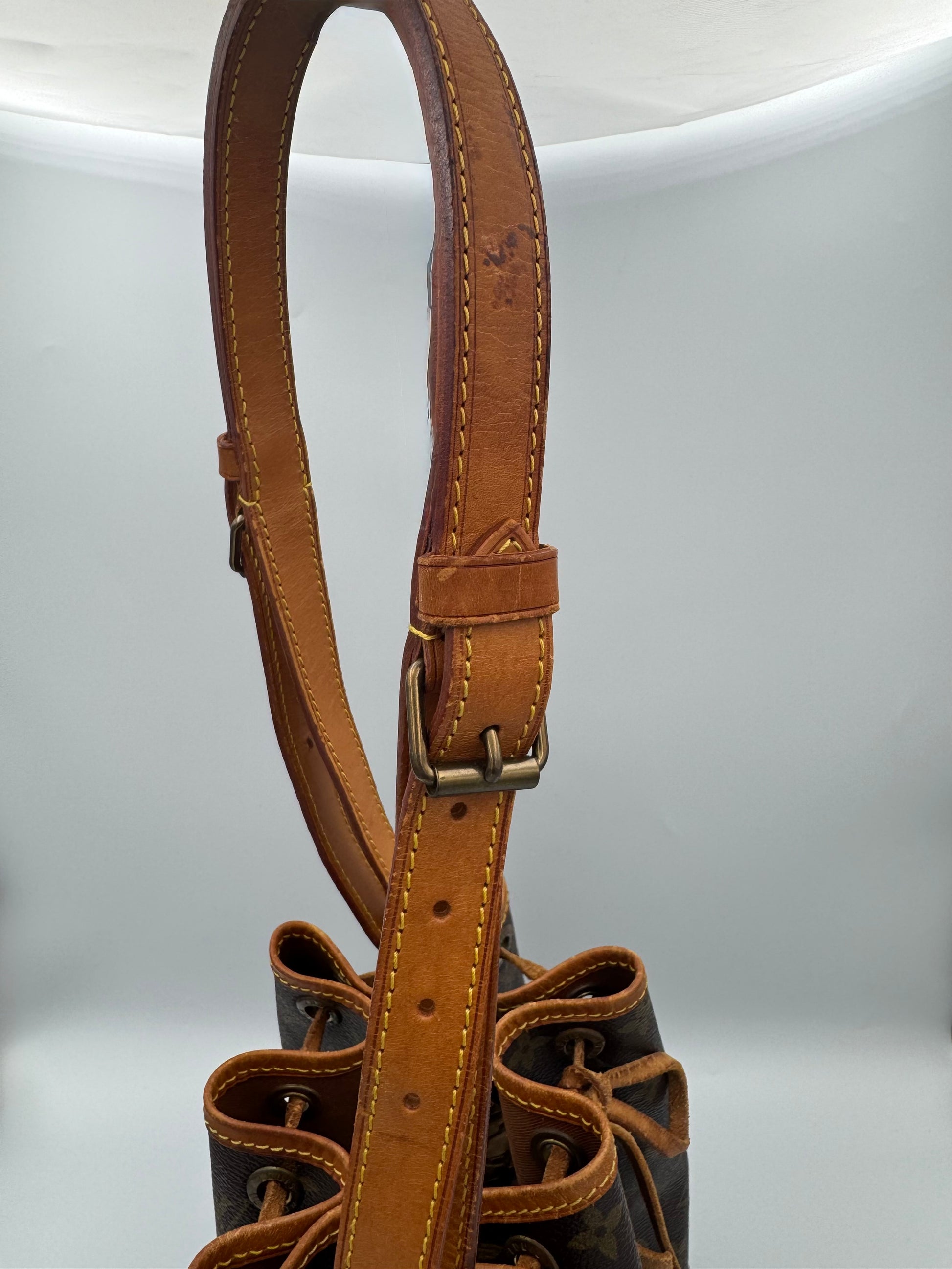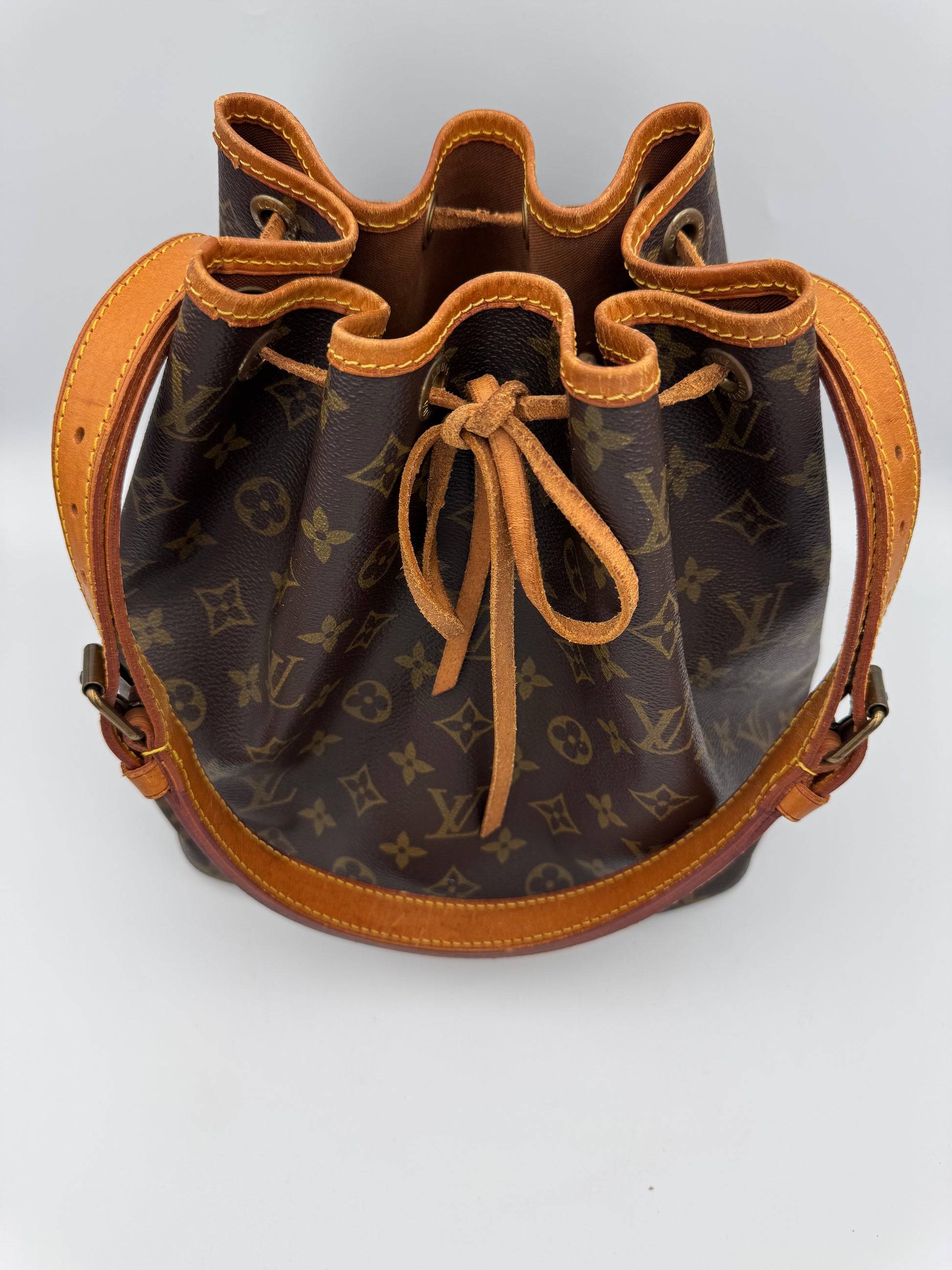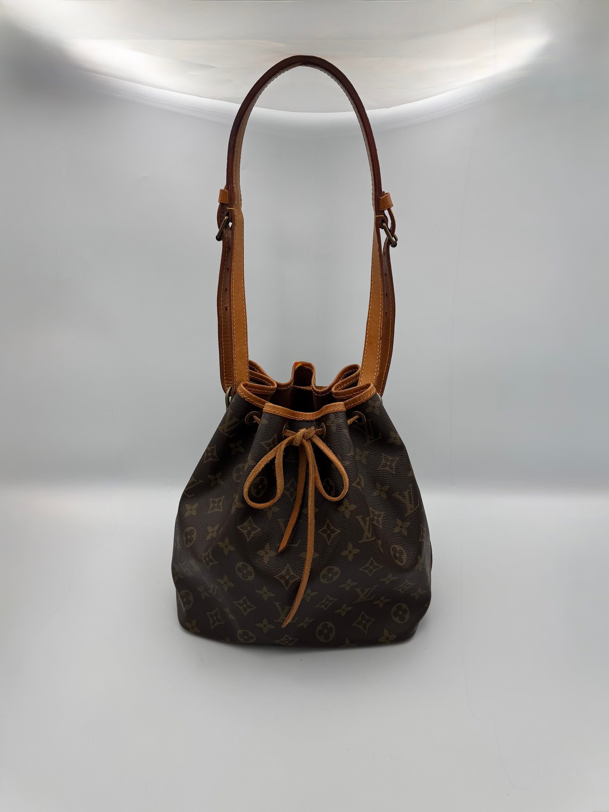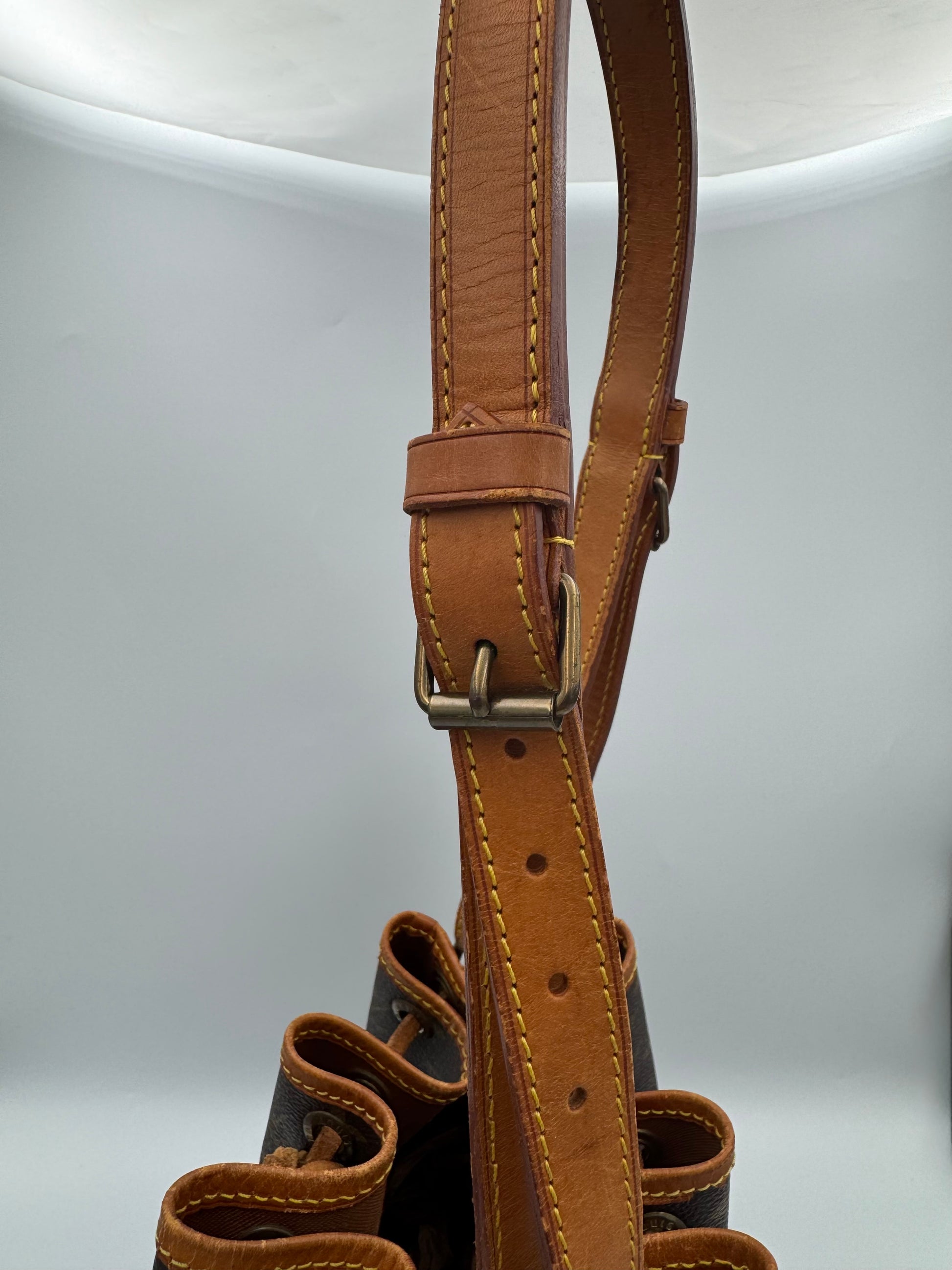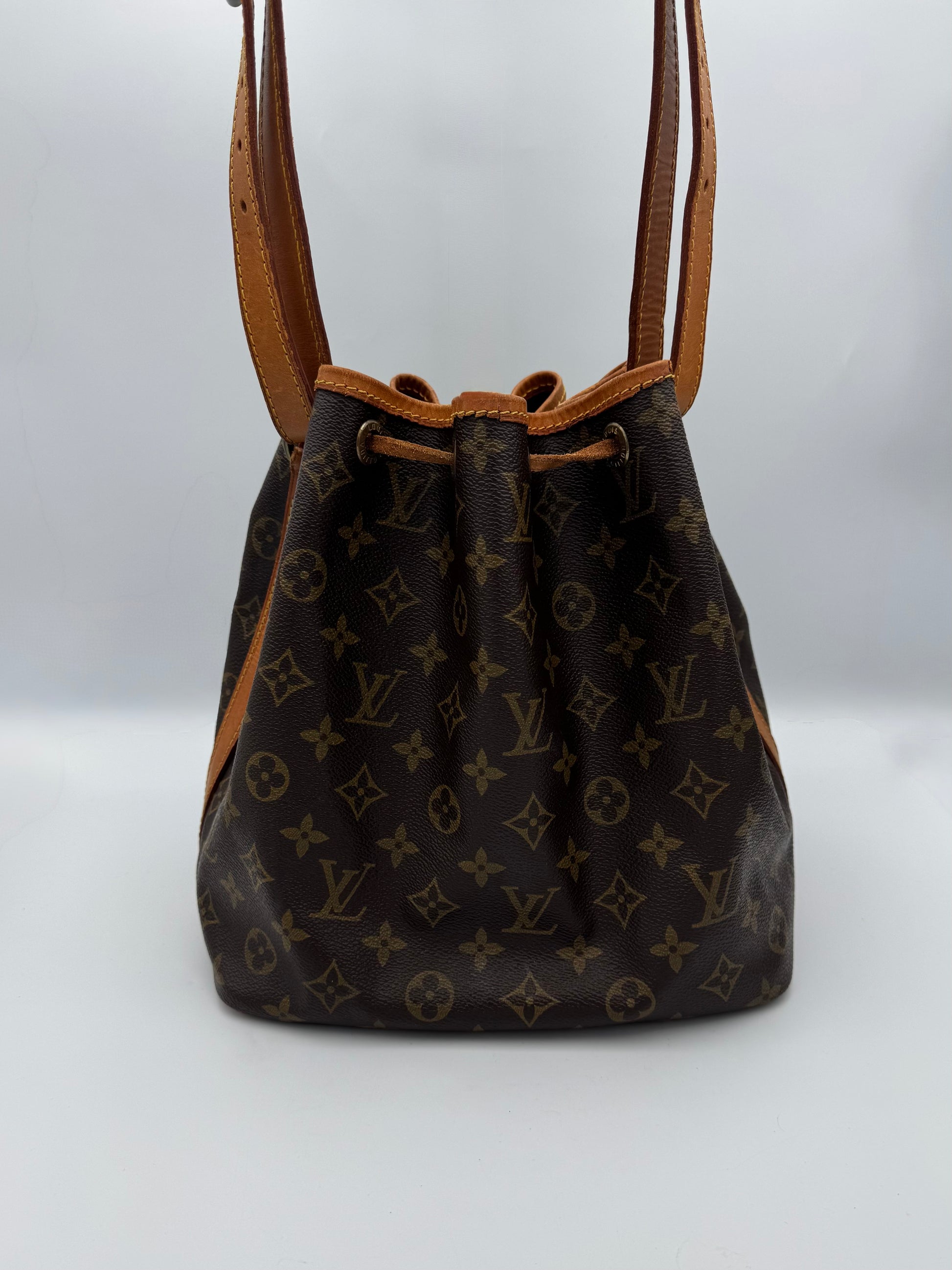 Monogram coated canvas exterior; vachetta cowhide leather trim and base; gold tone brass hardware; adjustable and detachable leather shoulder strap; leather drawstring closure to main compartment; canvas textile lined interior.