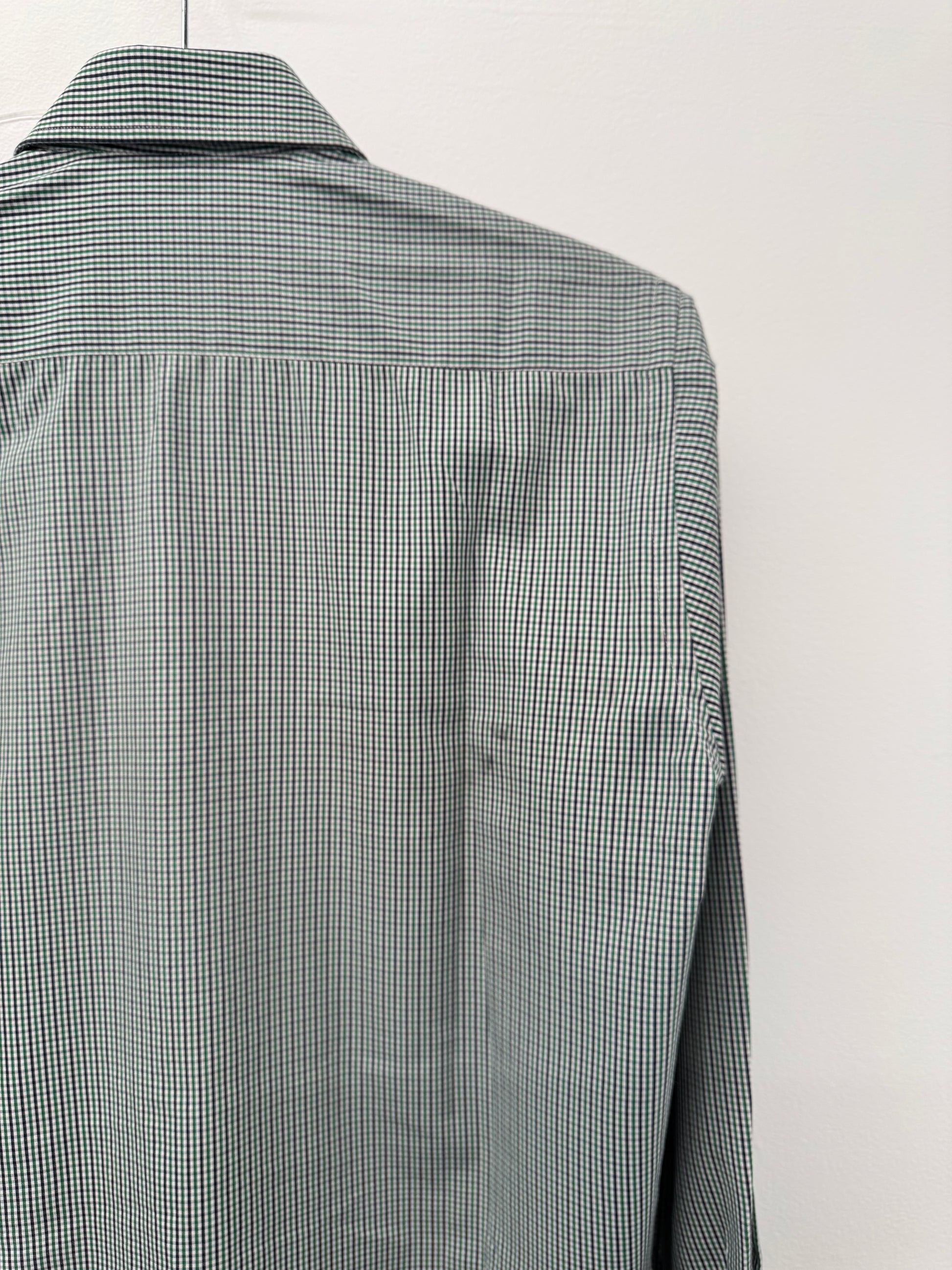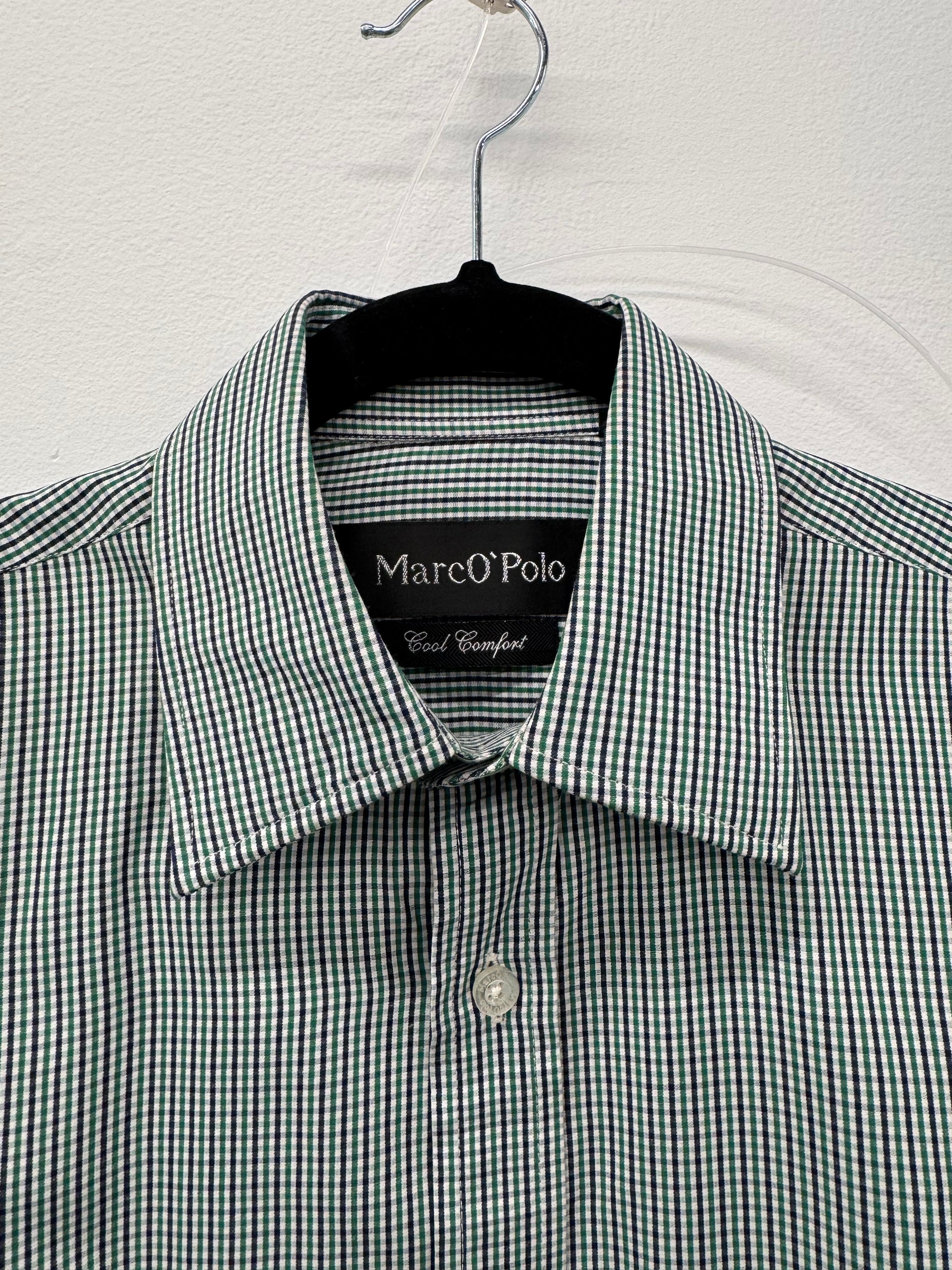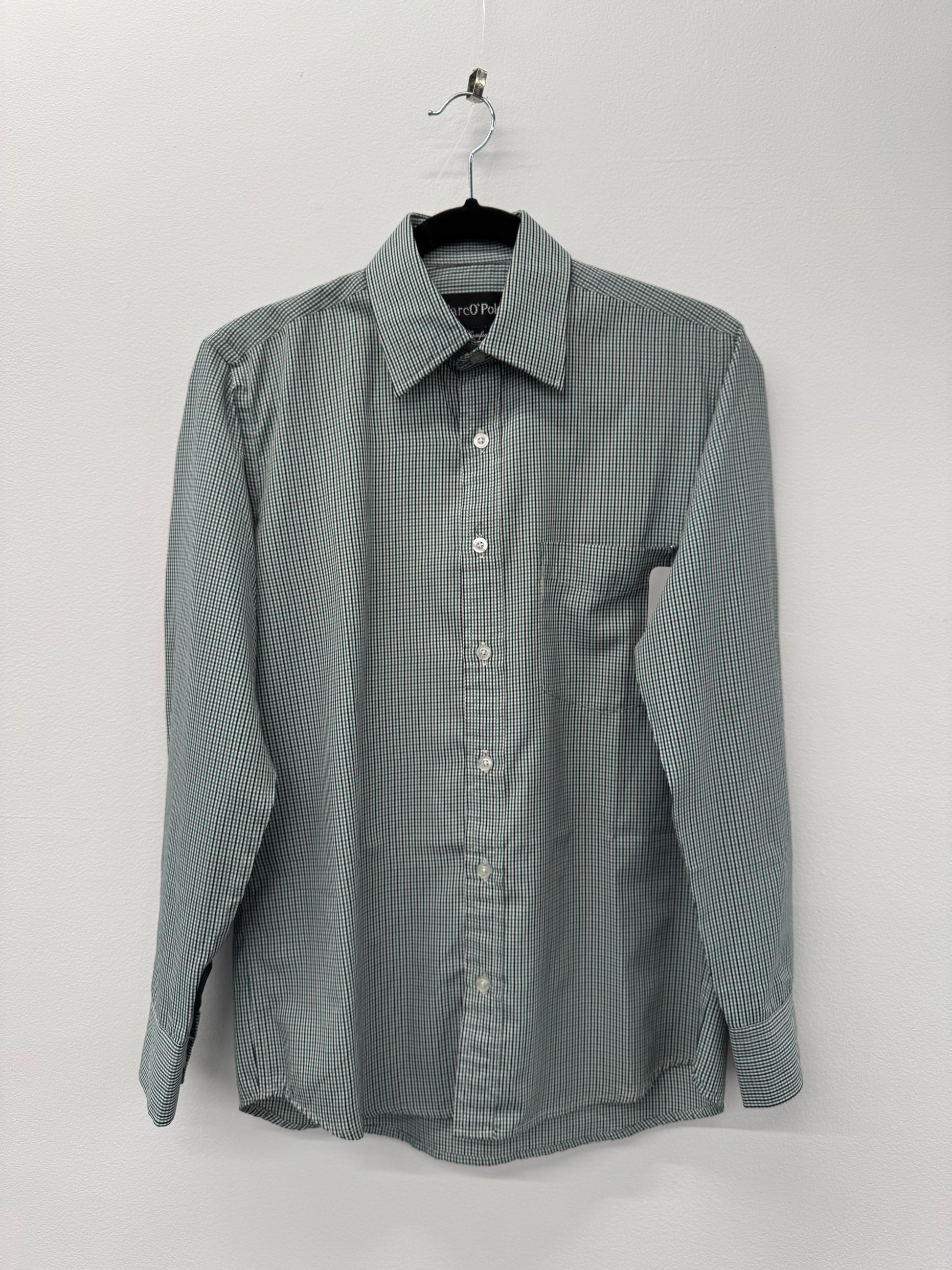Green Marco Polo Check button-up shirt. In great preloved condition. Size S. Small stain on back of shirt as pictured. No materials label - cotton/cotton blend.