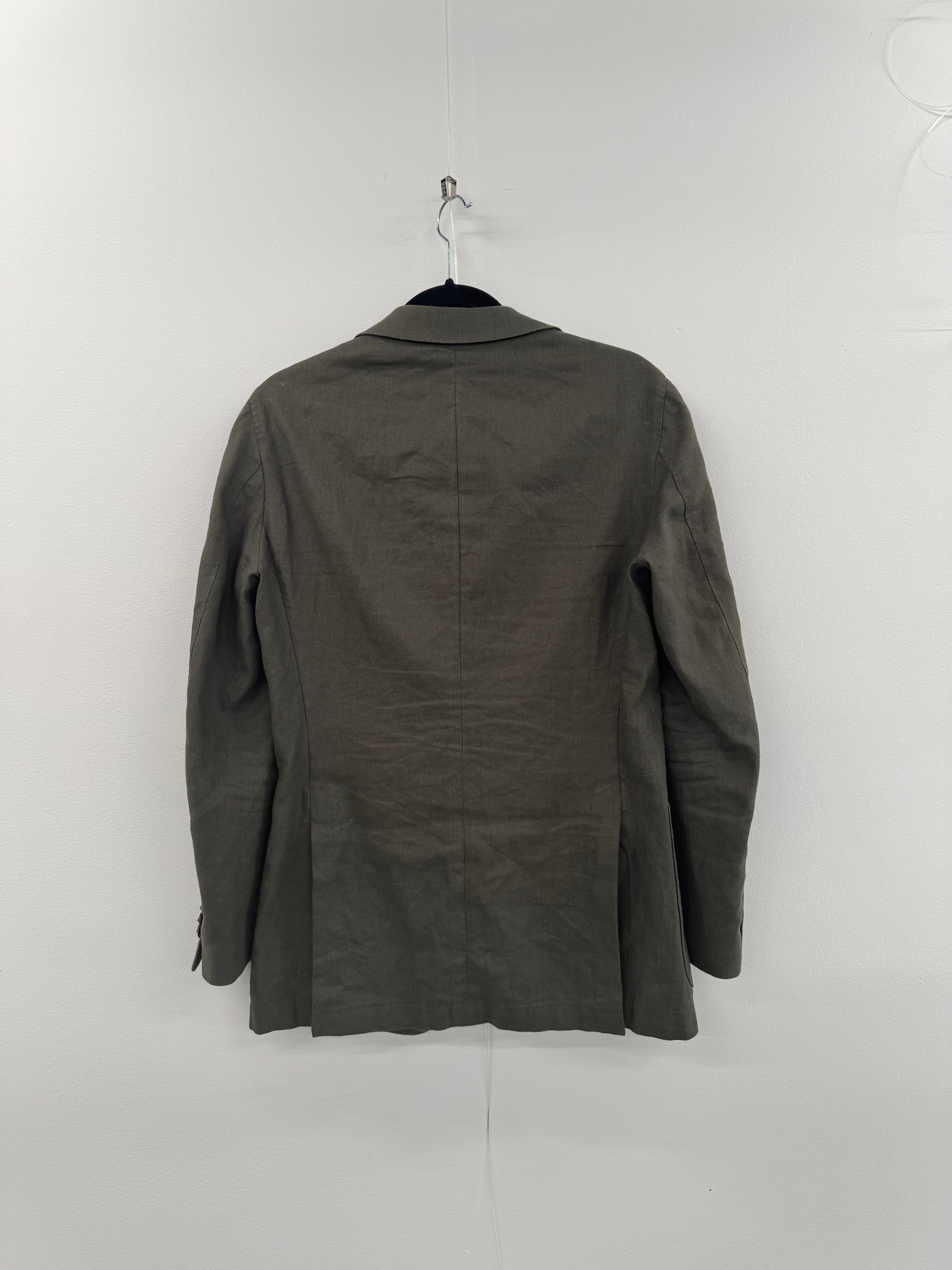 MJ Bale olive green linen blazer. Size 36, Women’s Sz 8 equivalent. Button detailing on cuffs and as front fastening slits in back. Front pockets not functional. A few marks on front right pocket but otherwise in great preloved condition.