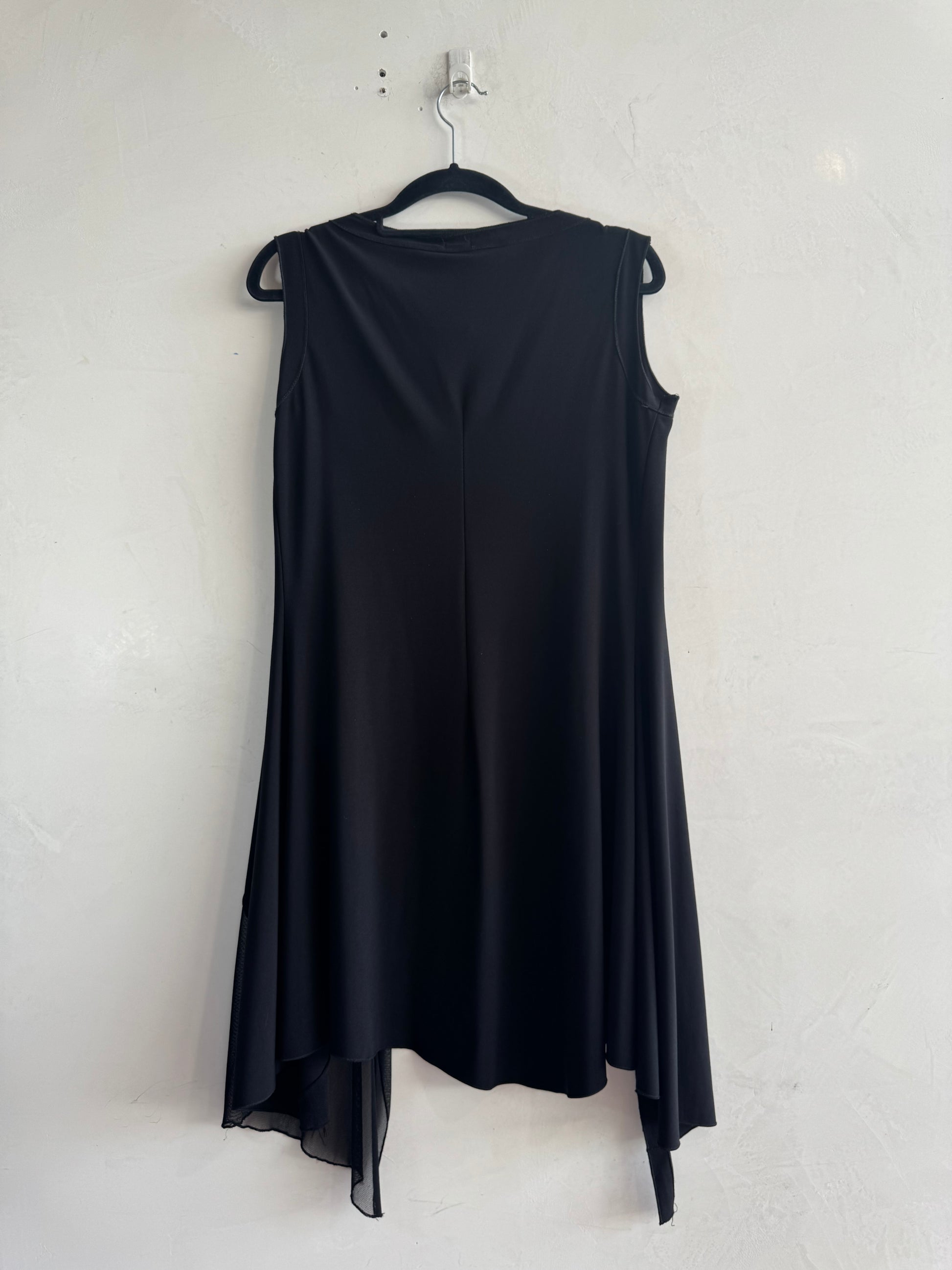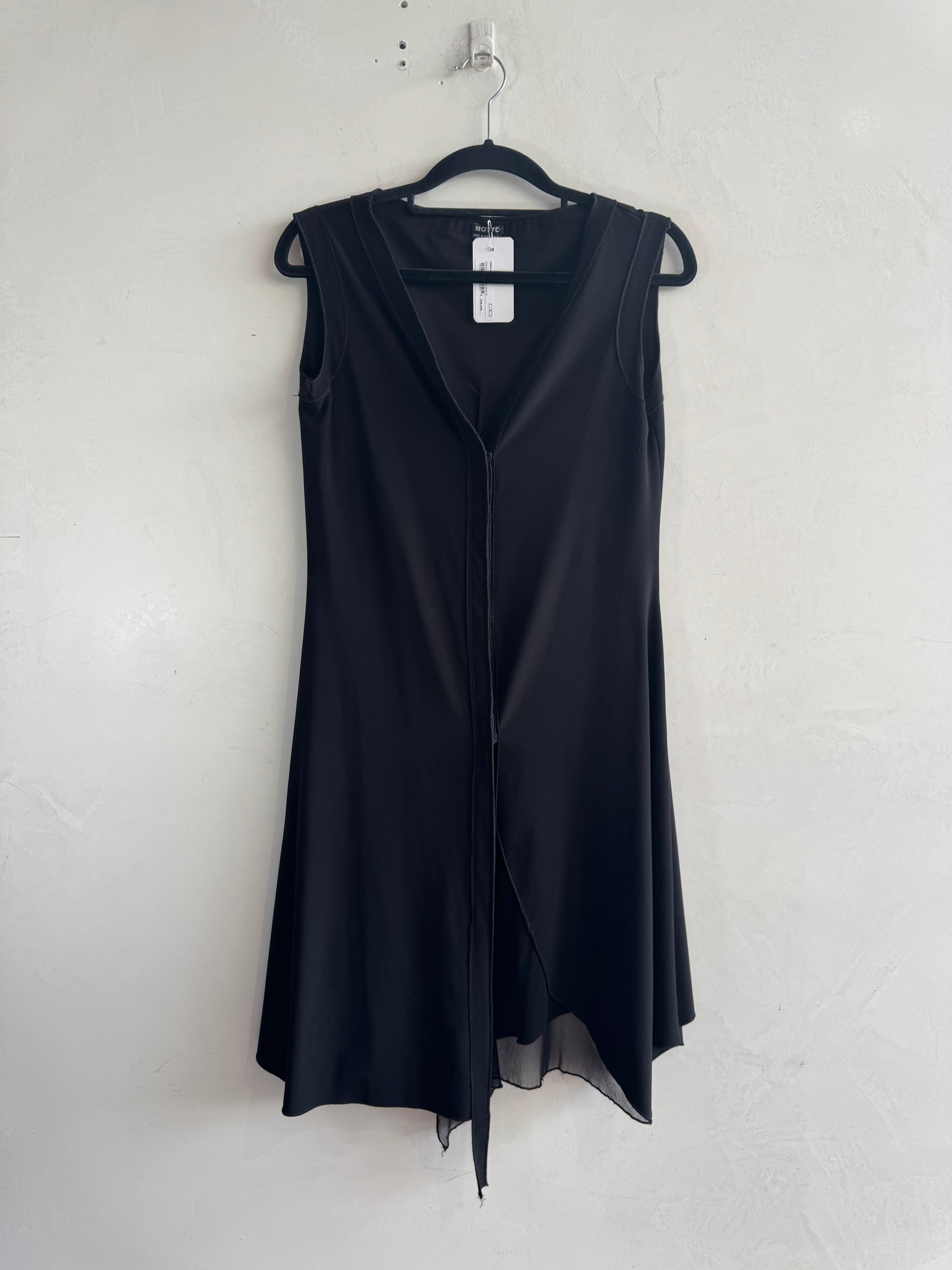 Long black vest from Motto made in Australia, features press buttons and asymmetric mesh details.