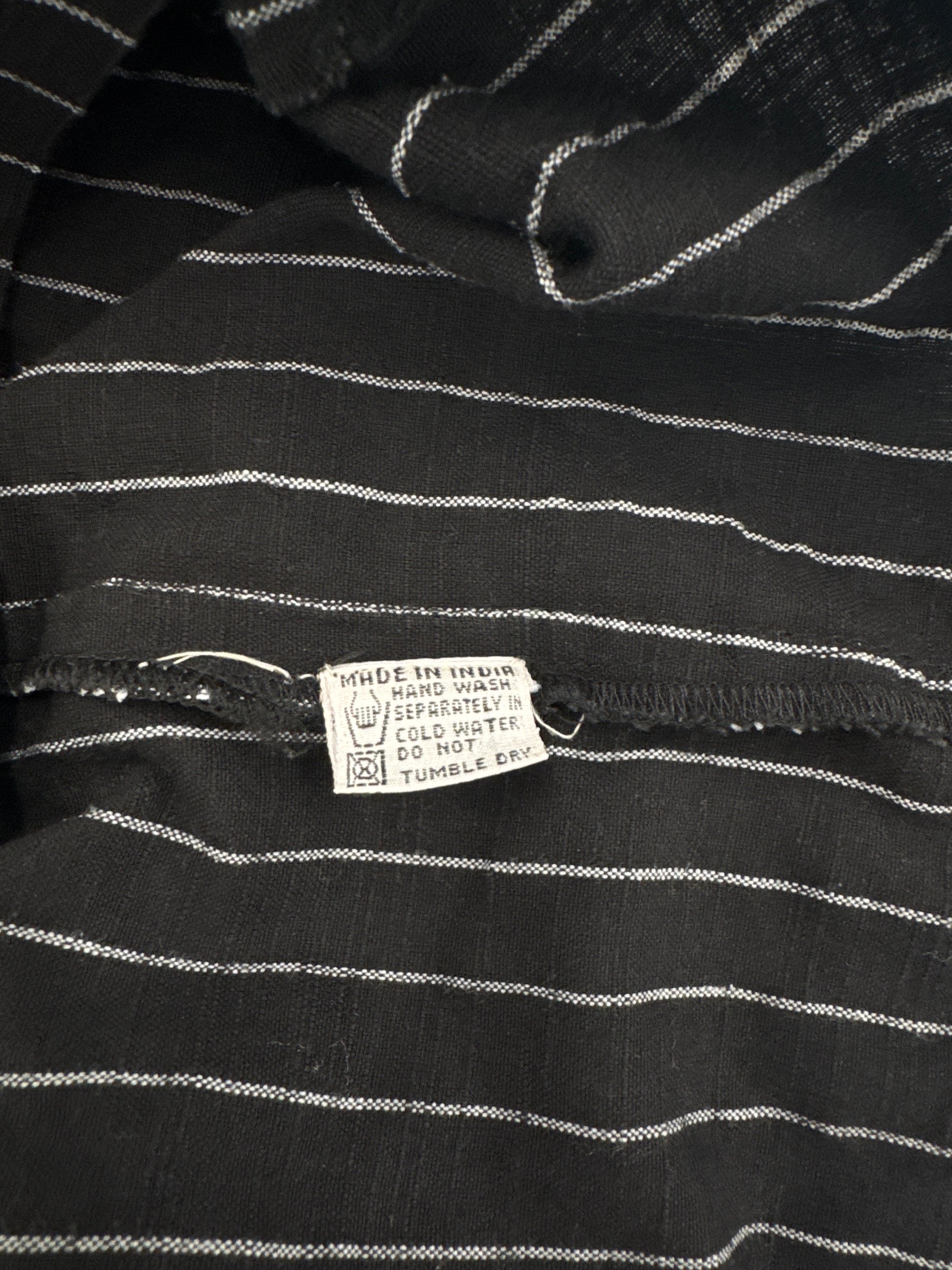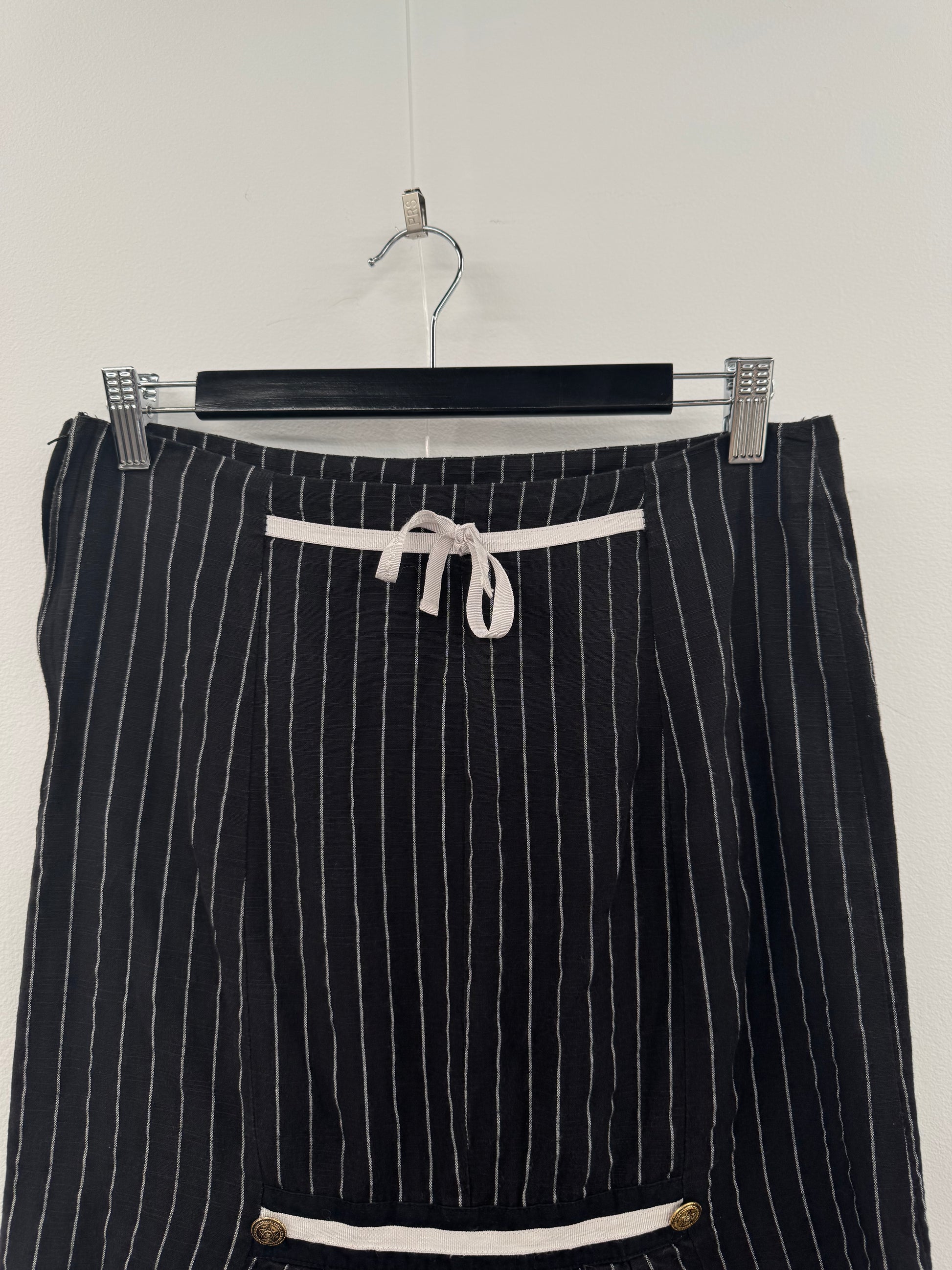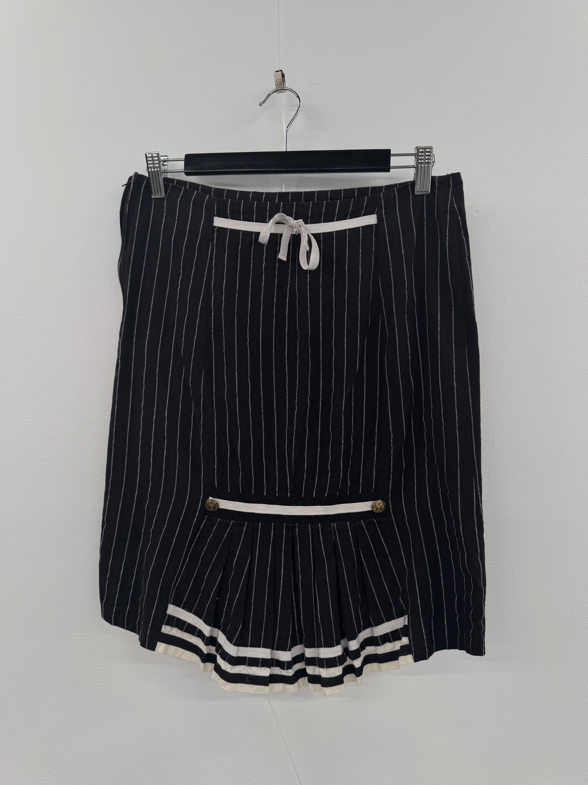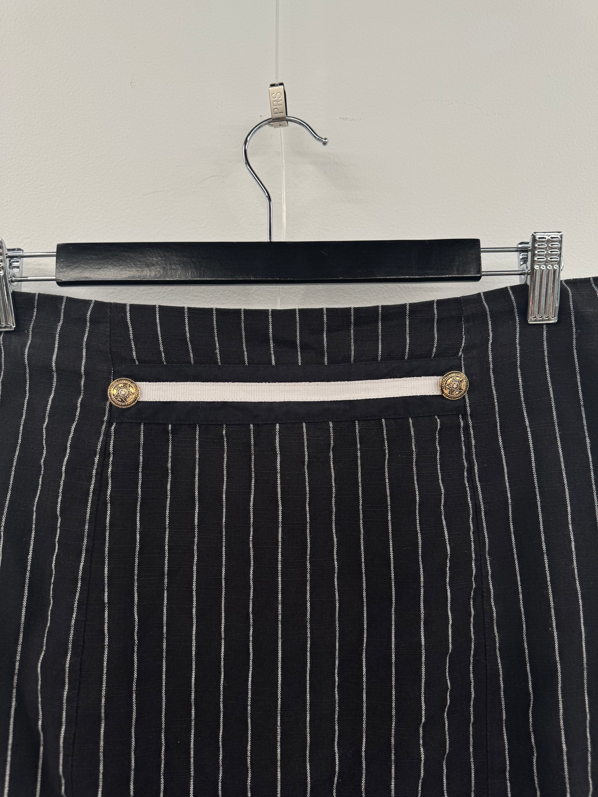 Peace Angels brand pinstripe skirt. Features pleated back details, gold vintage-style buttons and a tie at the back. Side zipper fastening. Marked size S, would best fit an au 8-10. In great preloved condition with some signs of wear, though no notable stains or faults.