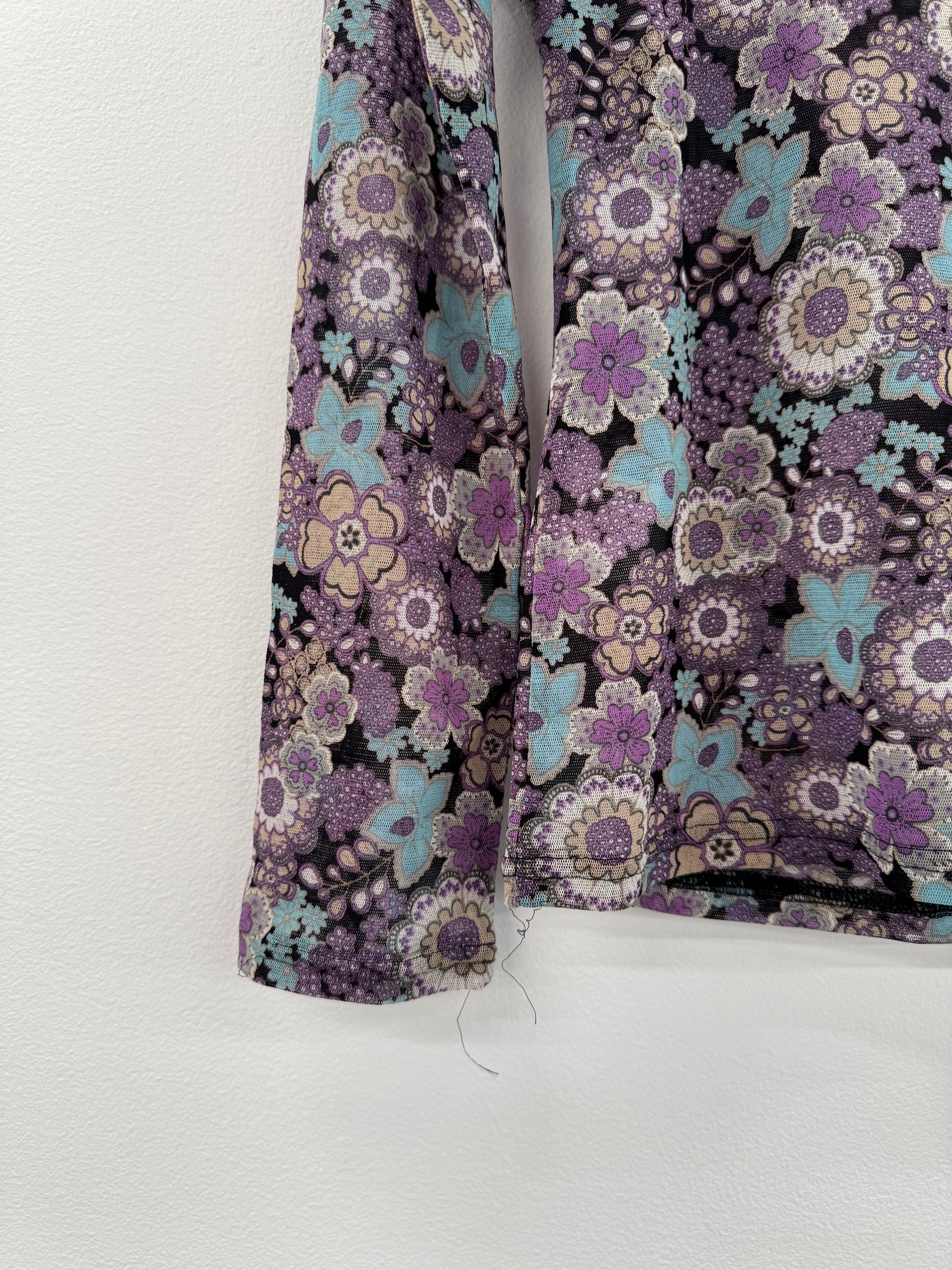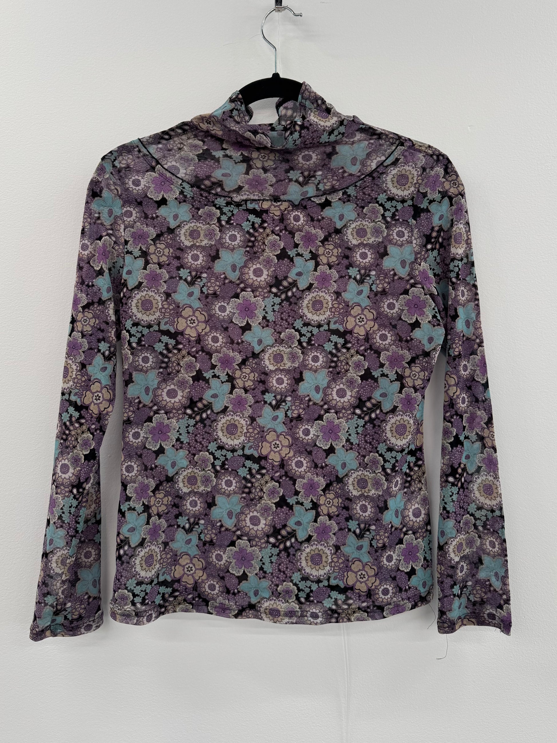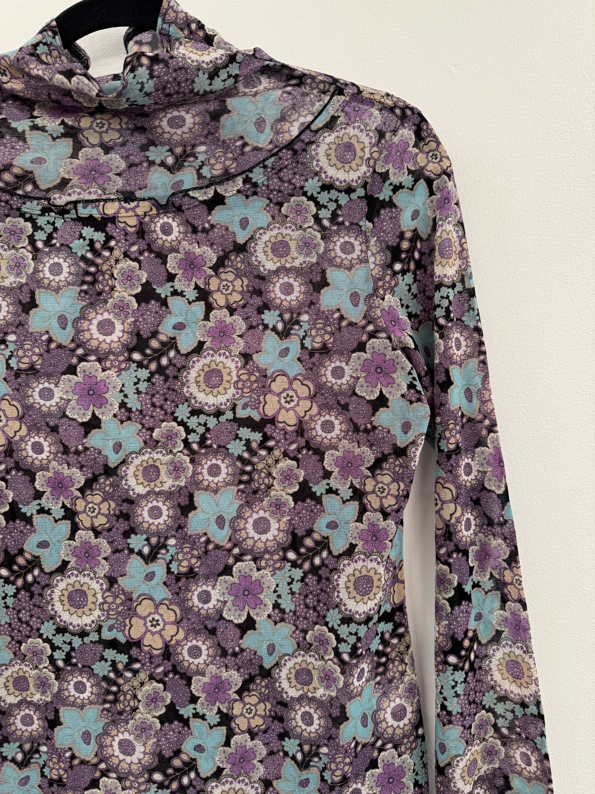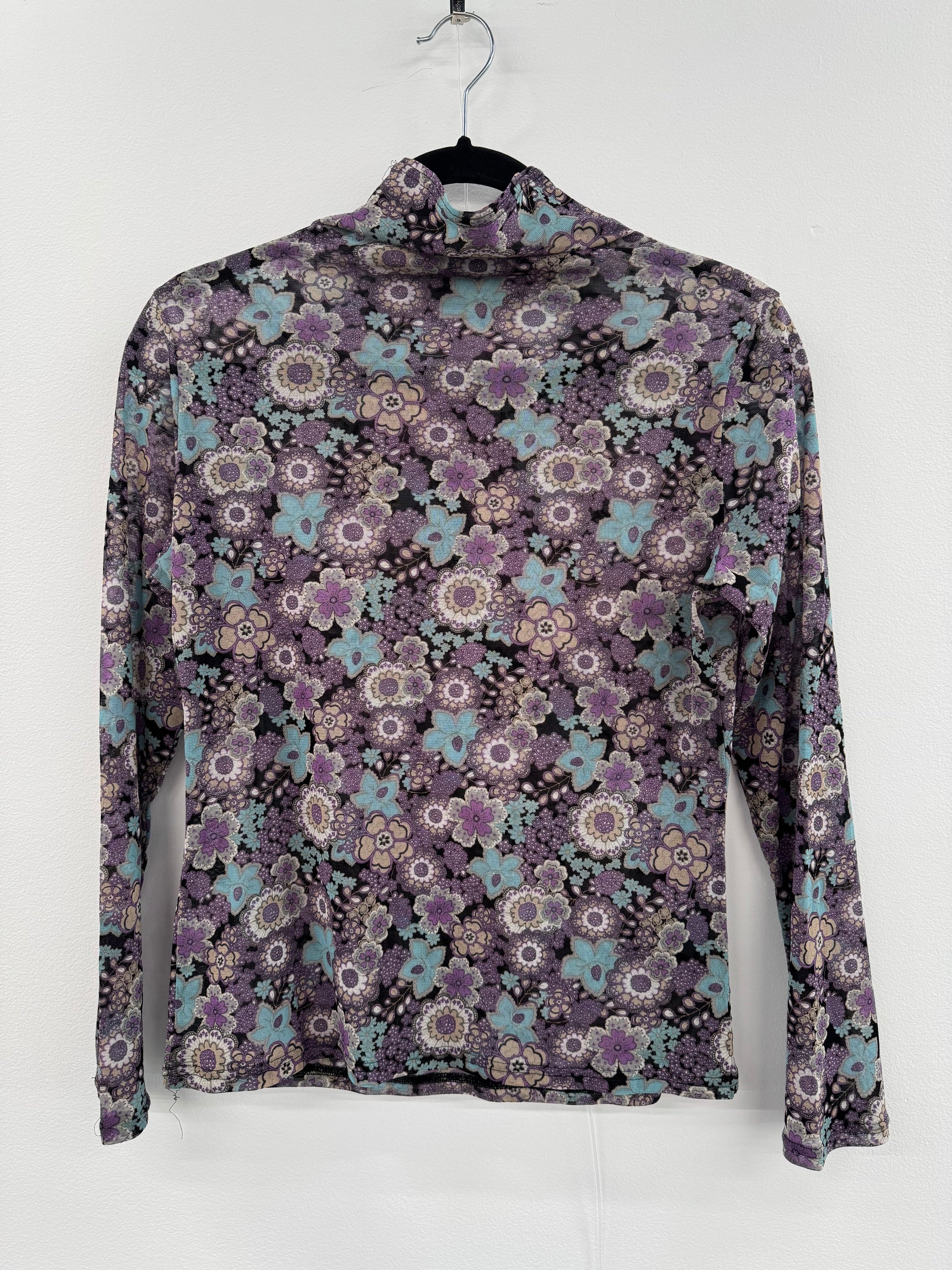 Purple mesh top with colourful blue and black print details. Height neck with sheer mesh and long sleeves. Marked size 10, top size 10 equivalent.