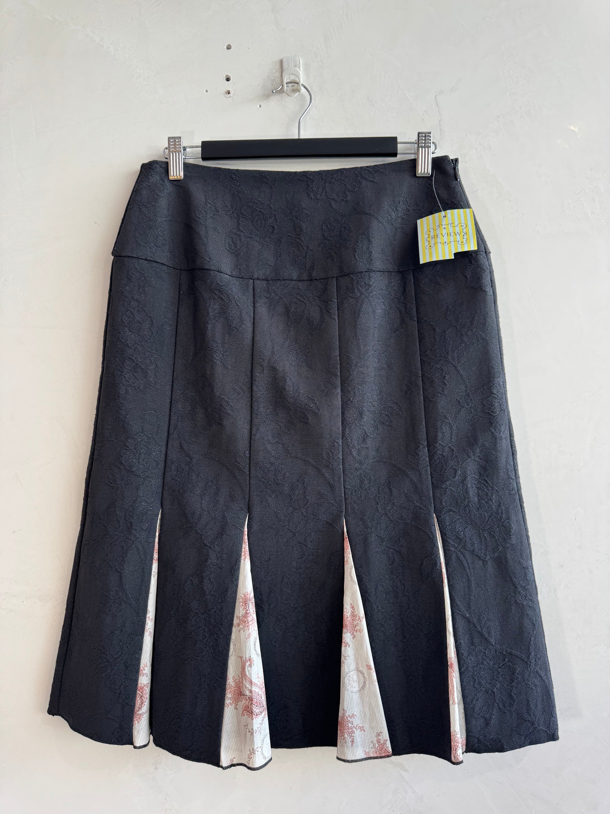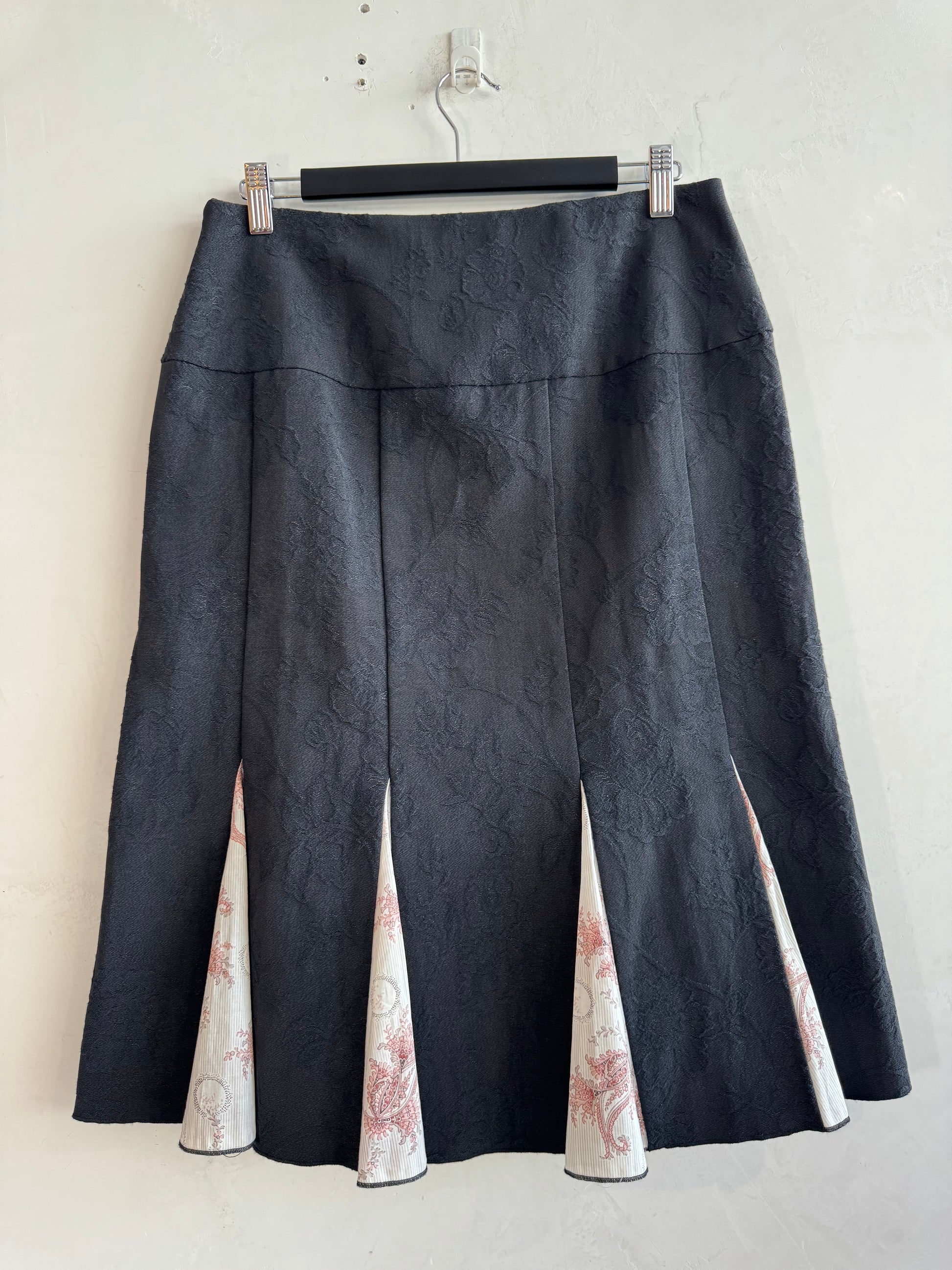Black midi panel skirt with pink paisley flares, has a invisible side zipper. New with tags.