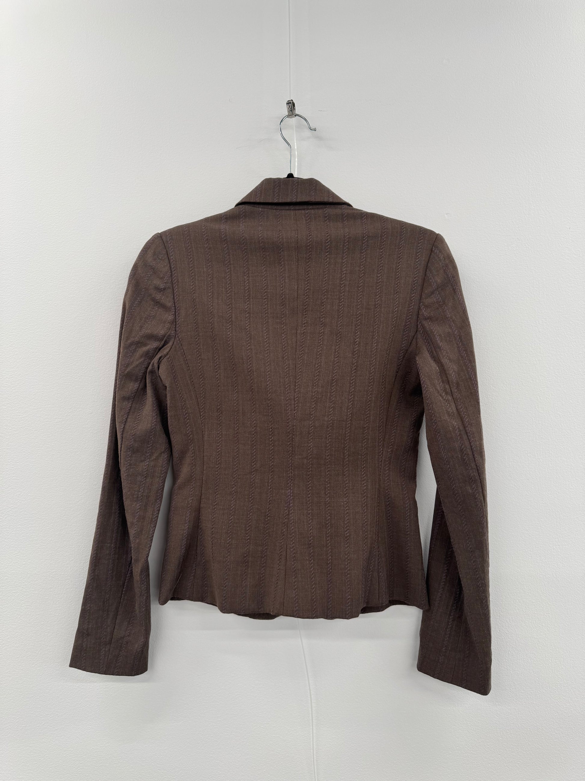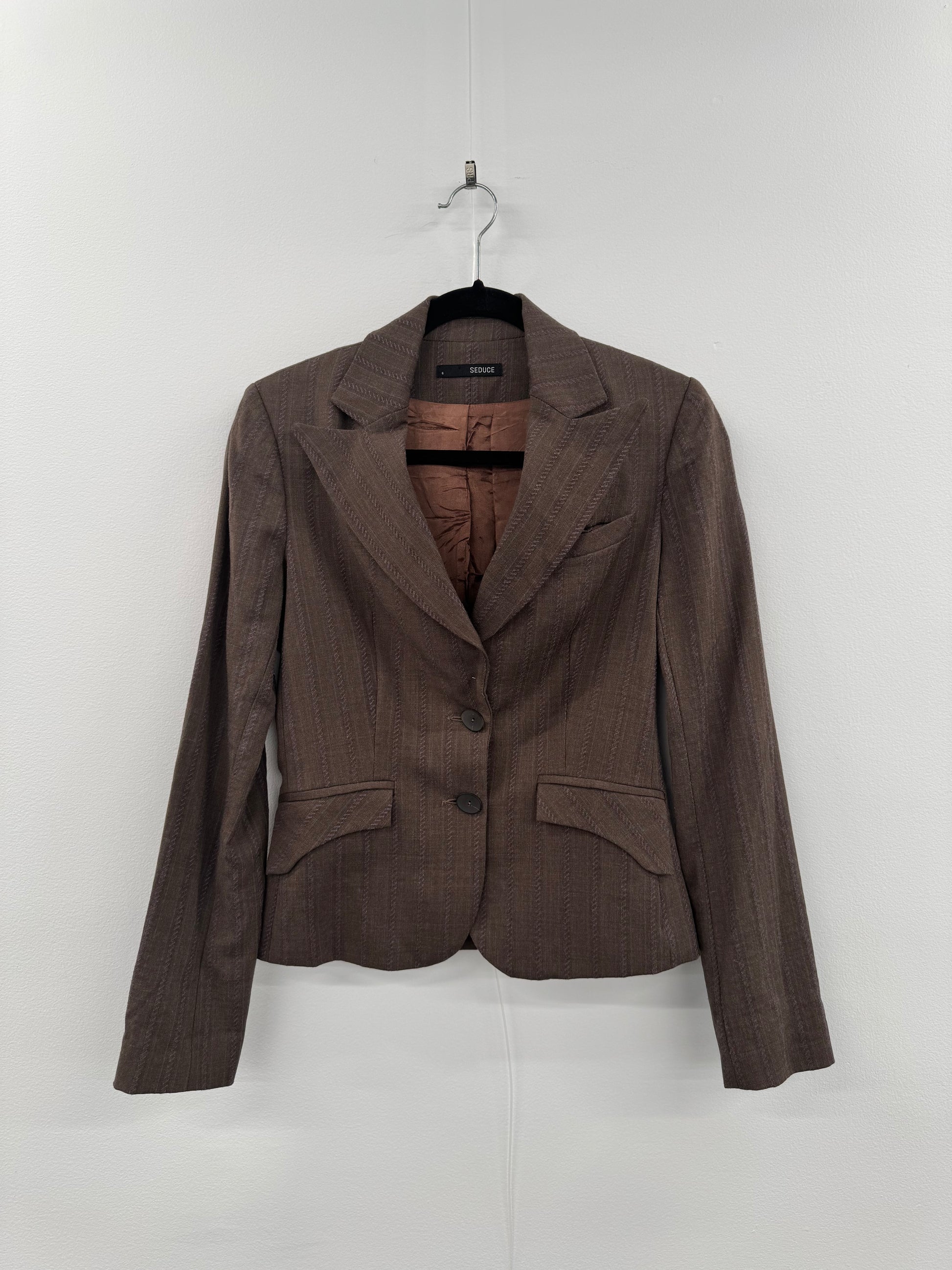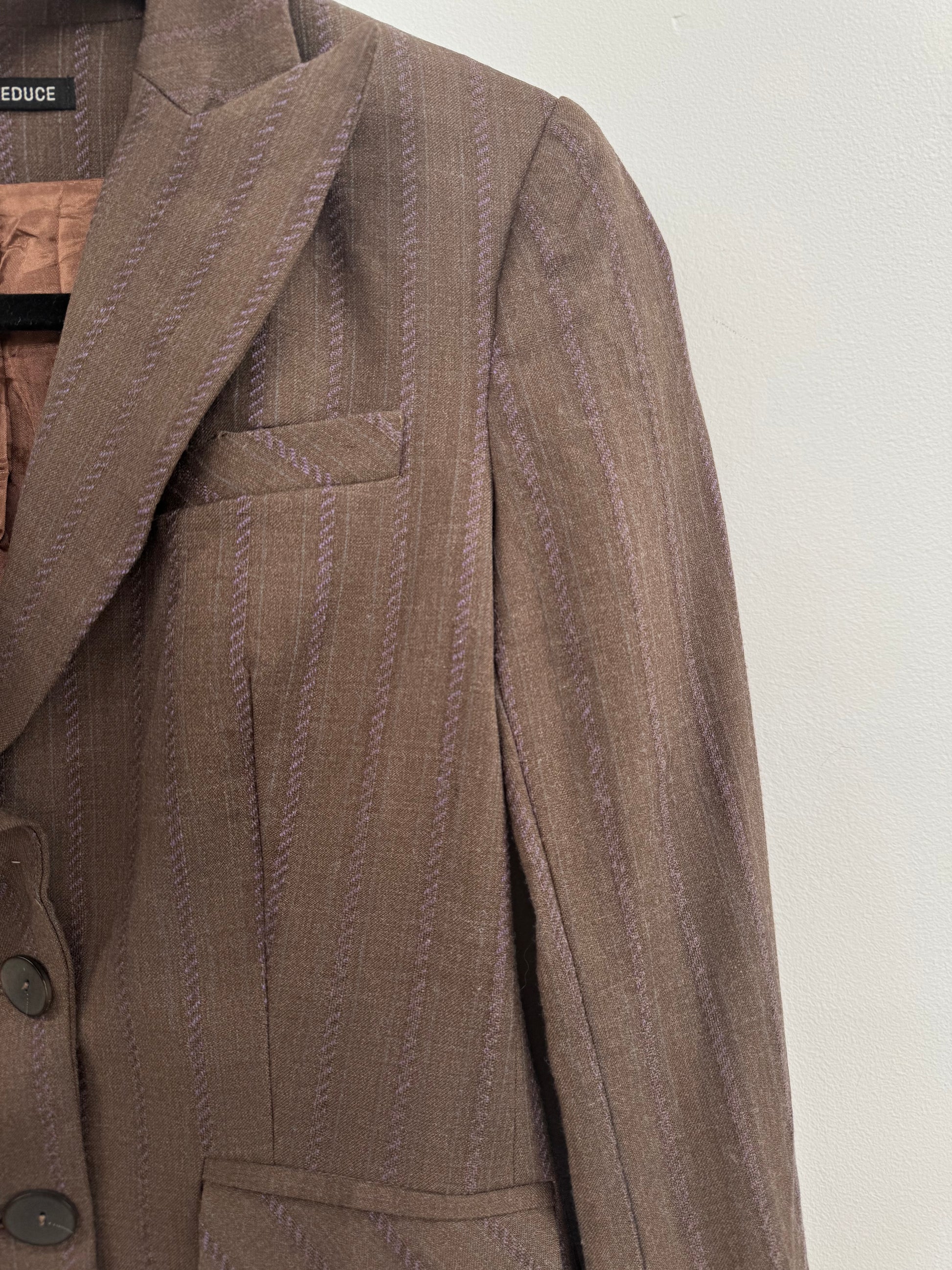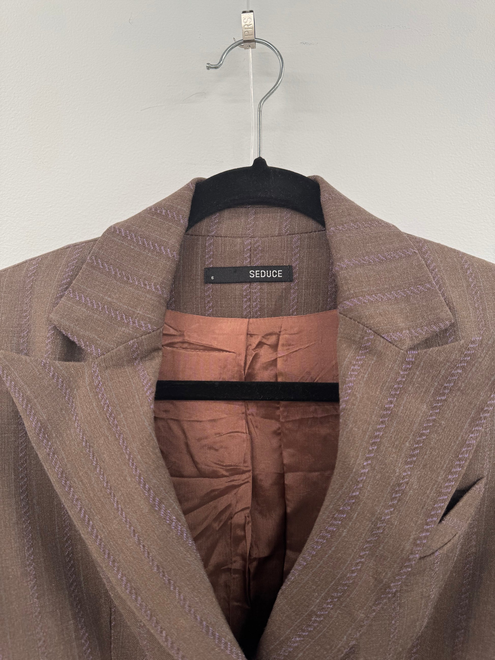 Seduce taupe Woolen jacket/blazer. Marked au 6, true to size. Taupe colouring with pale purple stripes. Features button up front and two front pockets. In great vintage condition, no notable stains or marks.