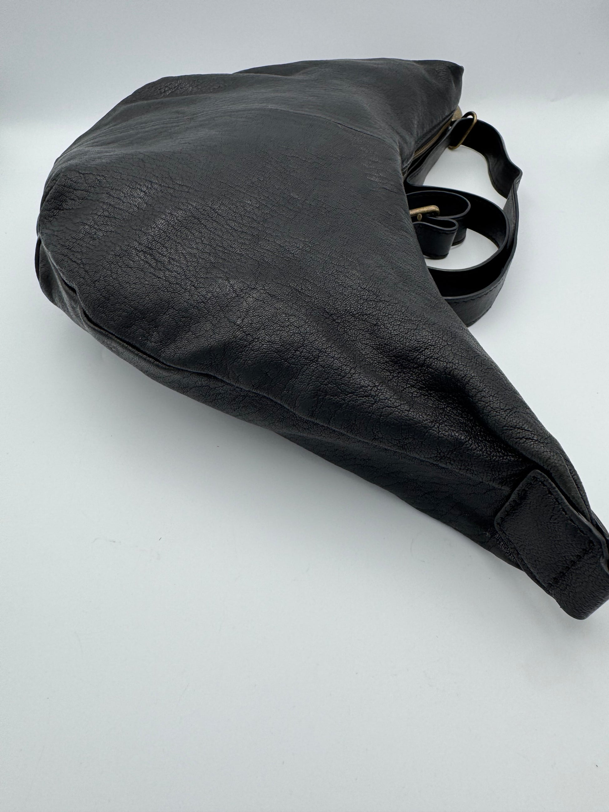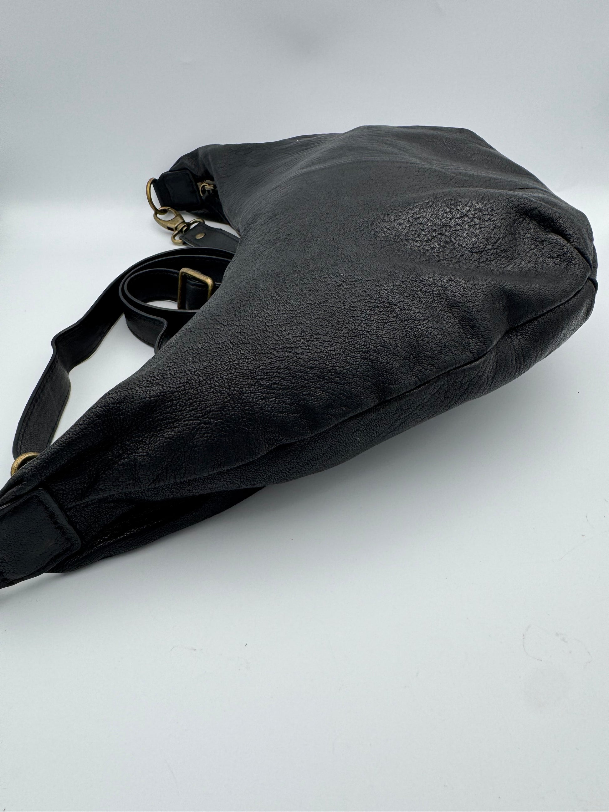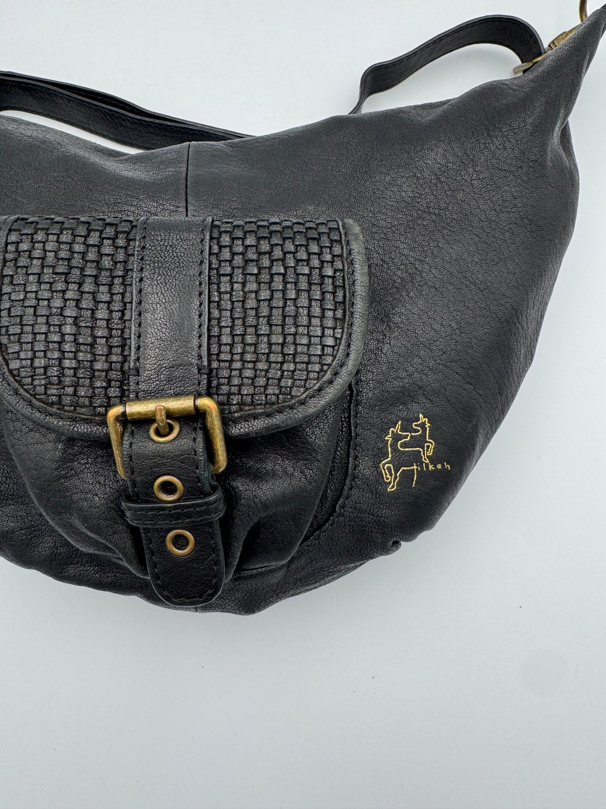 Tilkah Black Leather Sling bag with Dark Gold Tone Hardware and Zipper Closure.