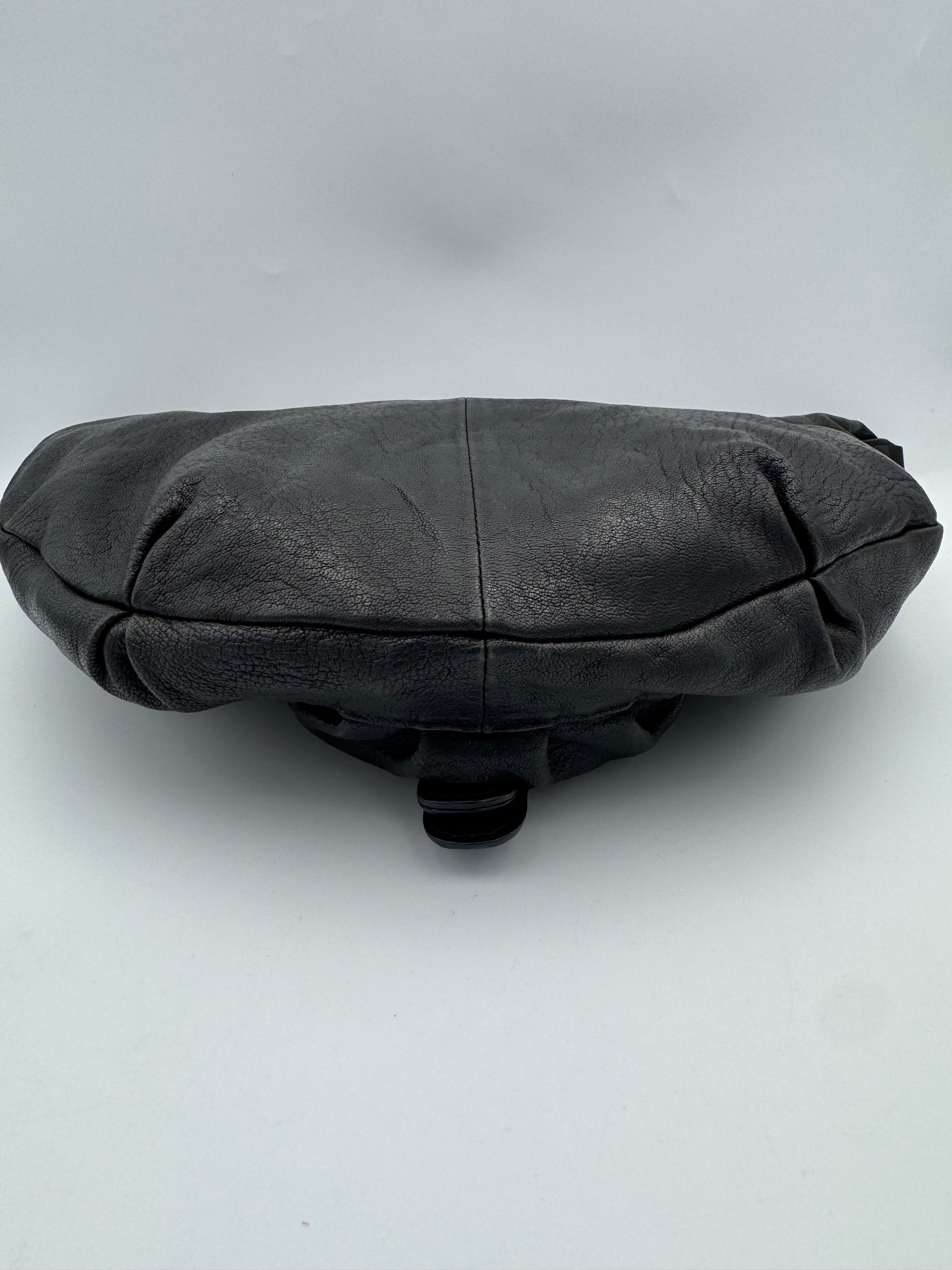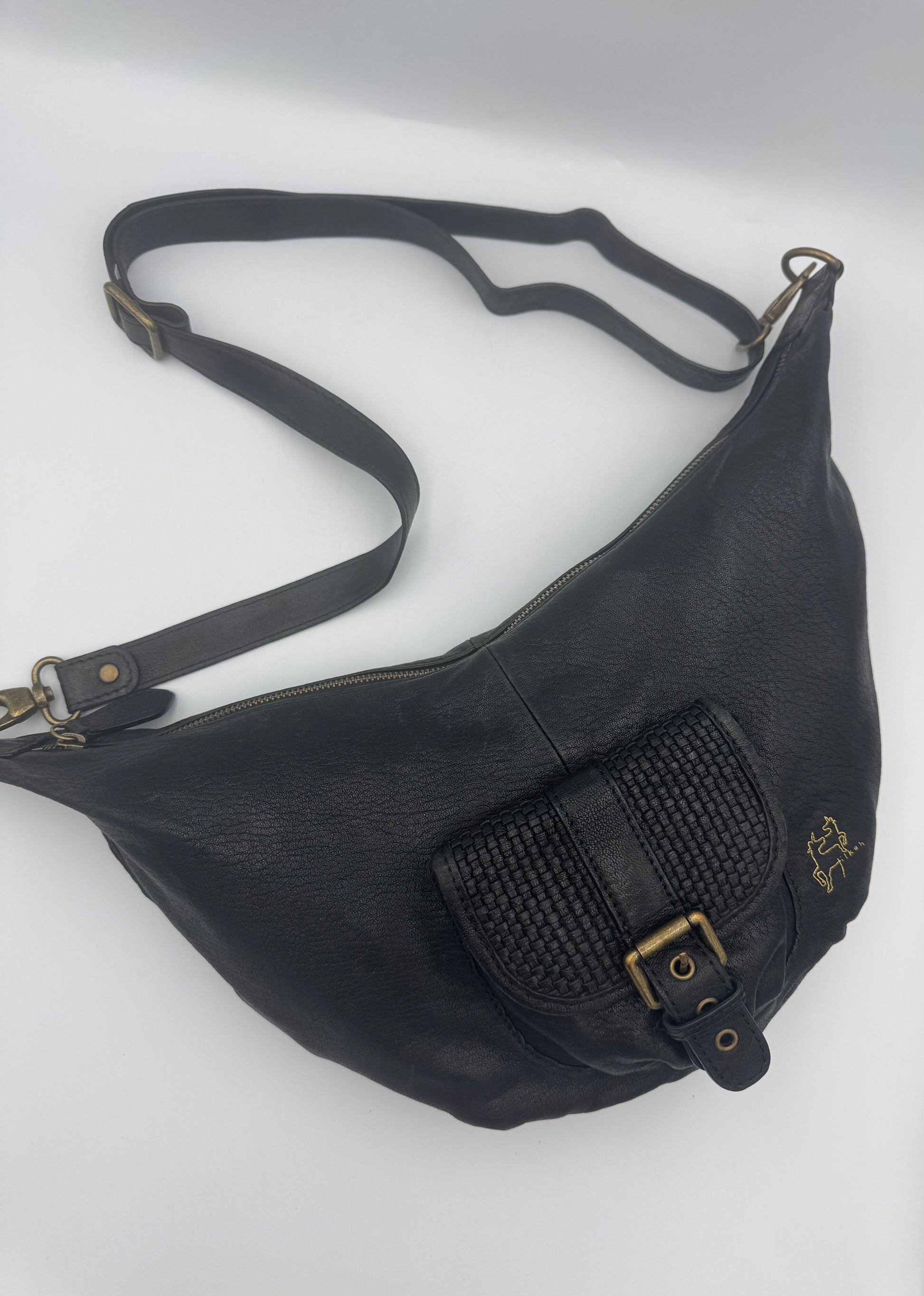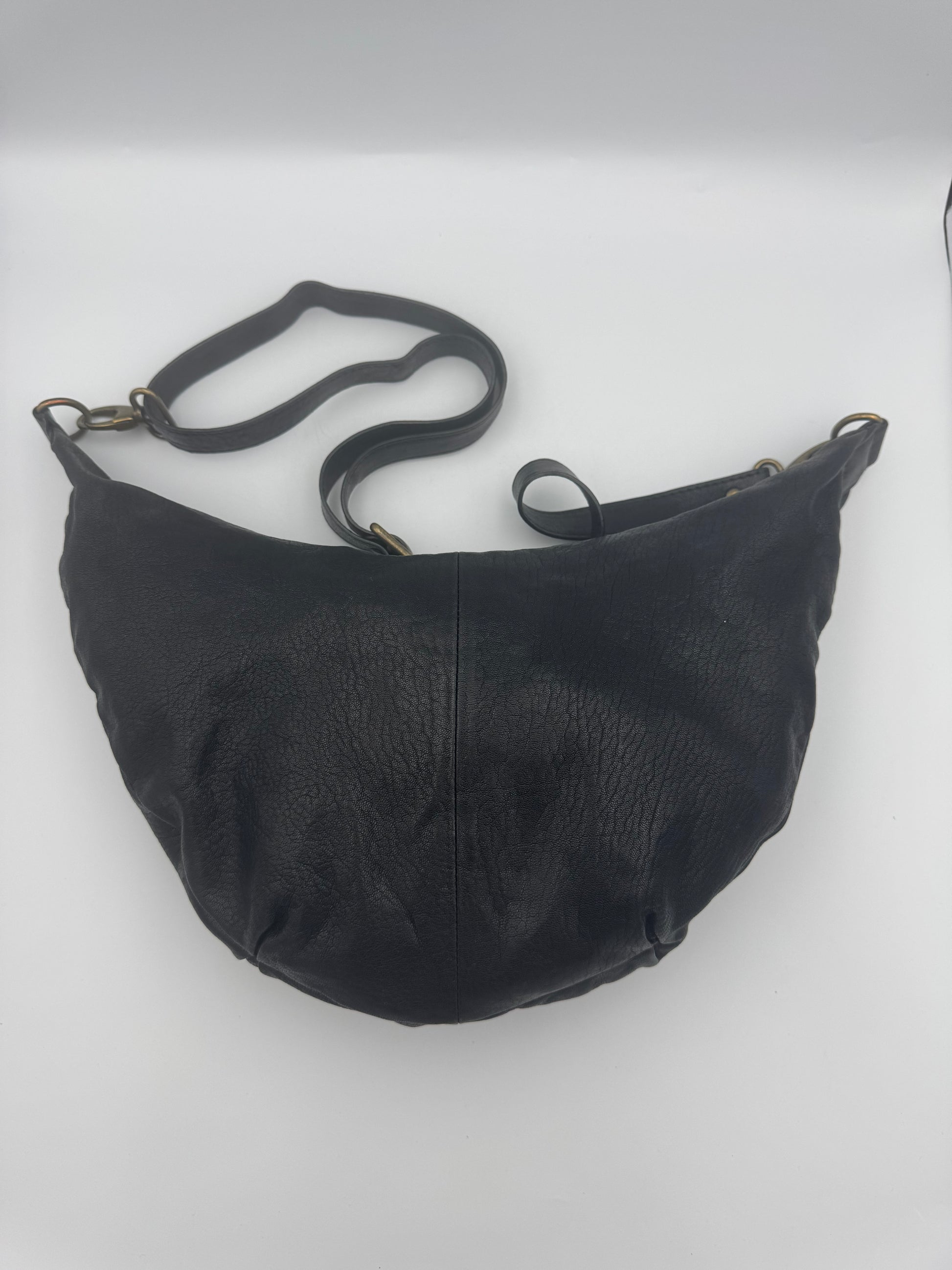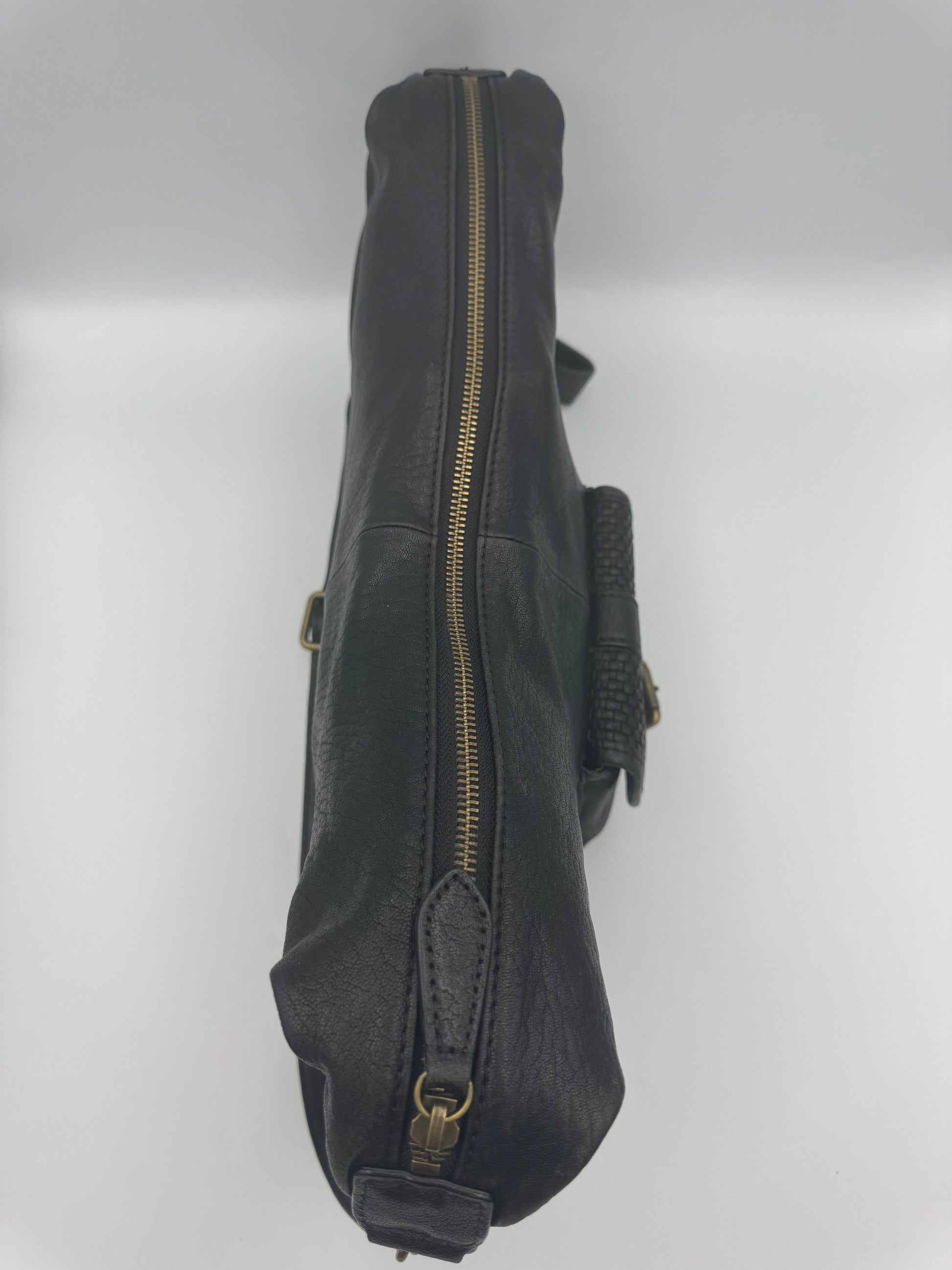 Tilkah Black Leather Sling bag with Dark Gold Tone Hardware and Zipper Closure.