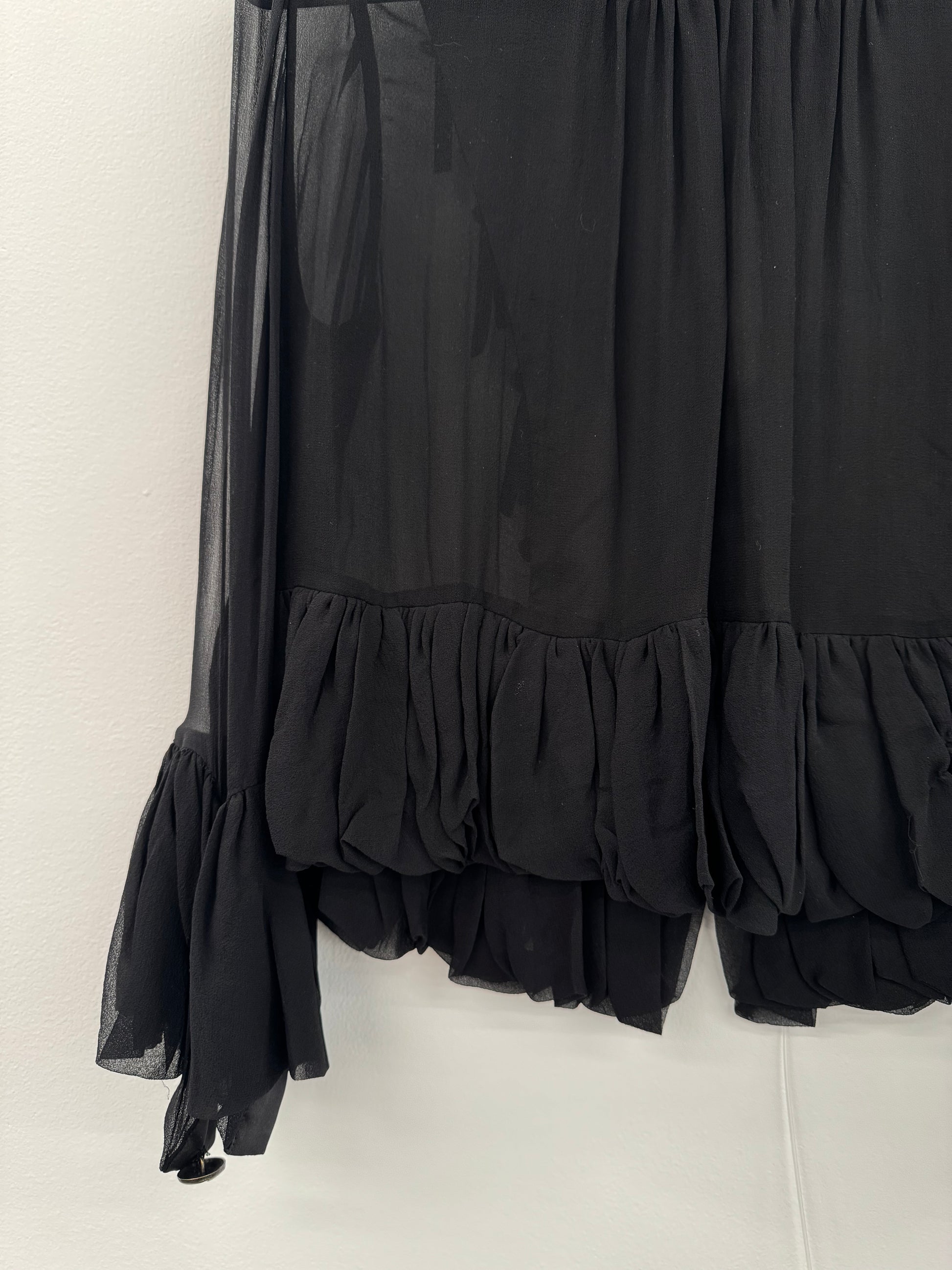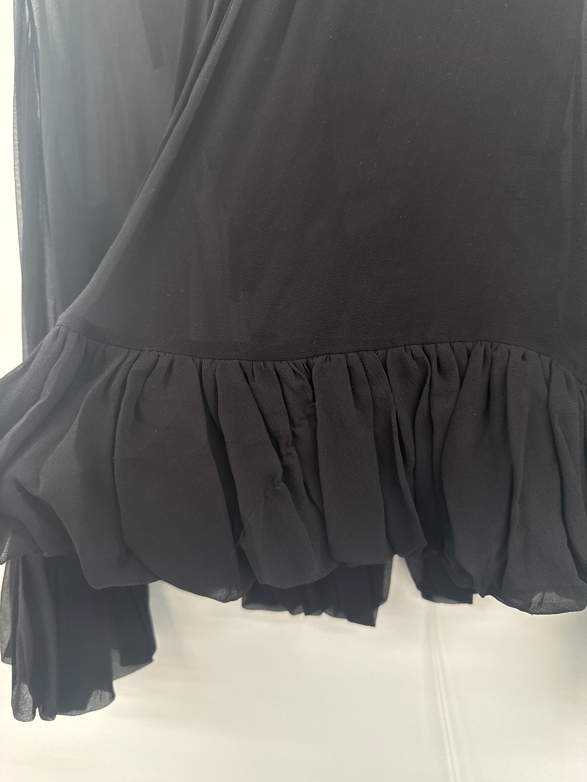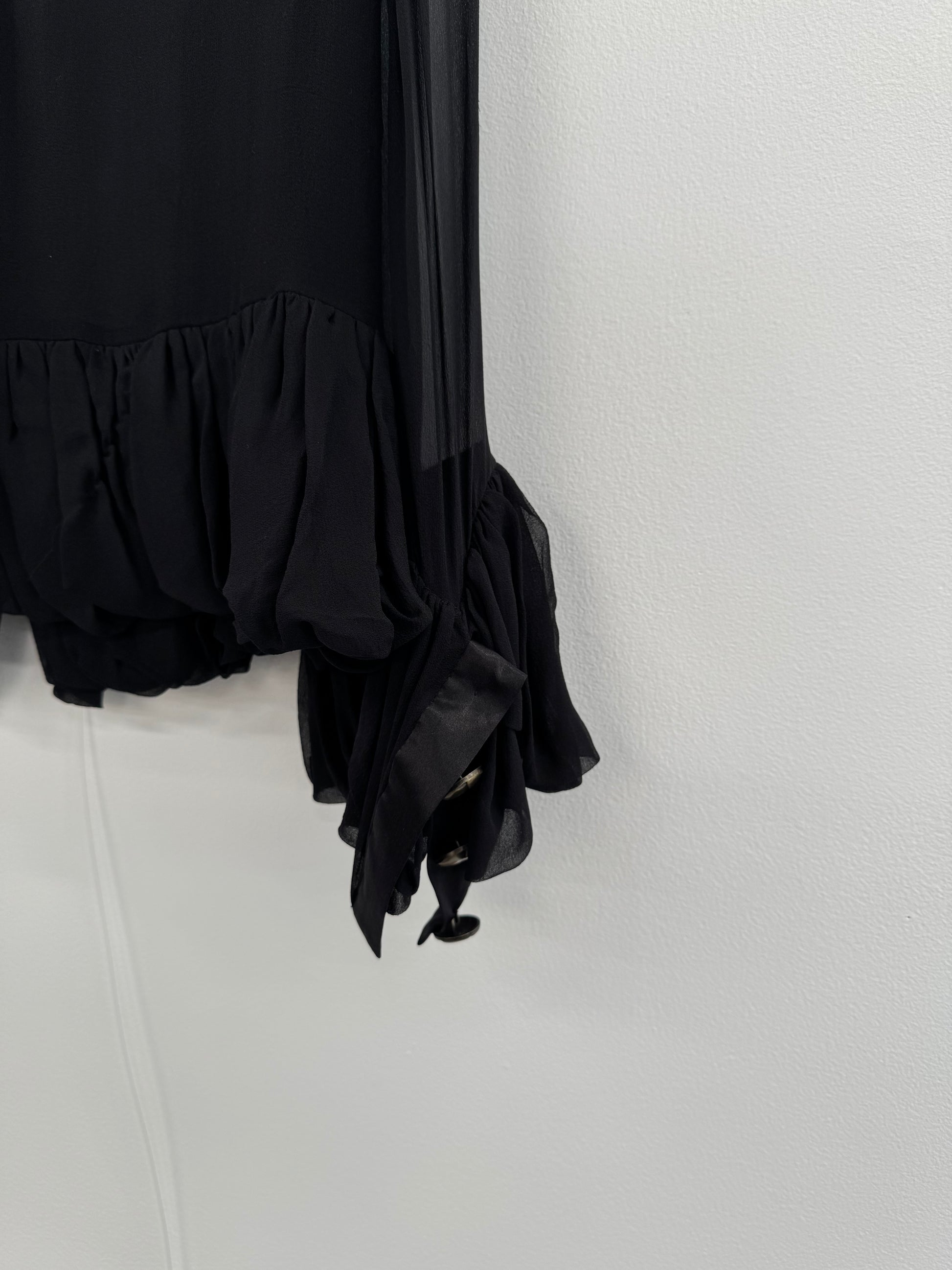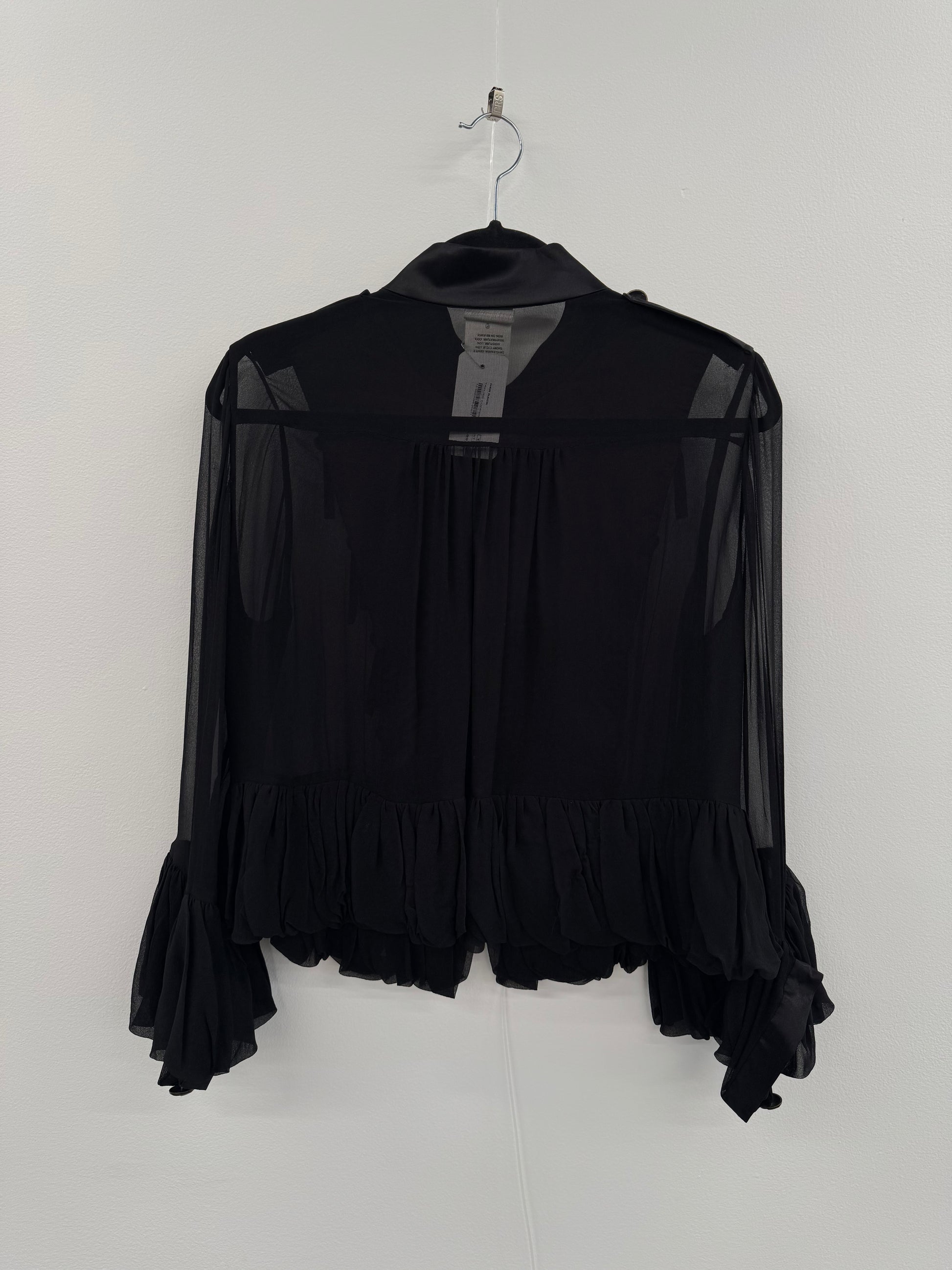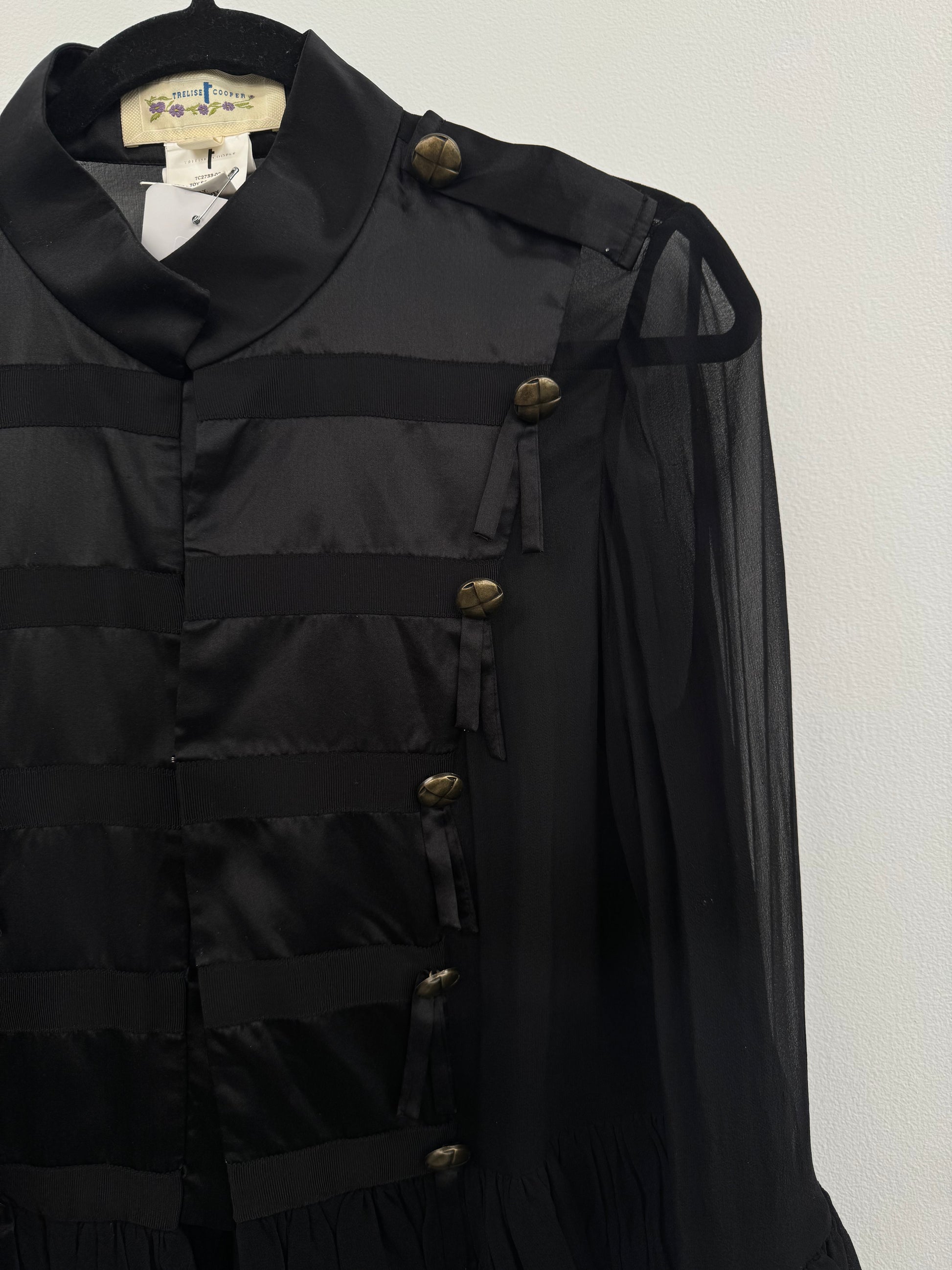 Labelled size 14, suited for women’s 10-12. 100% silk. Military style, brass button detailing down the front and sleeve cuffs. Gathered silk frills lining bottom hem of body and flared sleeves. Clasp fastening down the front as pictured.