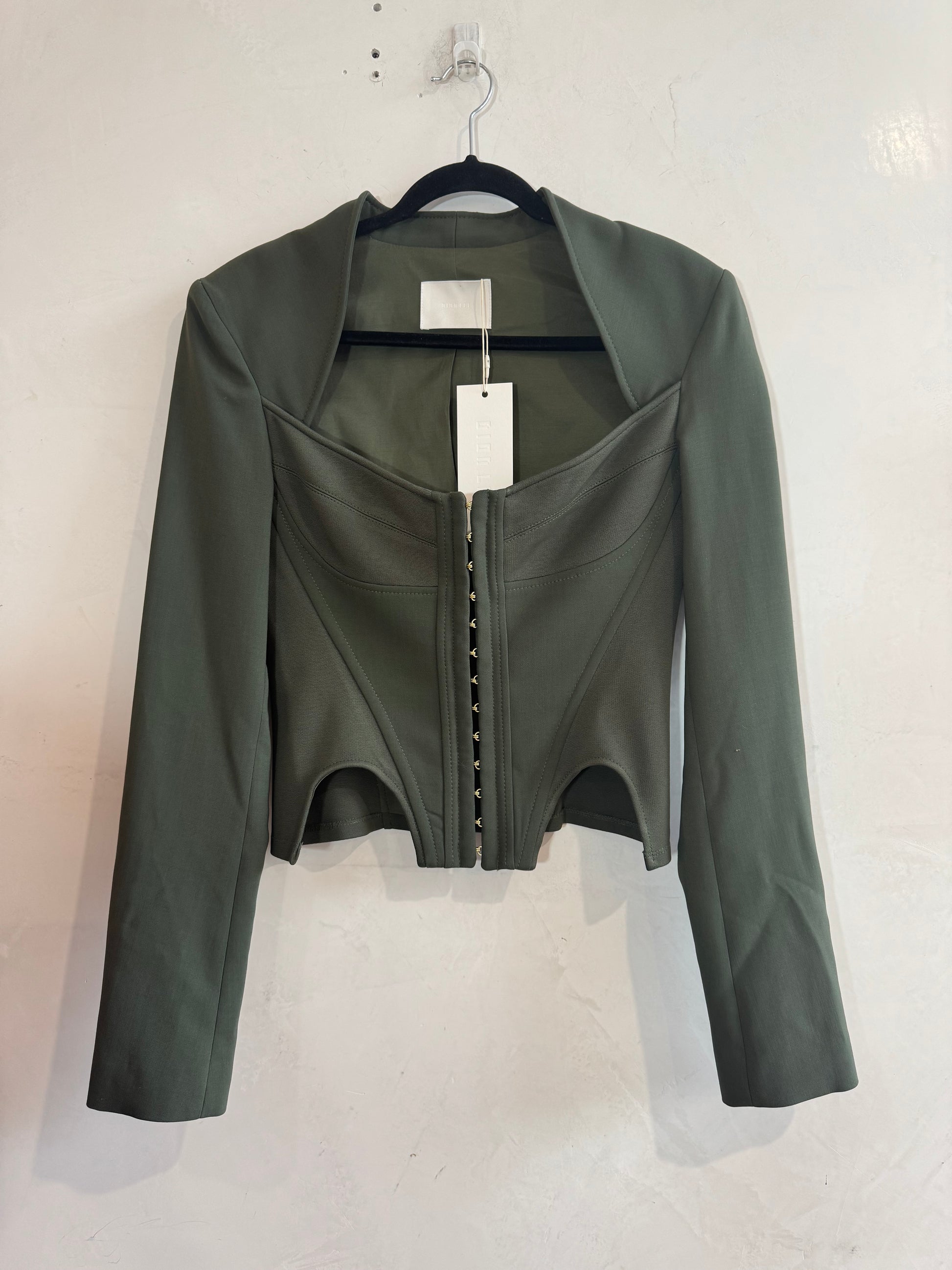 Light compact wool arch bustier from Dion Lee in Shadow green. Features hook and eye closures at the front. New with tags