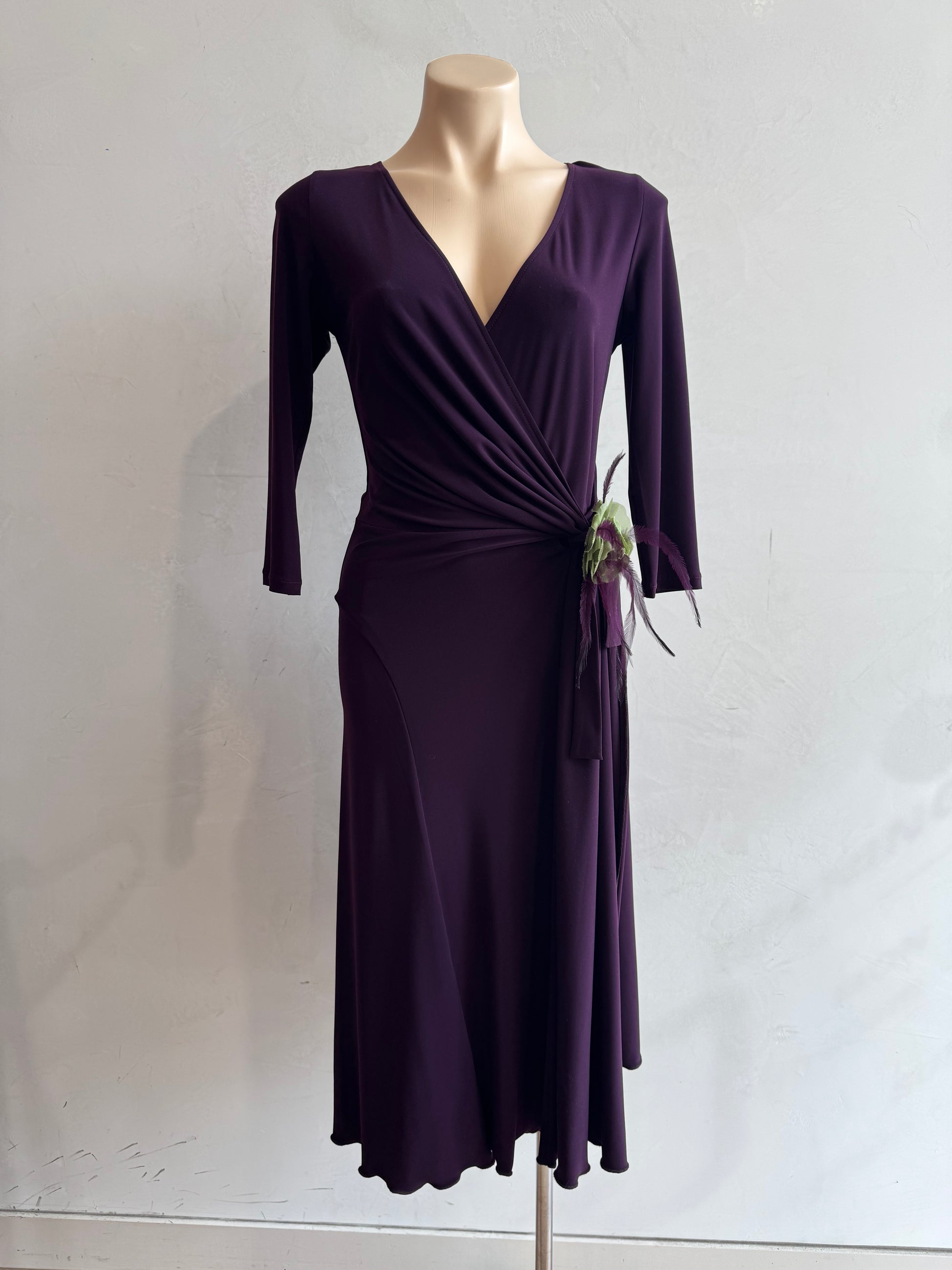 Purple wrap dress with long sleeves from Gerry Shaw.comes with a flower broach from Petal