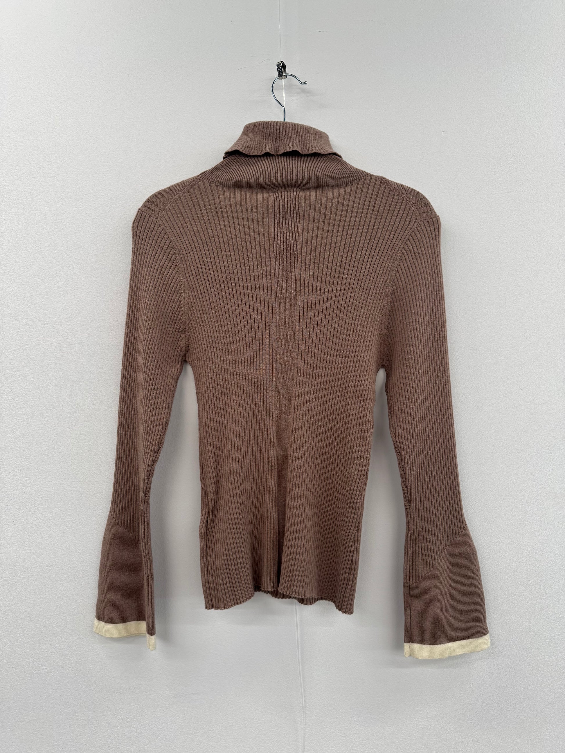 Varley Beige turtleneck sweater. Size M, suitable for AU 10. Features flare sleeves with cream trim. Ribbed knit with varying textures and fold over neckline.