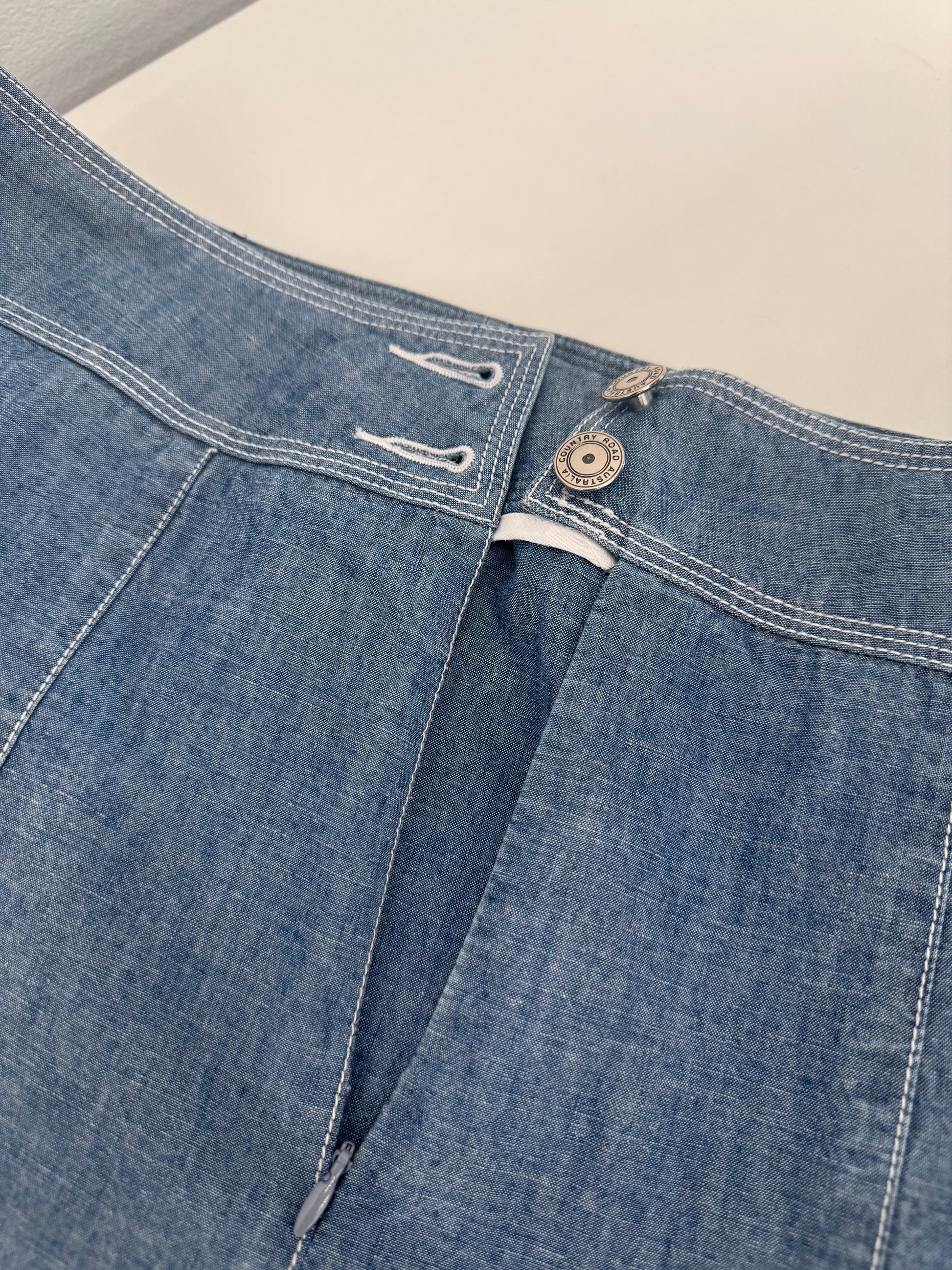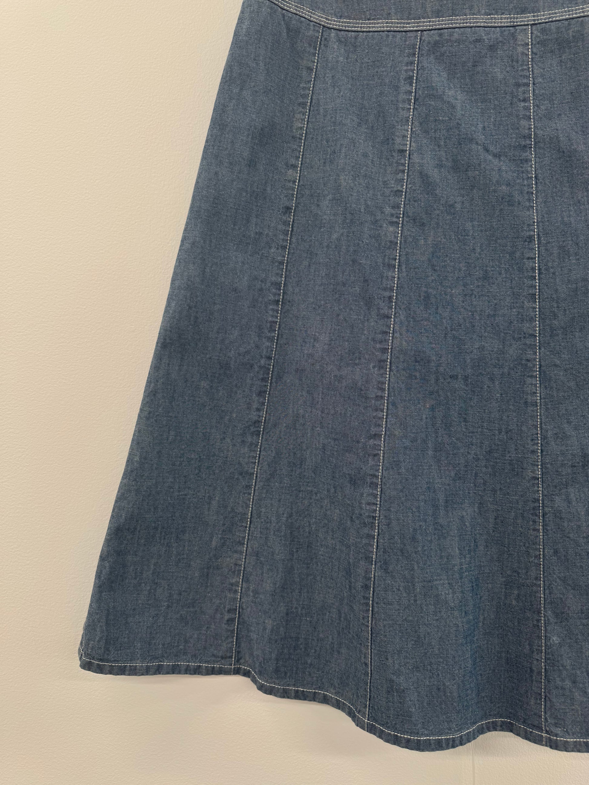 Vintage Country Road chambray skirt. Features top white top stitching and chambray panelling. Zipper and embellished button fastening on side. In great vintage condition, no notable marks or faults.