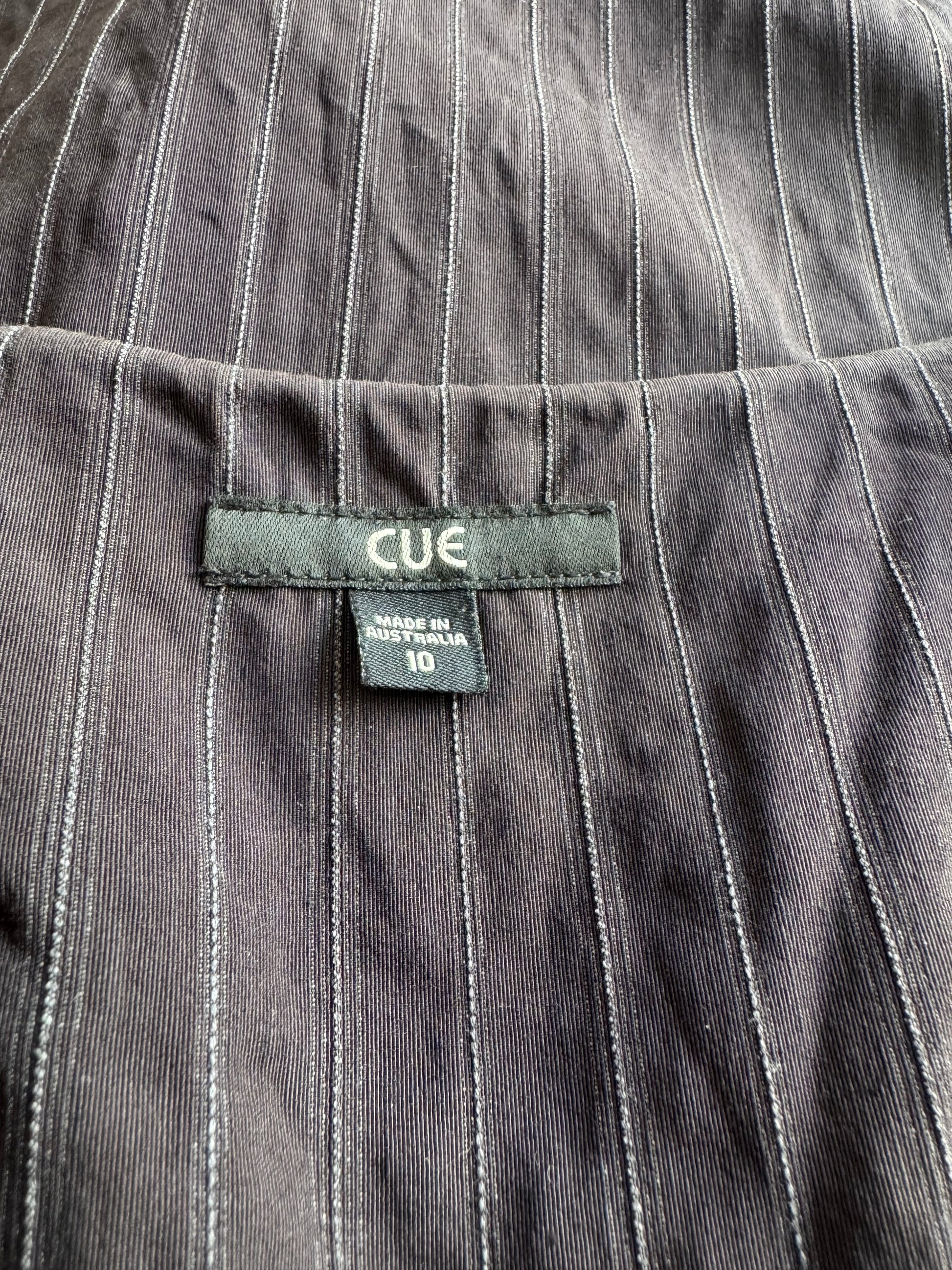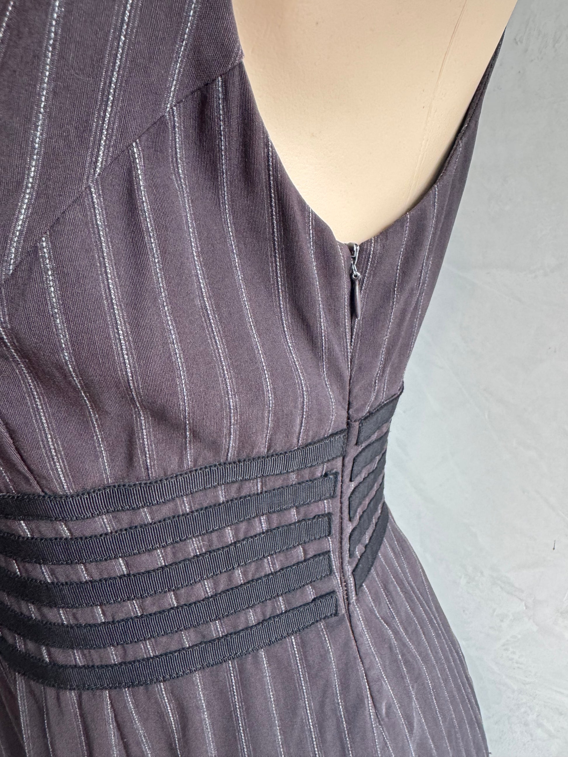 Vintage brown dress from Cue with grey stripes and black waist ribbon accents. It is Princess cut with V-neck collar and side zip.