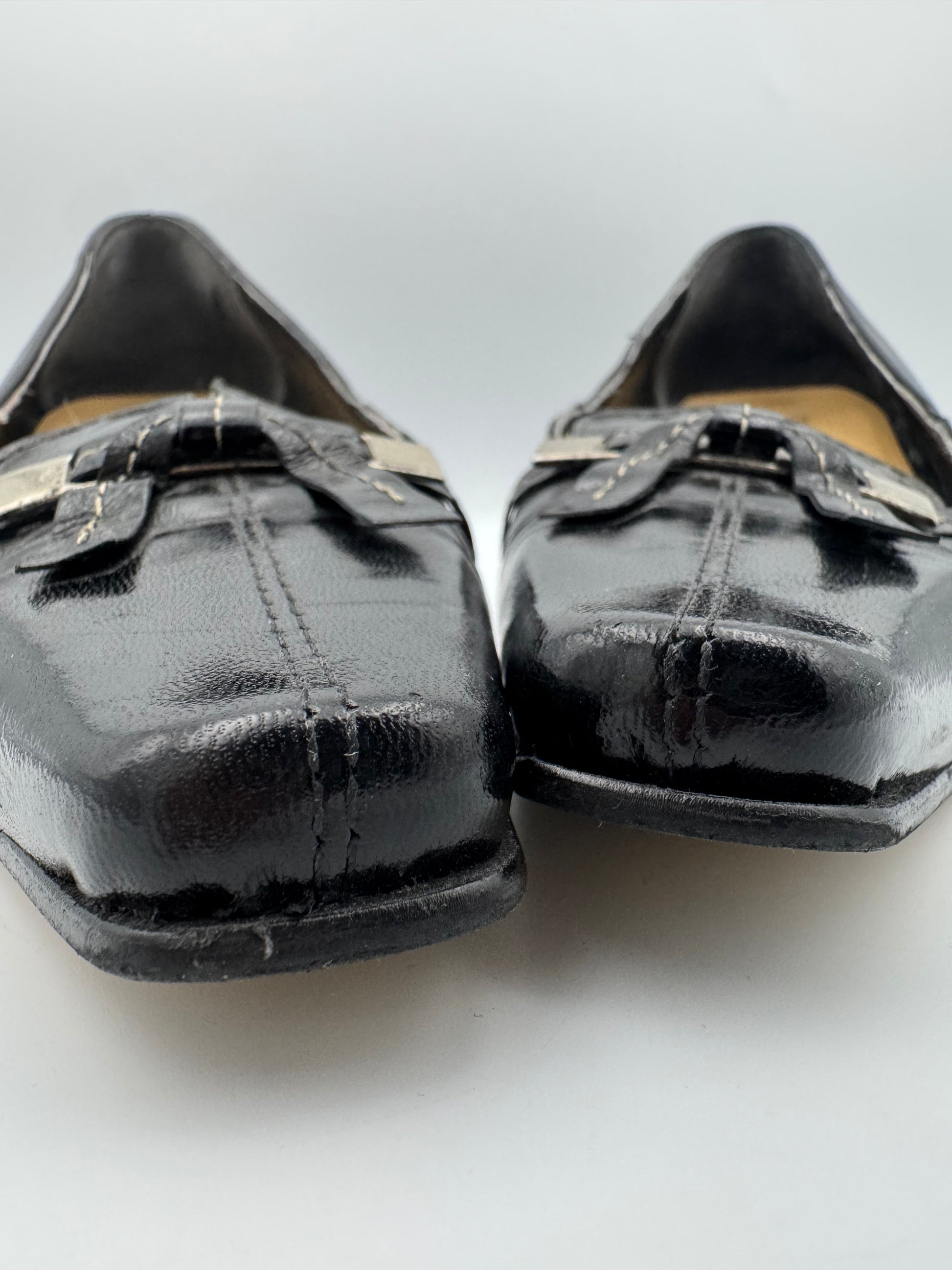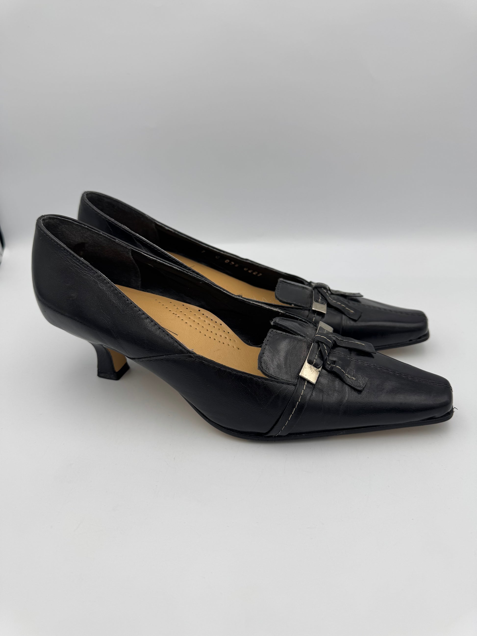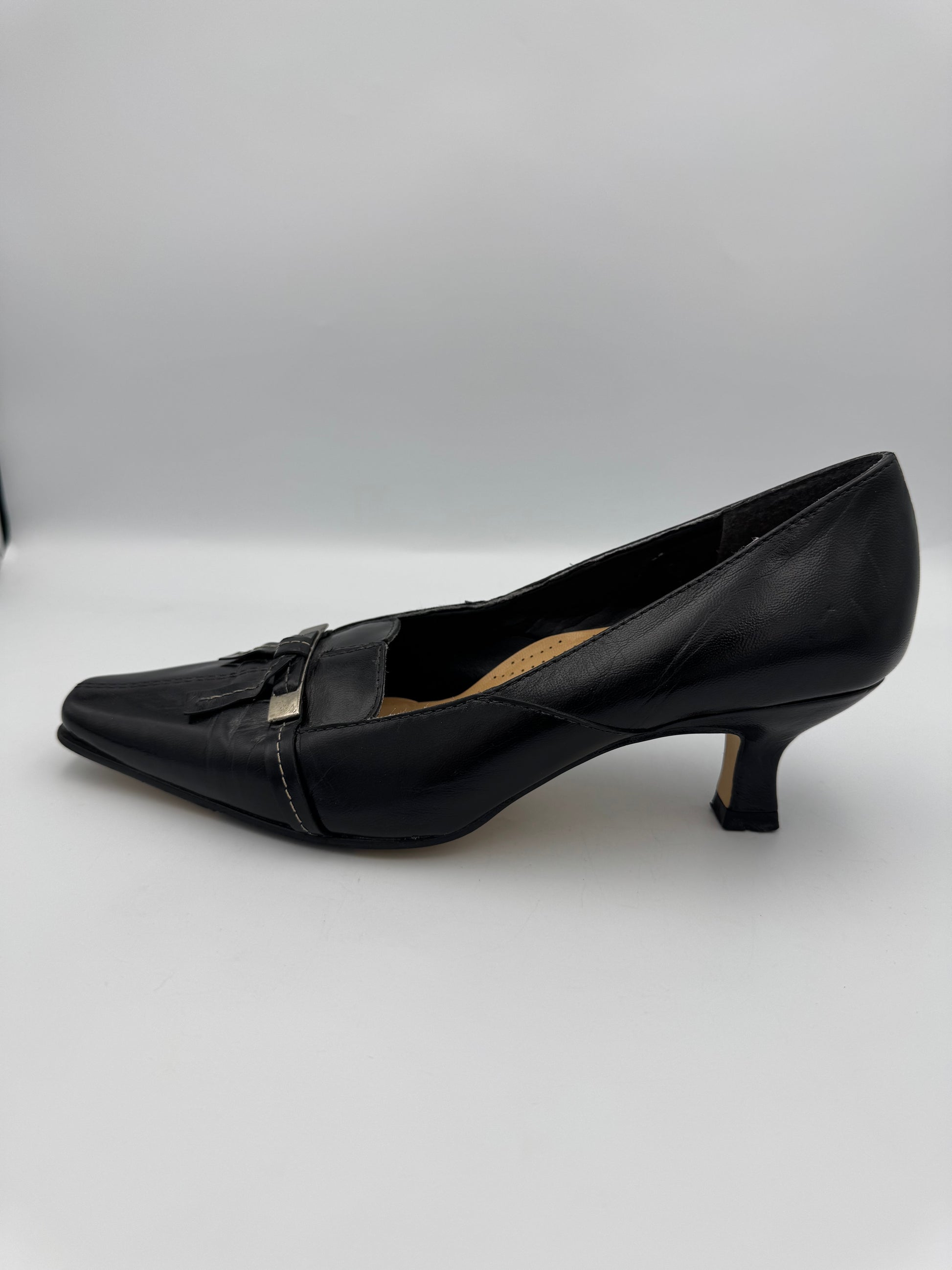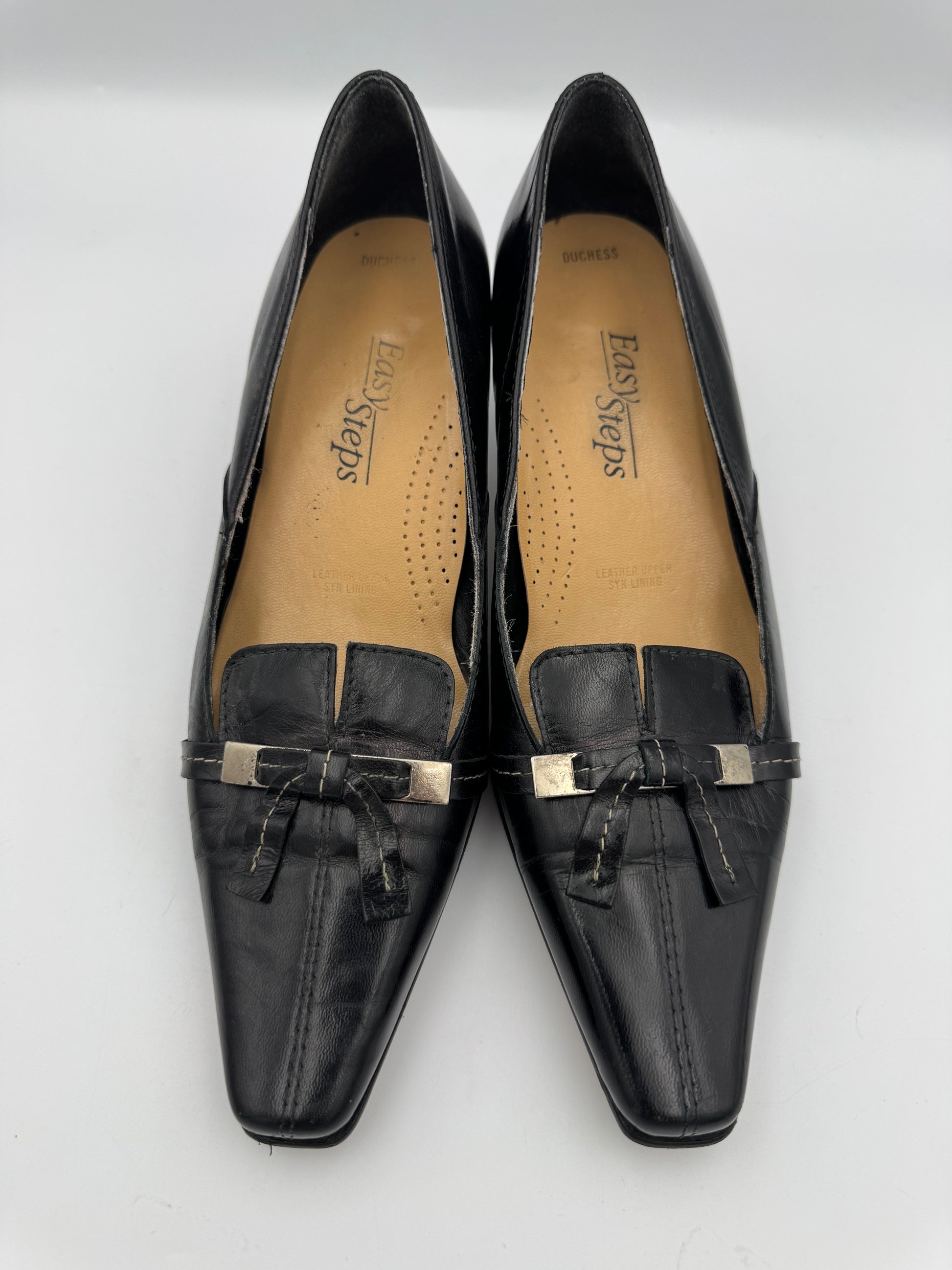 A vintage Duchess from Easy Steps are flat pointed low black leather pumps, featuring sliver hardware and bow accents.