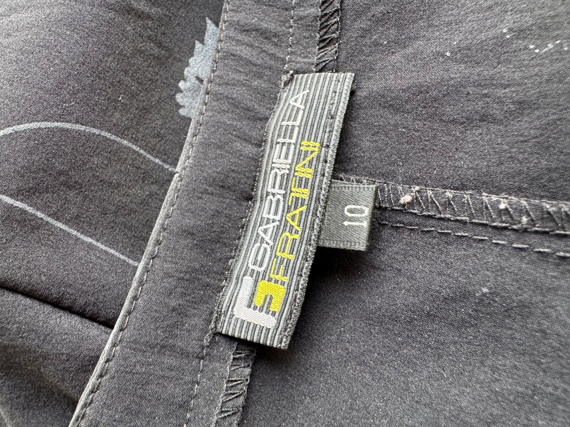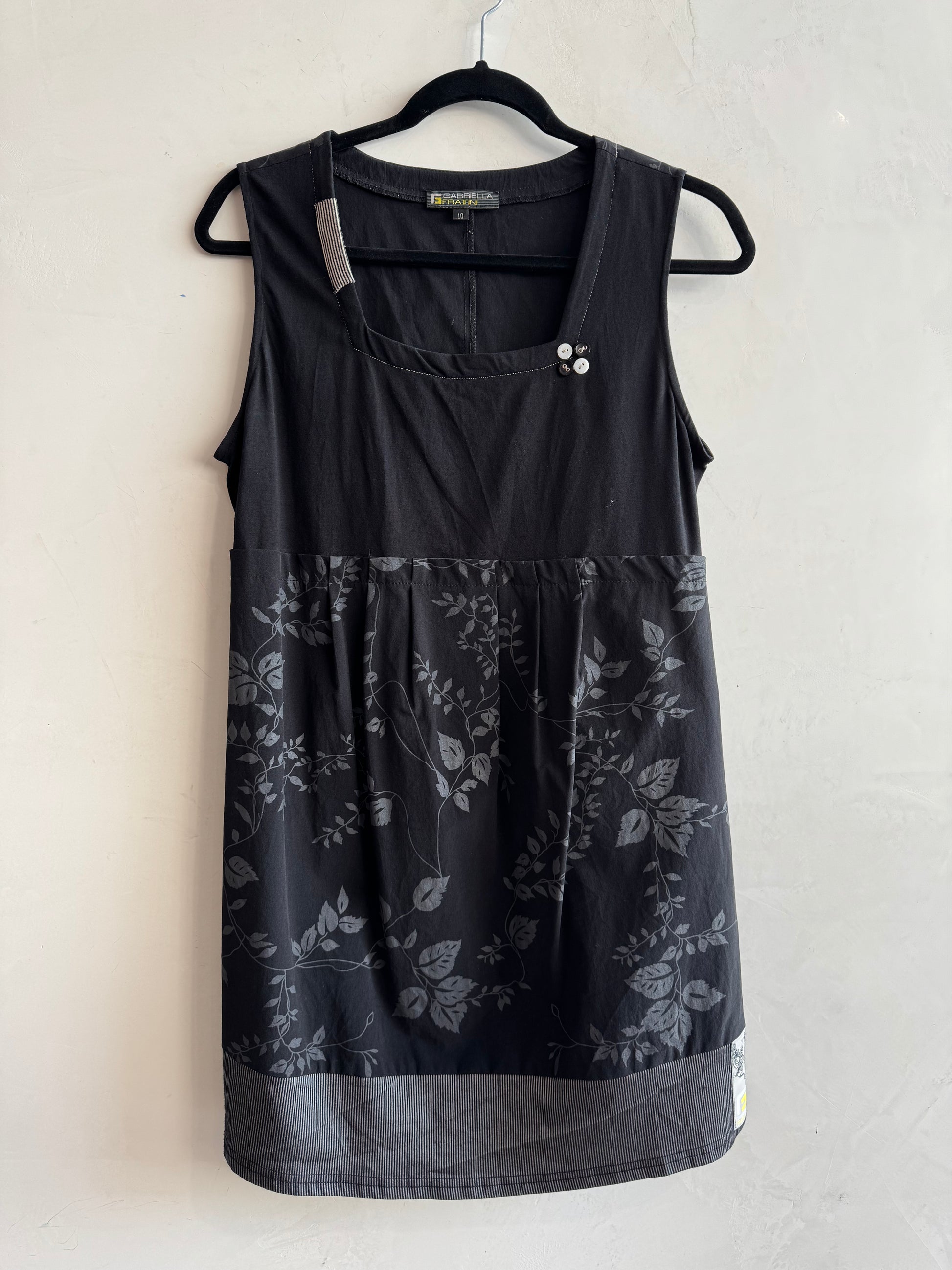 Vintage black dress from Gabriella Fratini, has small button detail and patterned balloon skirt with a shipped accent at the hem.