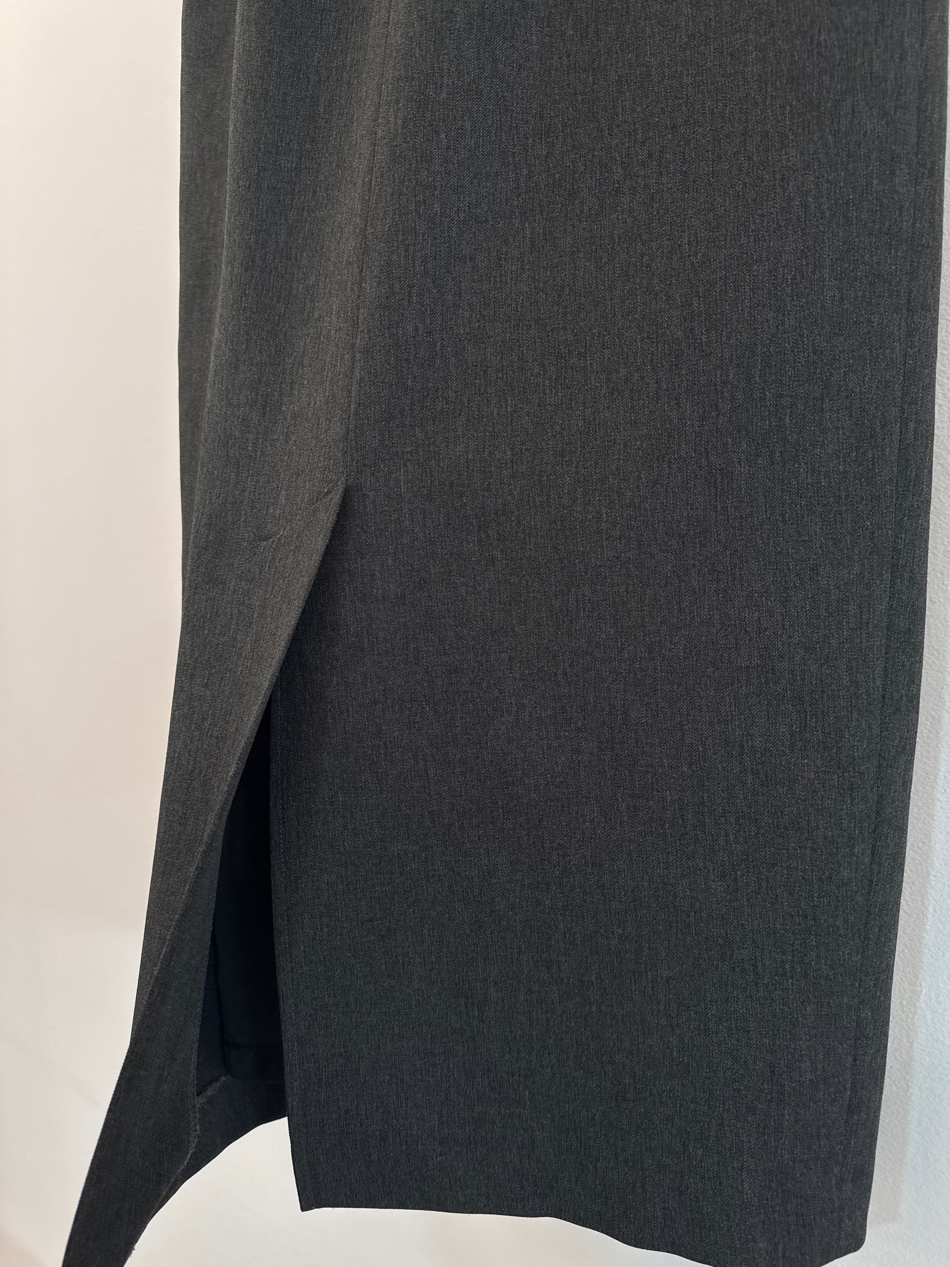 Vintage grey Paolini skirt. Marked size 8, suits XS-S. Features split in the back, high waist, zipper fastening and grey lining.