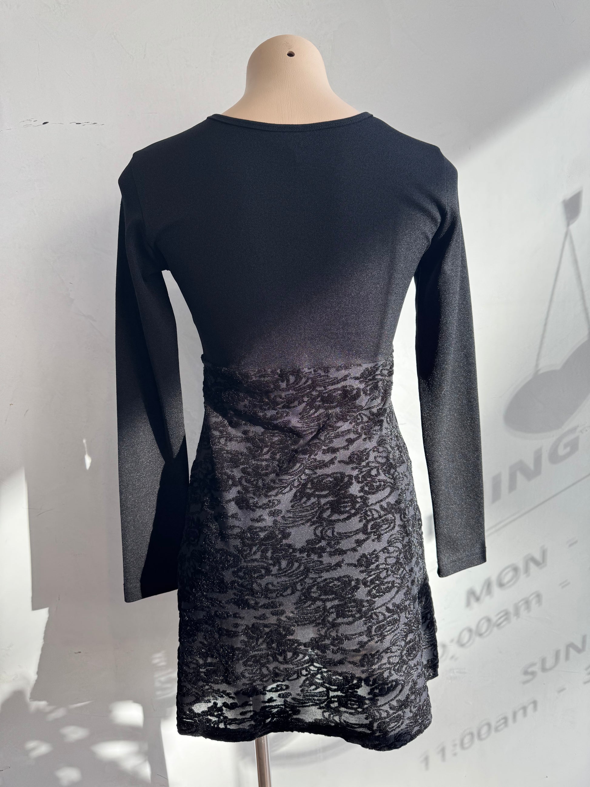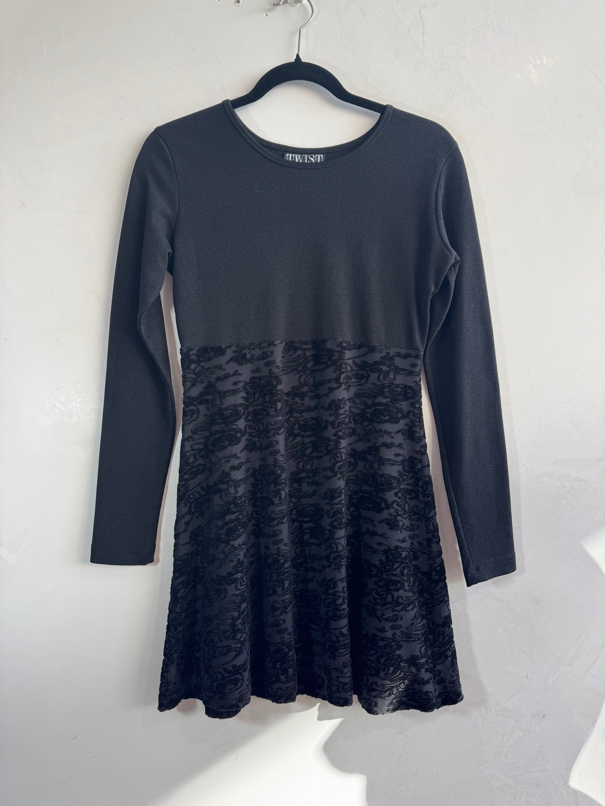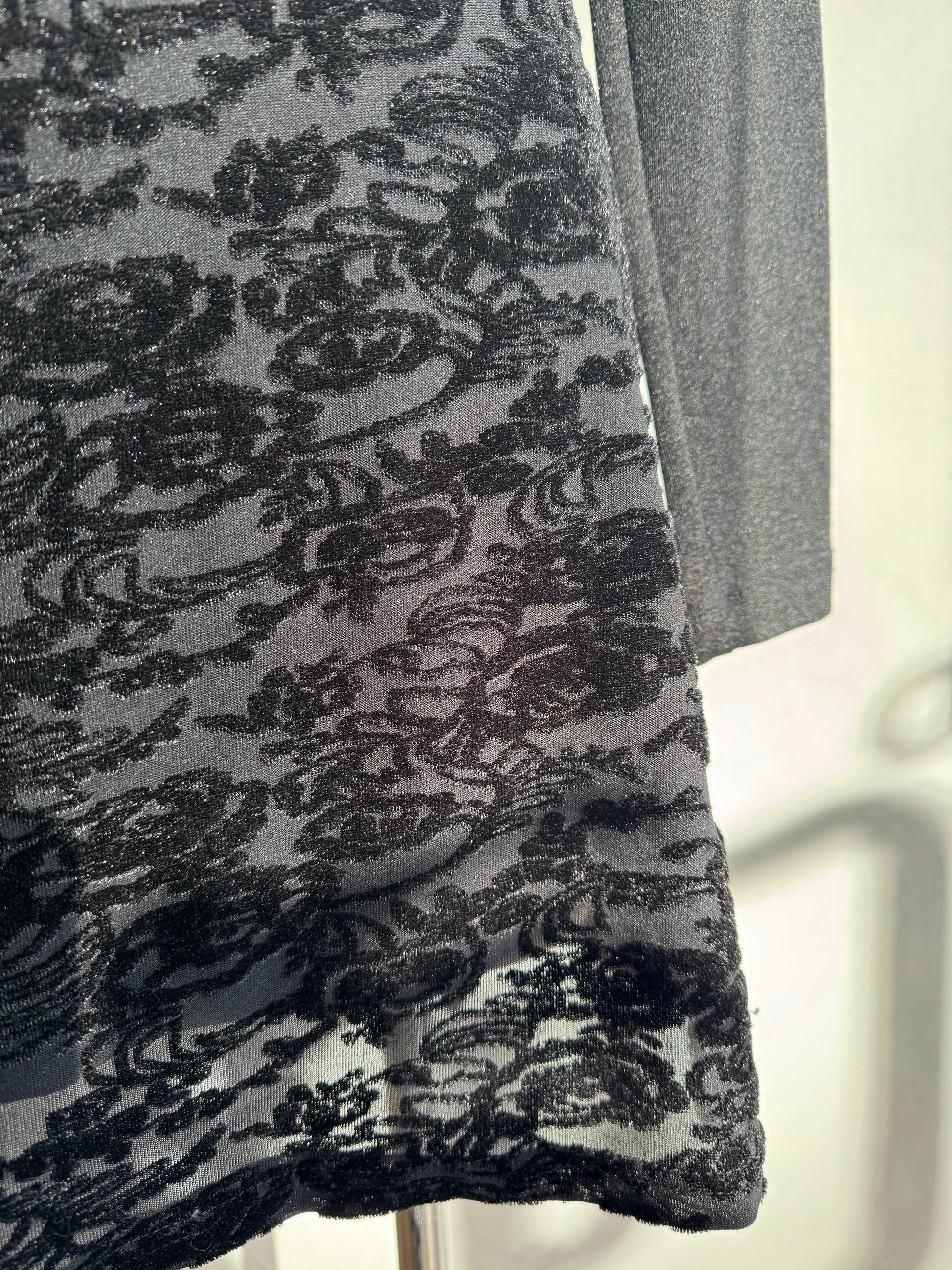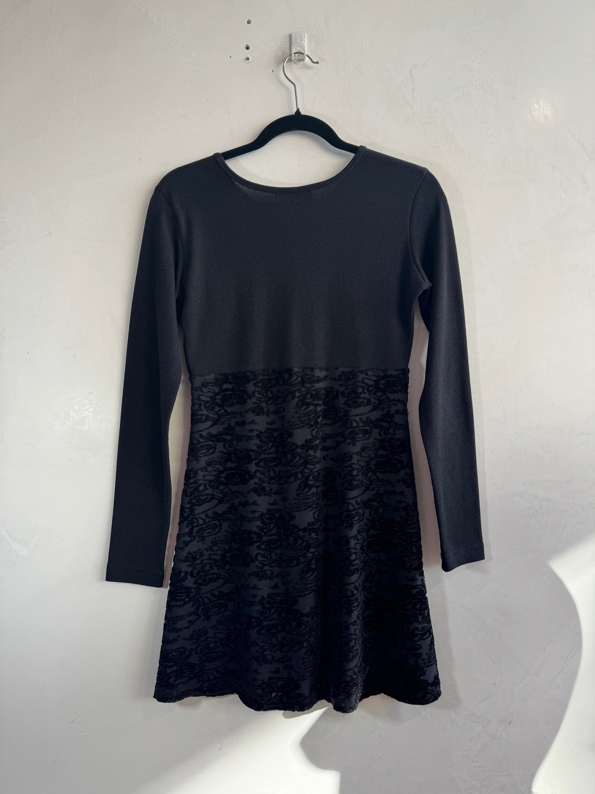 Vintage long sleeve little black dress with velvet patterned skirt.