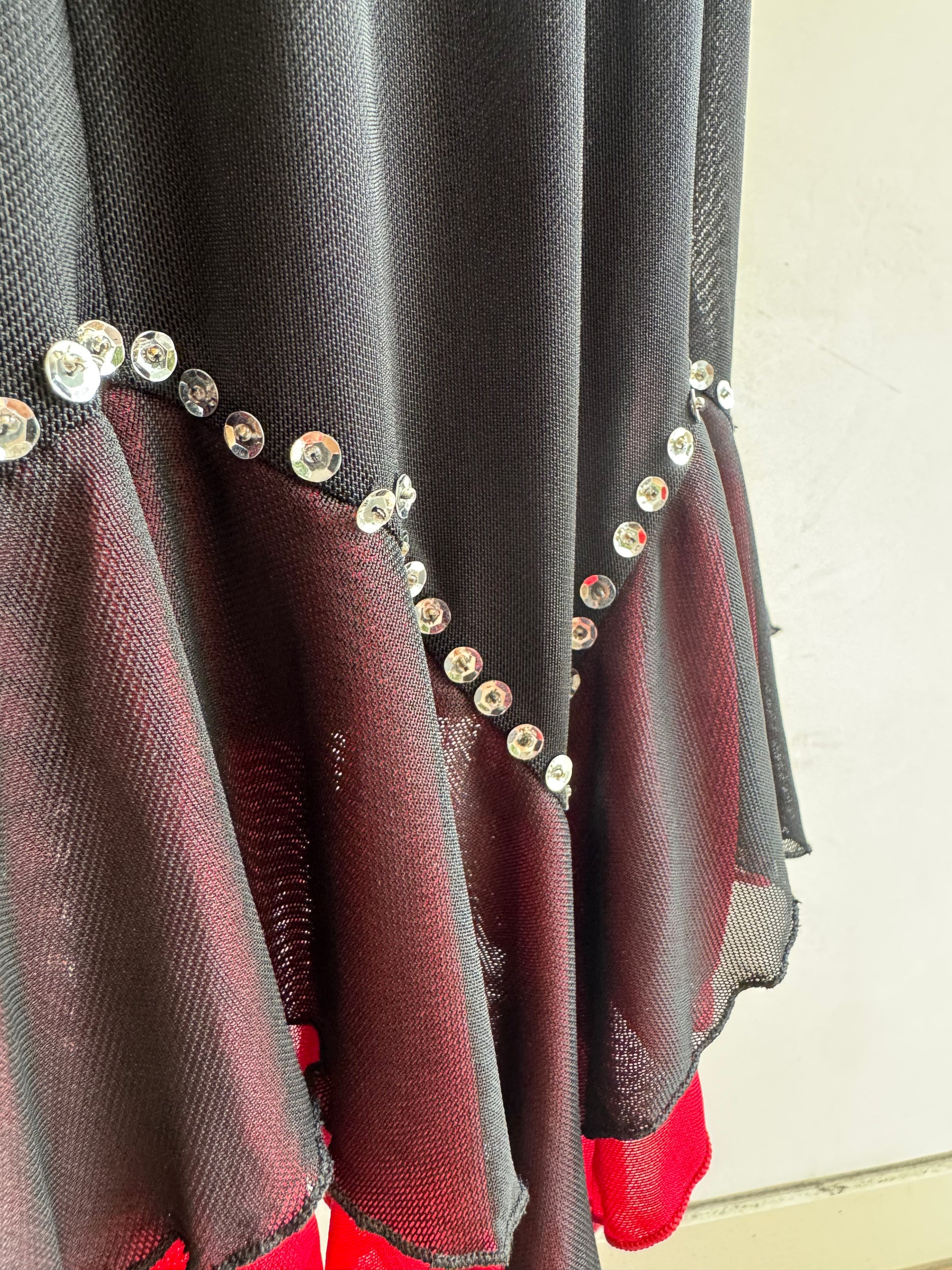 Mesh skirt with lining from Viola. Features red trim and silver colour sequins. Has an elastic waistband.