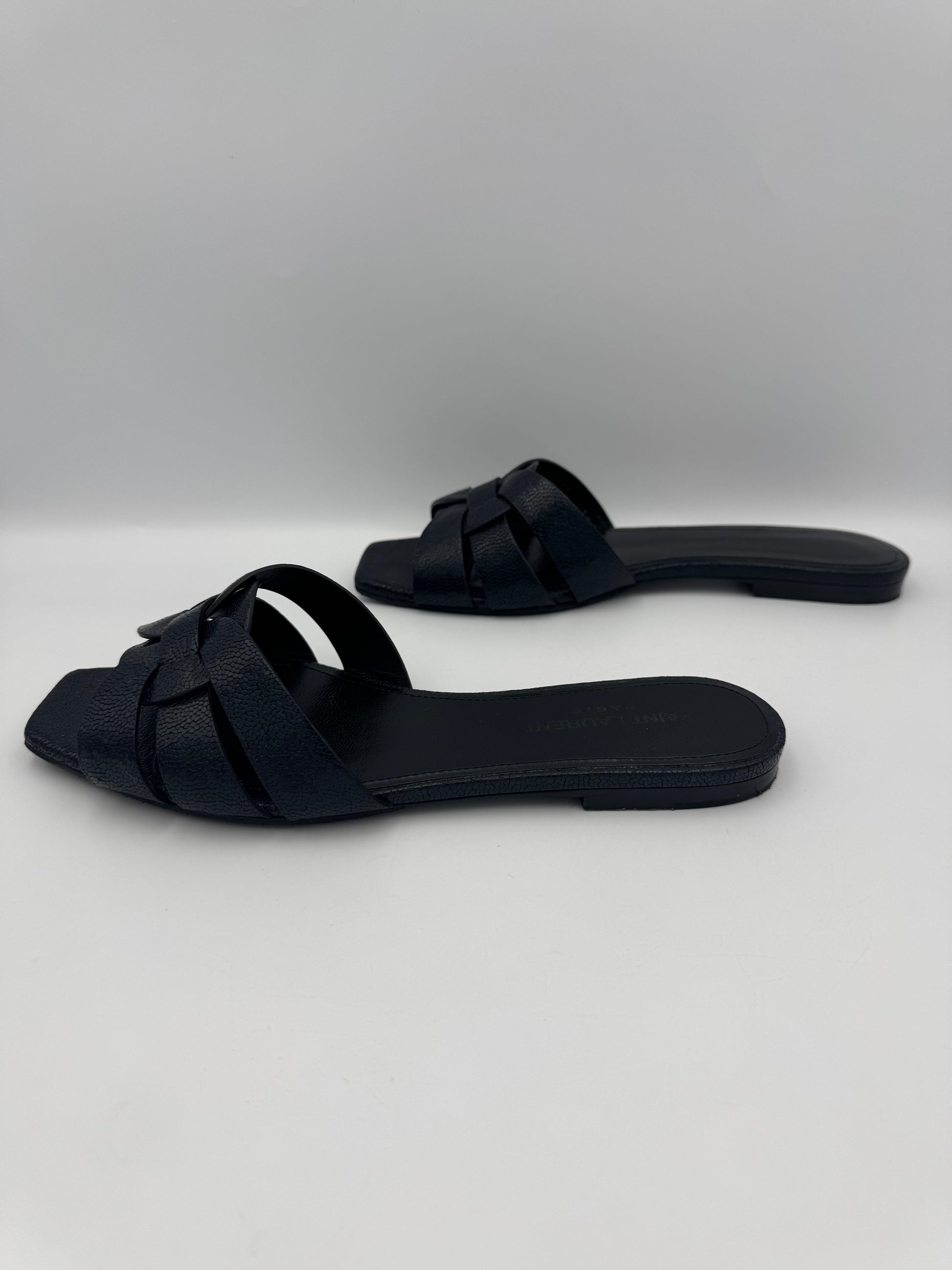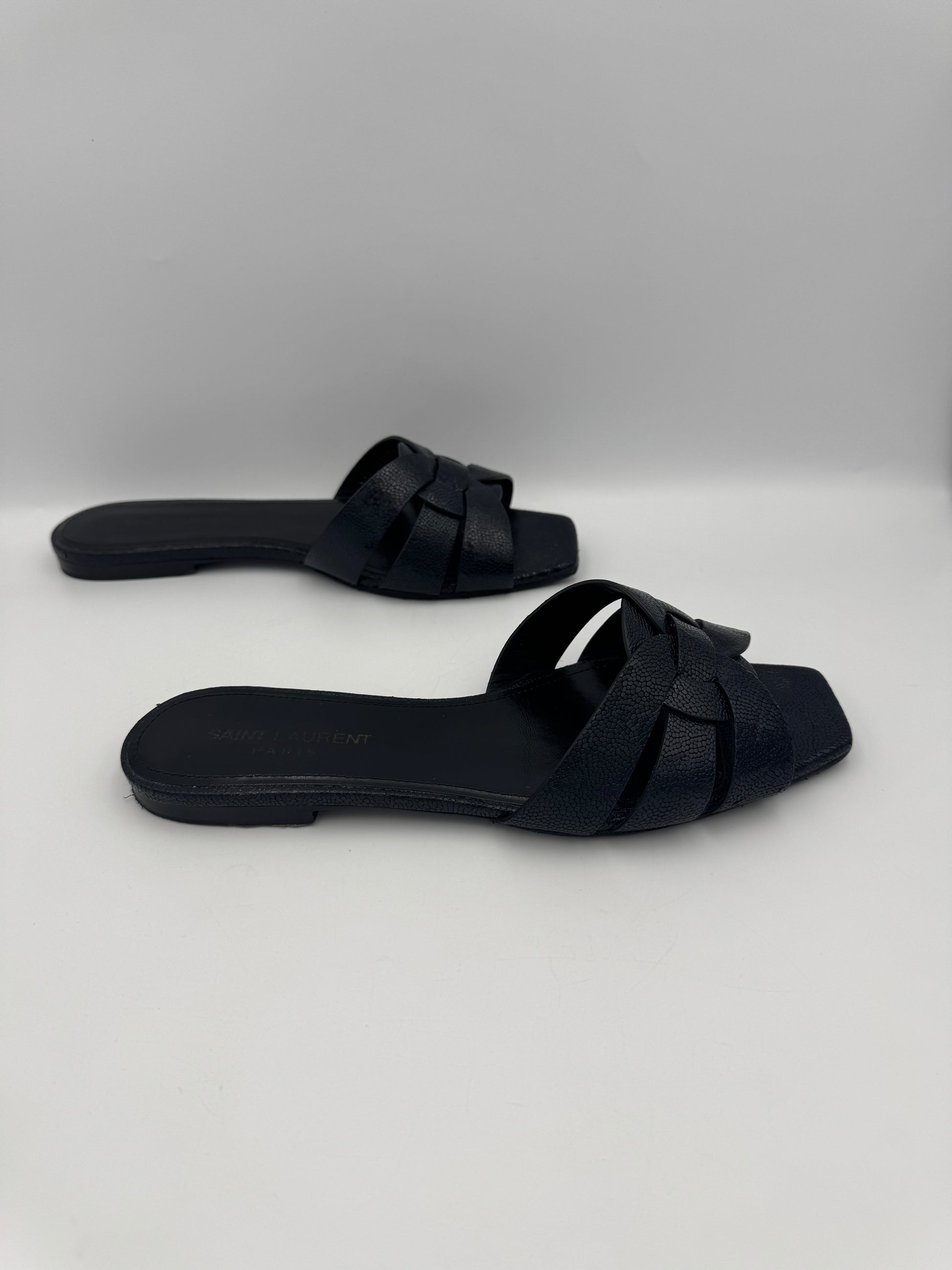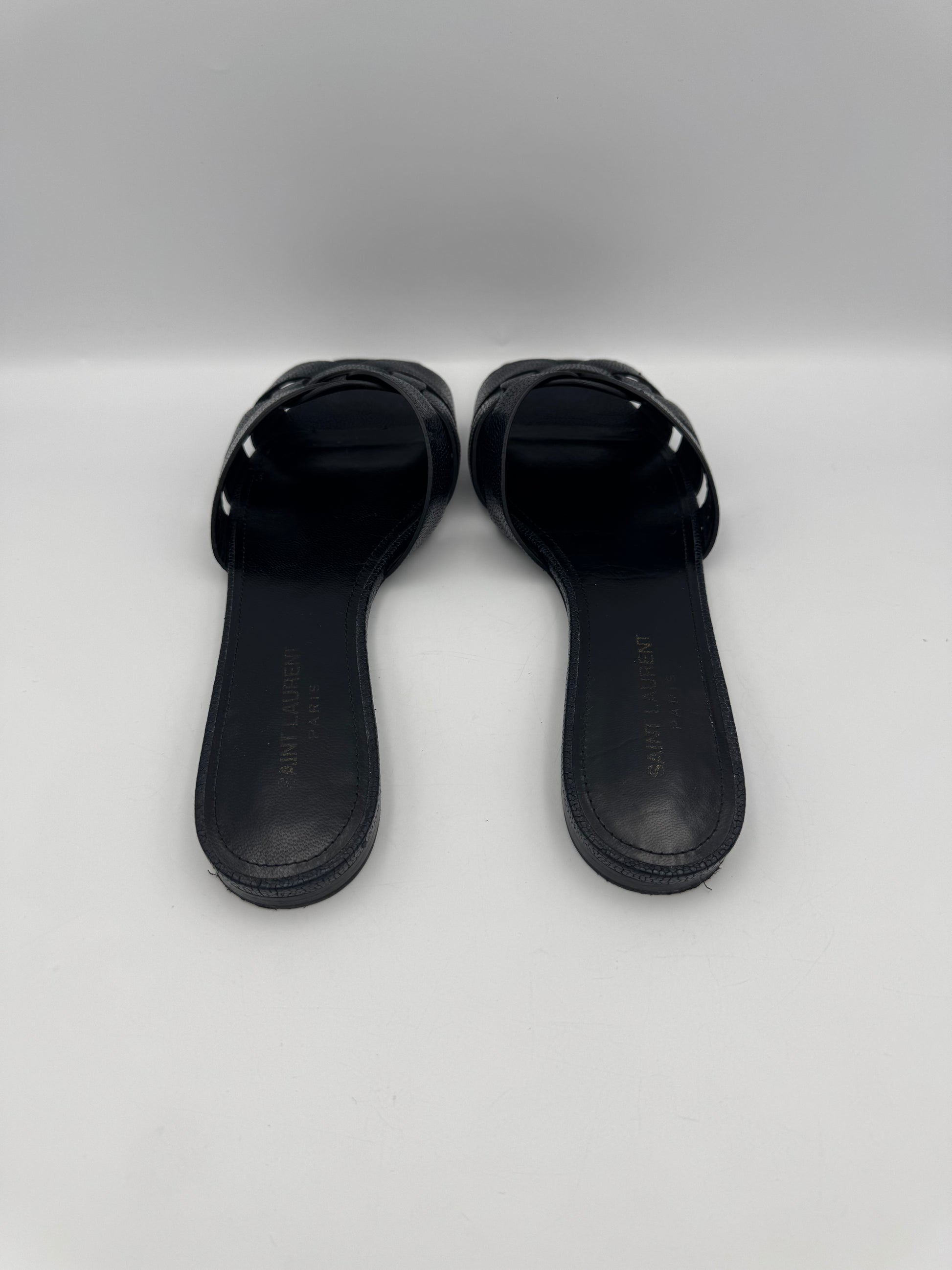 Yves Saint Laurent Tribute Dark Navy Pebbled Leather Slides in size 37.5