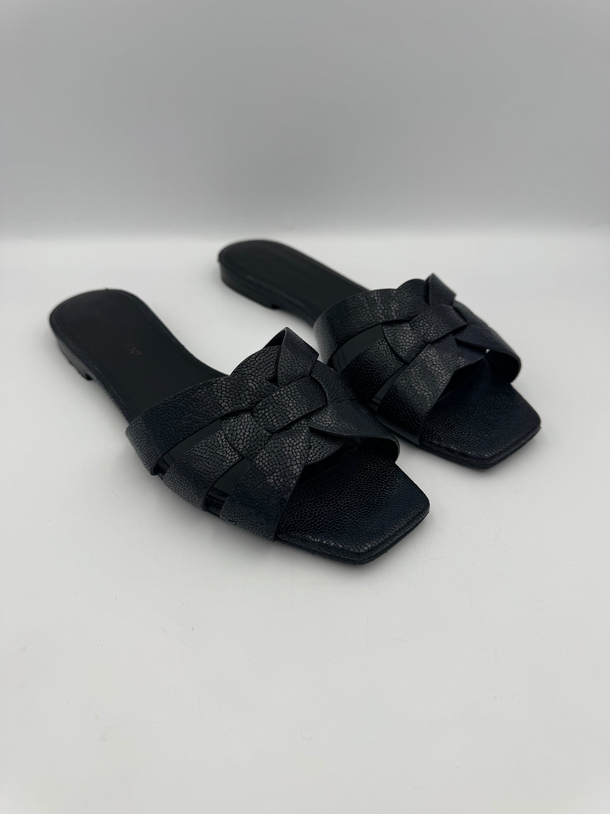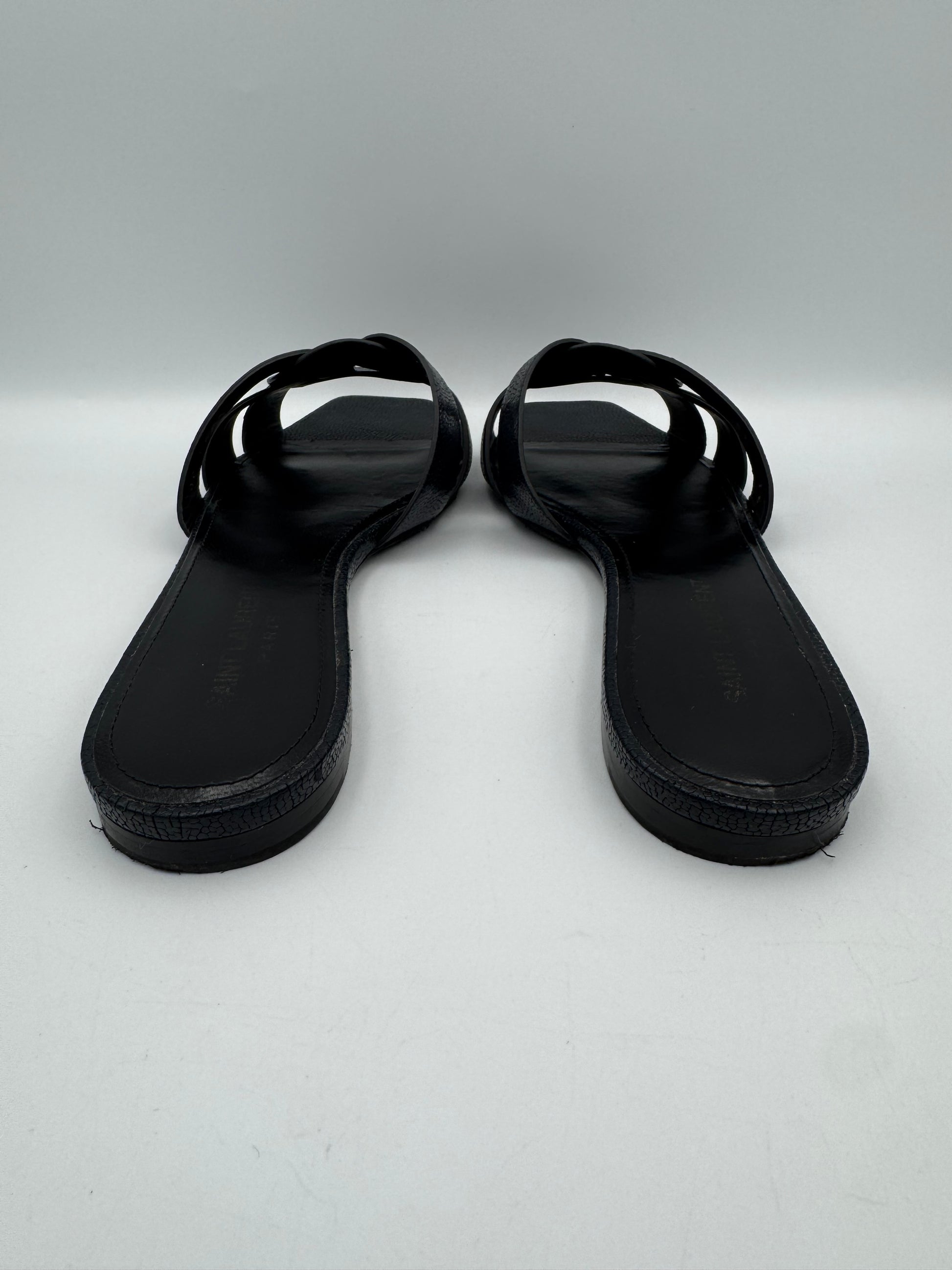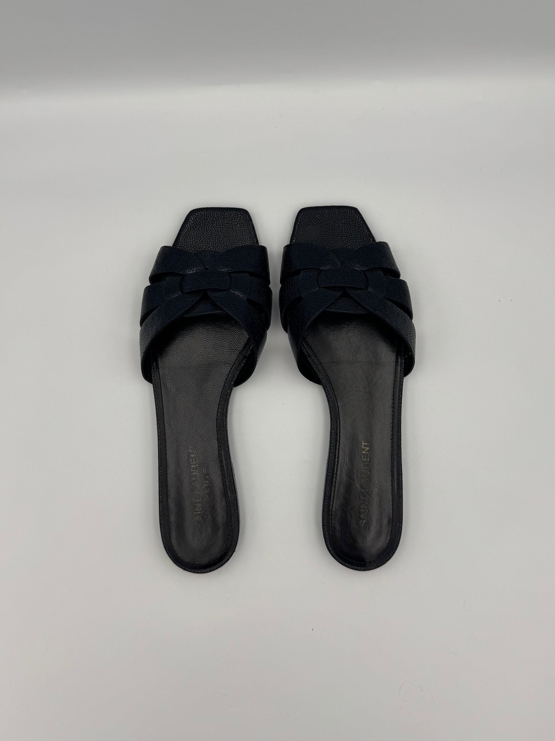 Yves Saint Laurent Tribute Dark Navy Pebbled Leather Slides in size 37.5