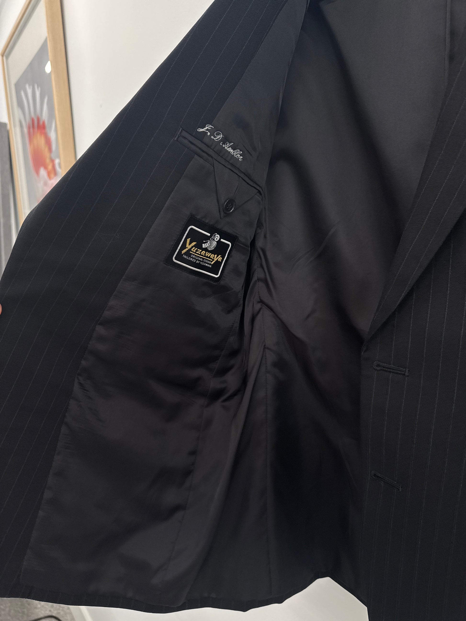 Black YUZAWAYA blazer with blue pinstripes. Size M/L depending on desired fit. In great vintage condition, no notable marks or faults.